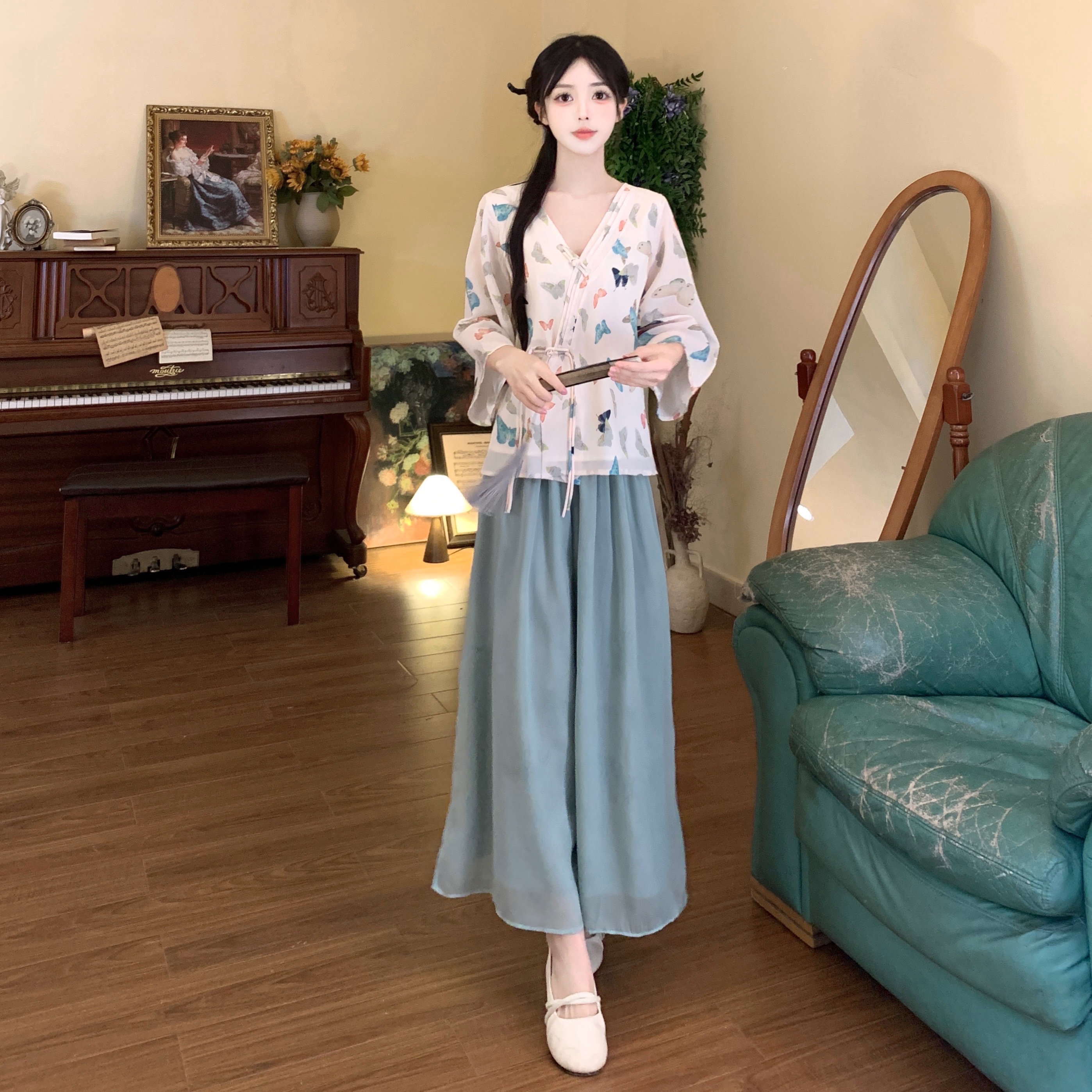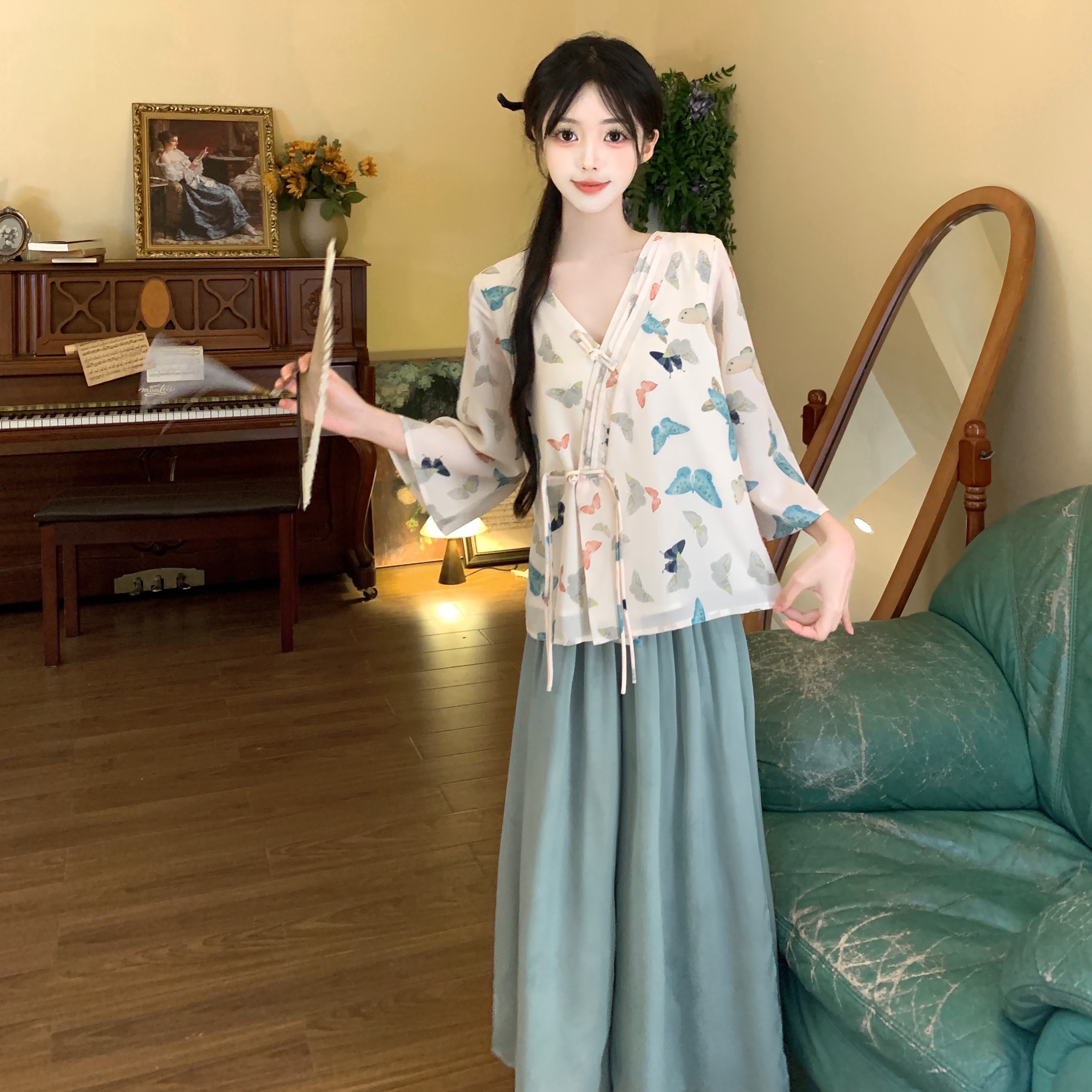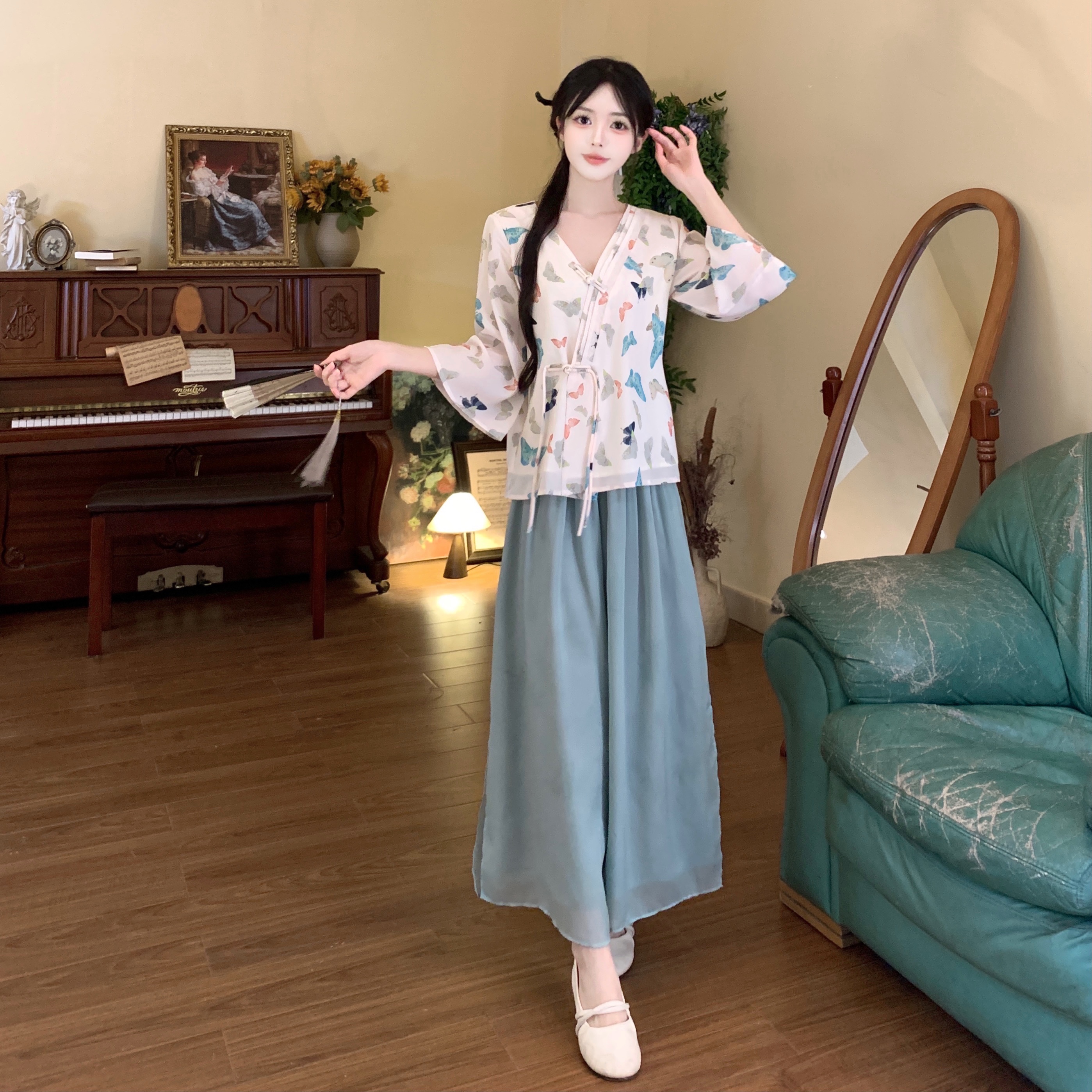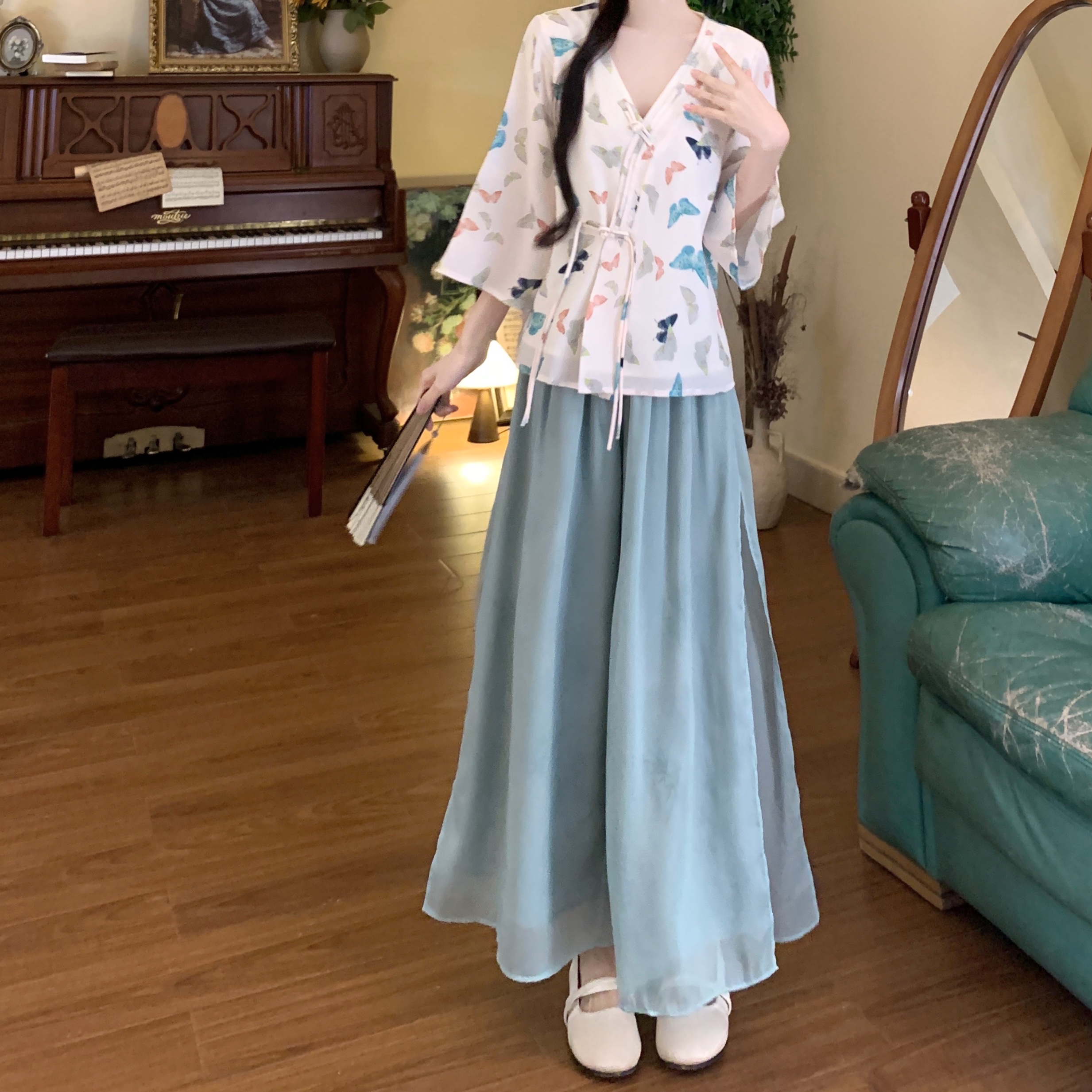 실사 봄 여름 새로운 새로운 중식 한 요소 젠 국풍 세트 맨위 와이드 레그 팬츠 치마 착용 가져 가라. 투피스 세트