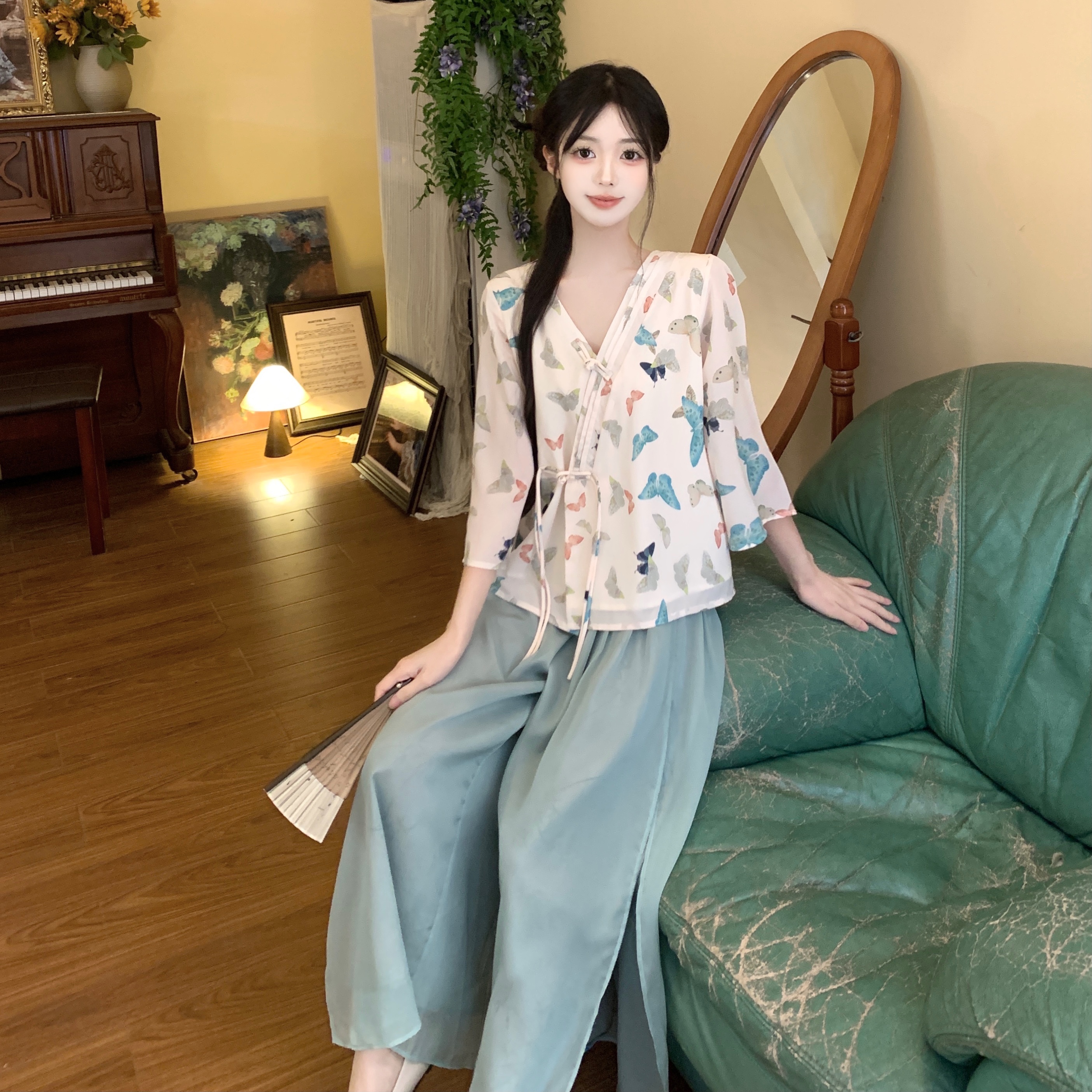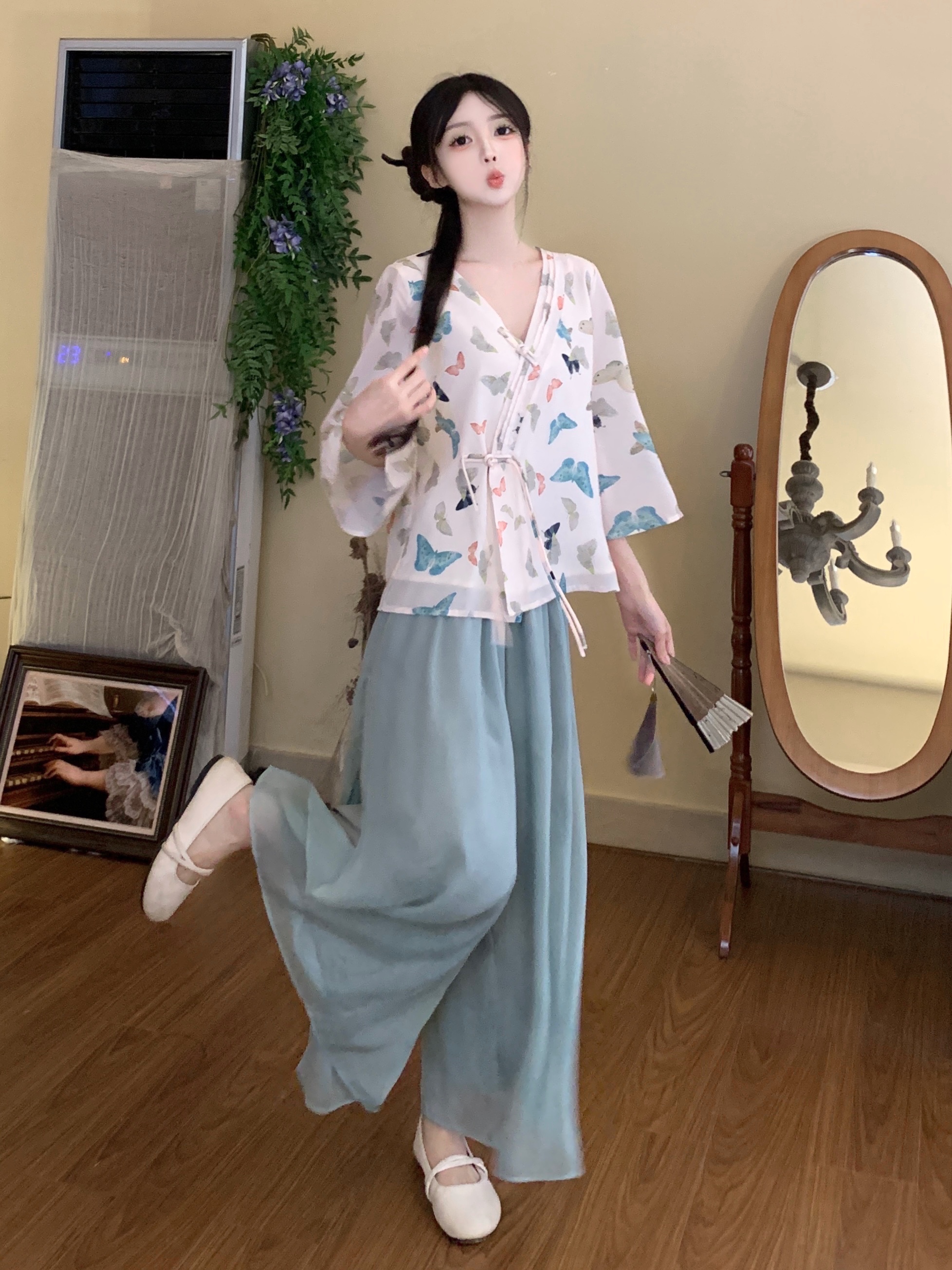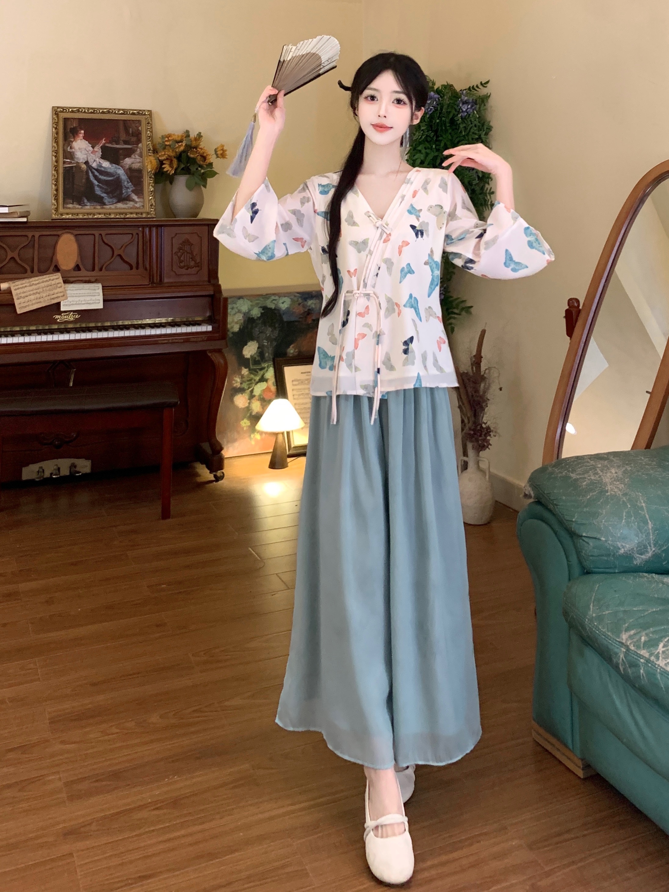 실사 봄 여름 새로운 새로운 중식 한 요소 젠 국풍 세트 맨위 와이드 레그 팬츠 치마 착용 가져 가라. 투피스 세트