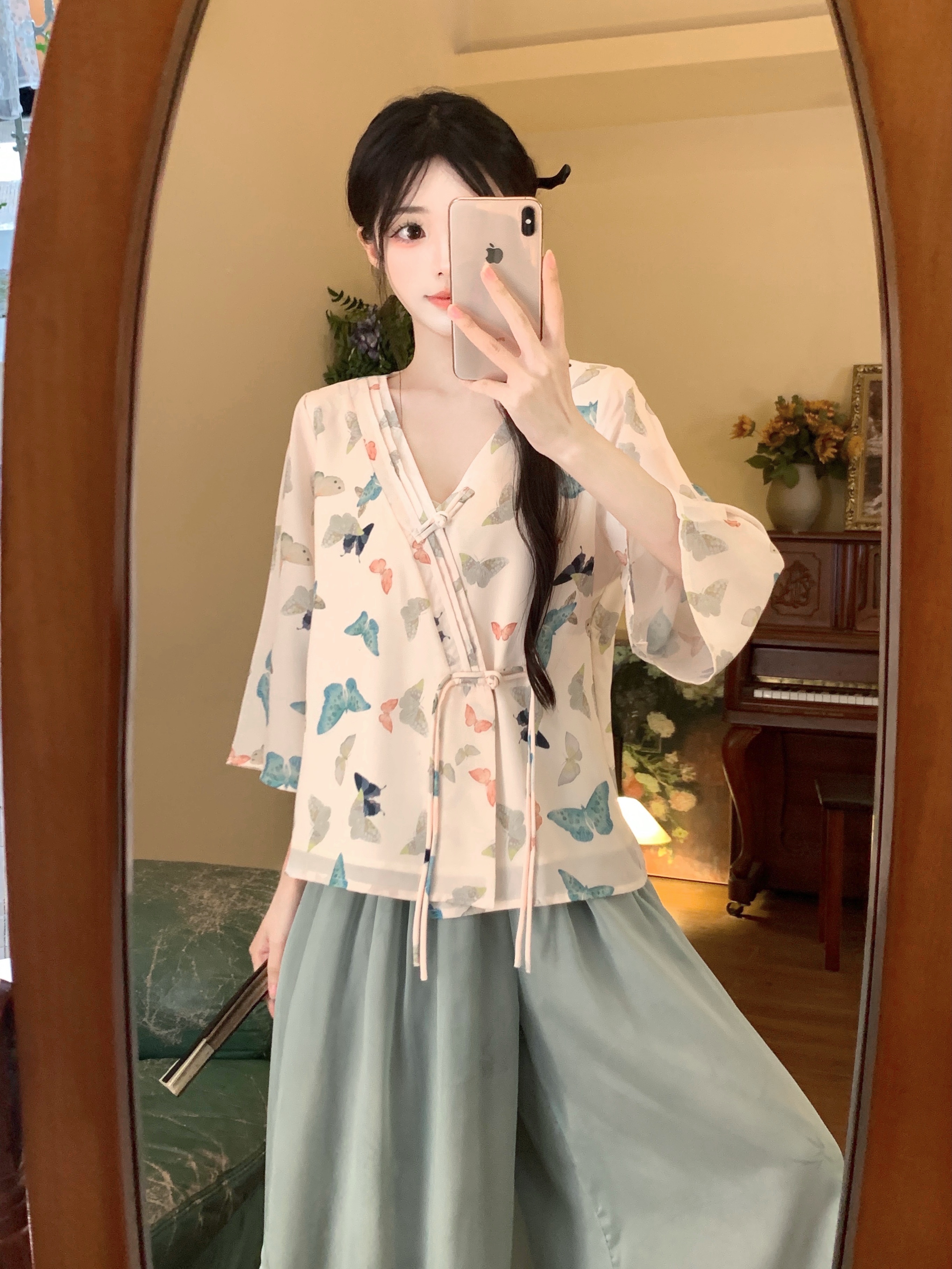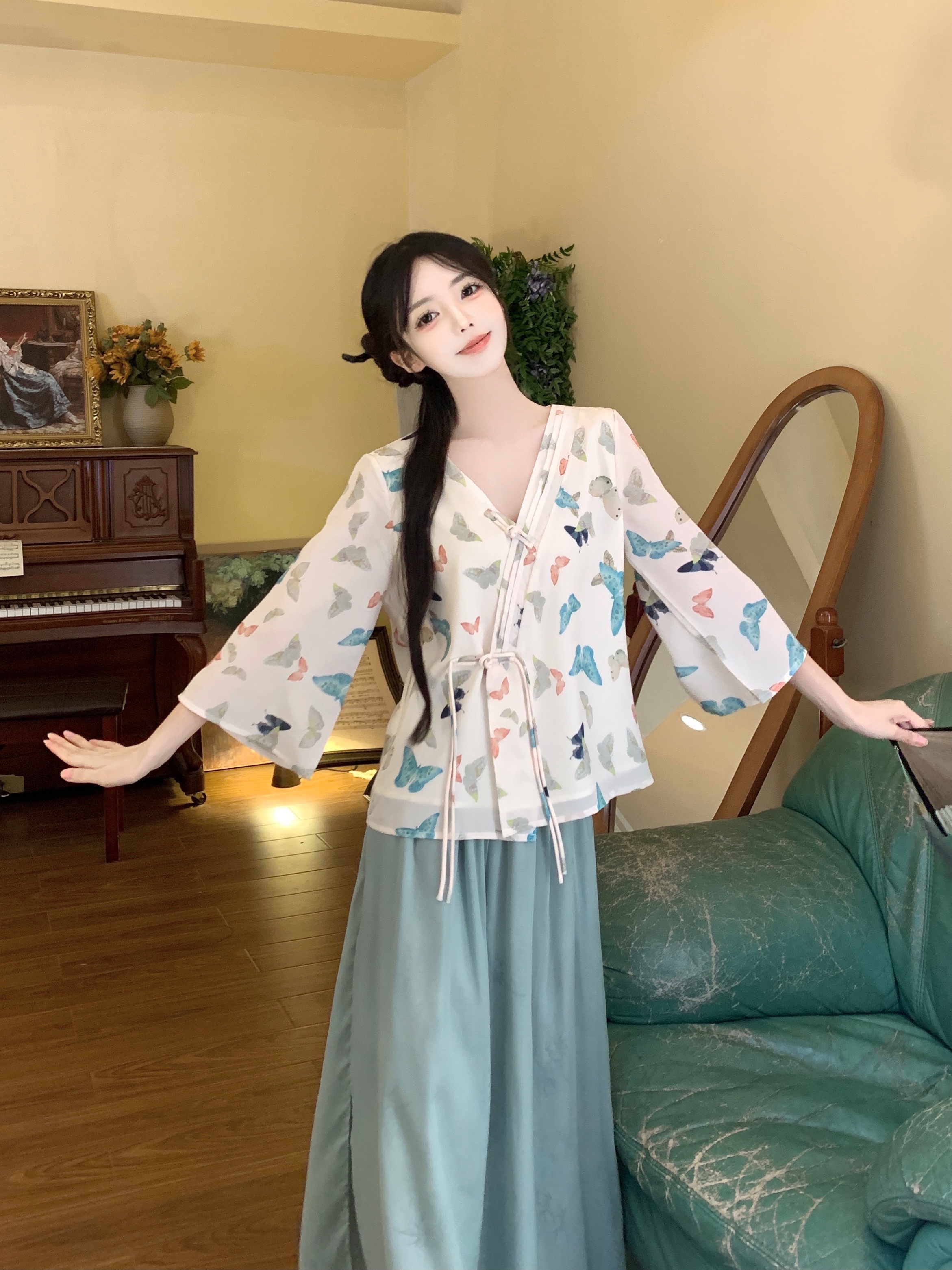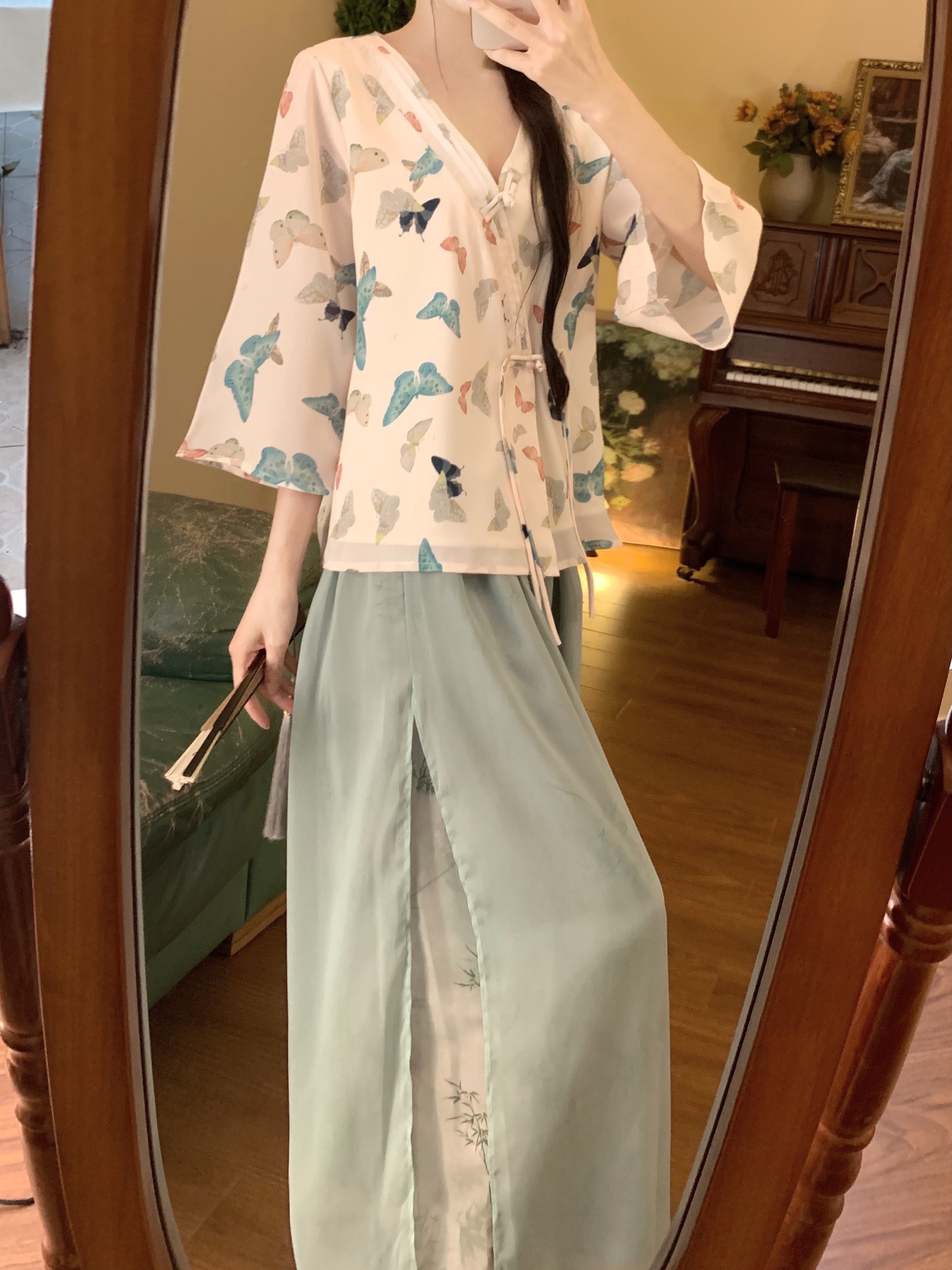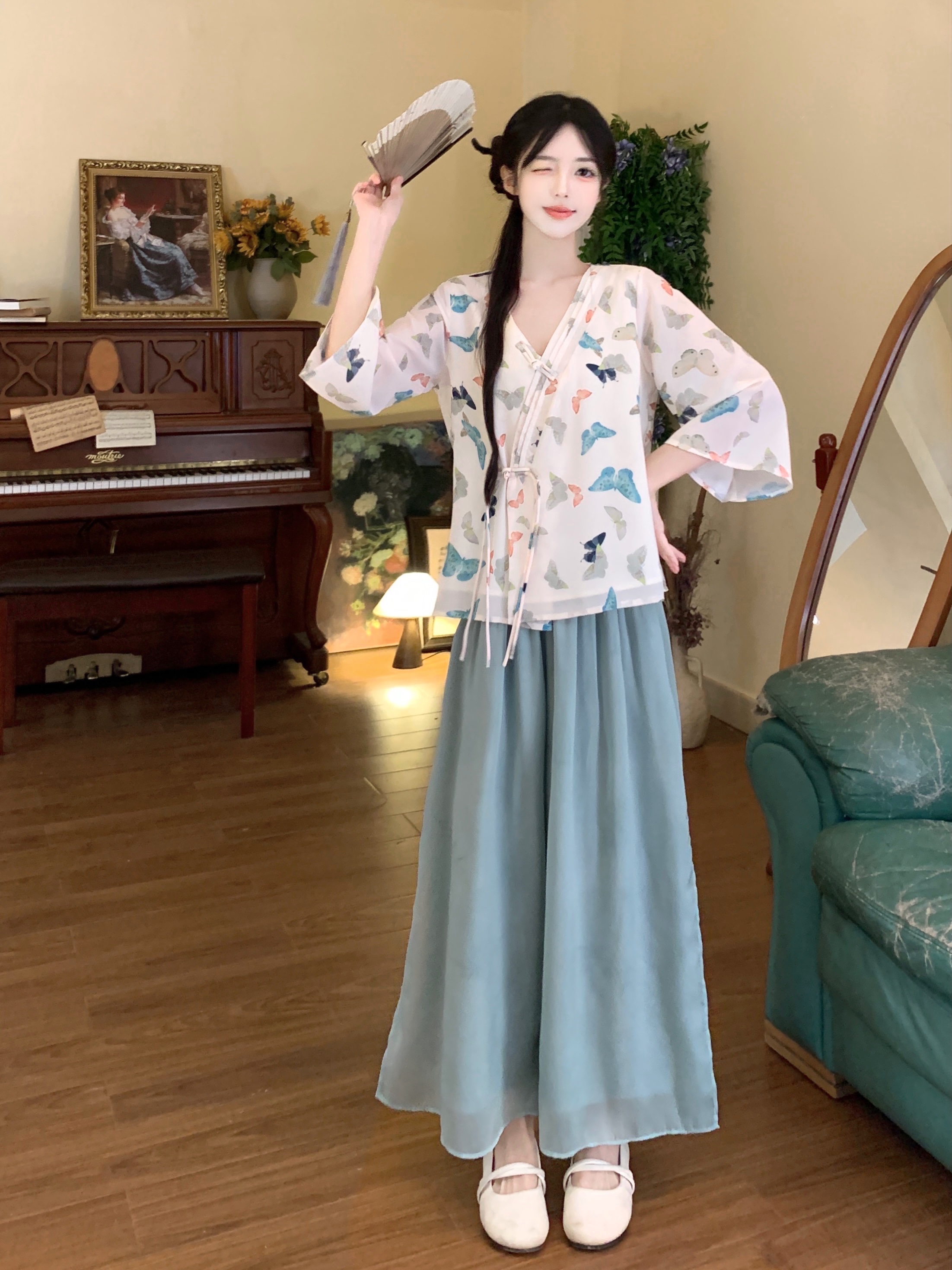 실사 봄 여름 새로운 새로운 중식 한 요소 젠 국풍 세트 맨위 와이드 레그 팬츠 치마 착용 가져 가라. 투피스 세트