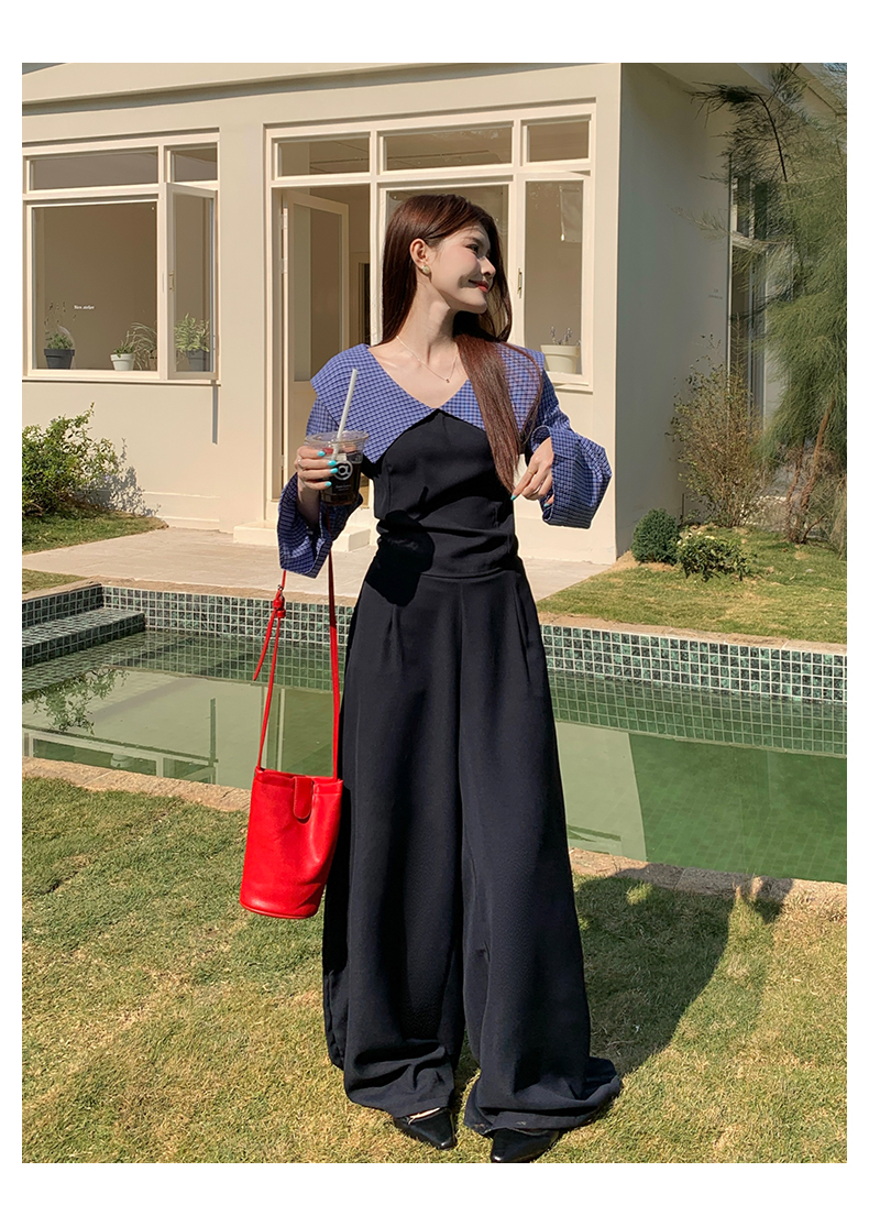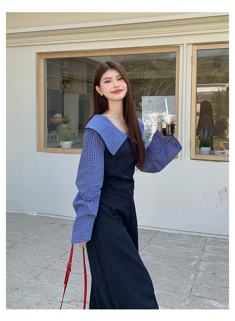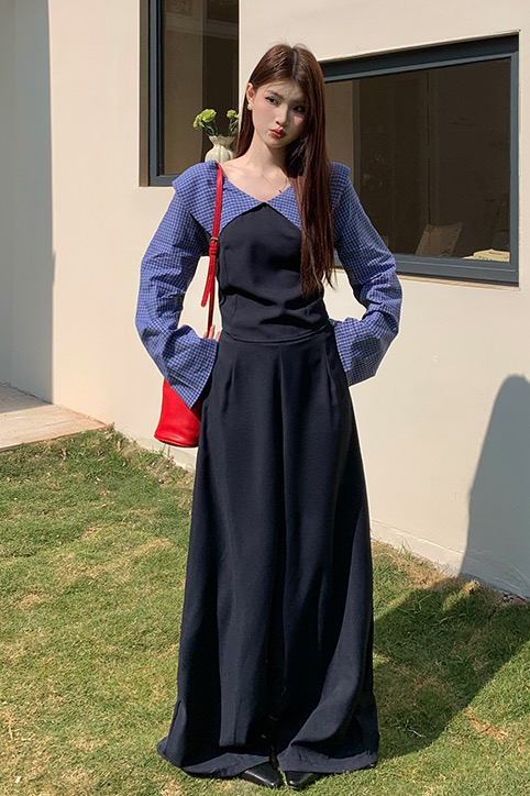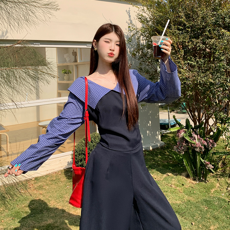 빅 사이즈 여성 의류 봄 세트 체크무늬 패치워크 슬림해 보이는 투피스 세트 빅 사이즈 패션 세트