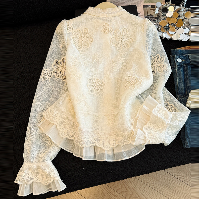 품격 레이스 레이스 비즈 박기 자수 긴팔 여성 셔츠 2025 이른 가을 새로운 외국 가스 달콤함 기본 셔츠 맨위