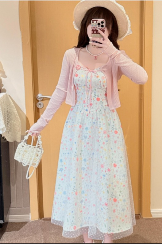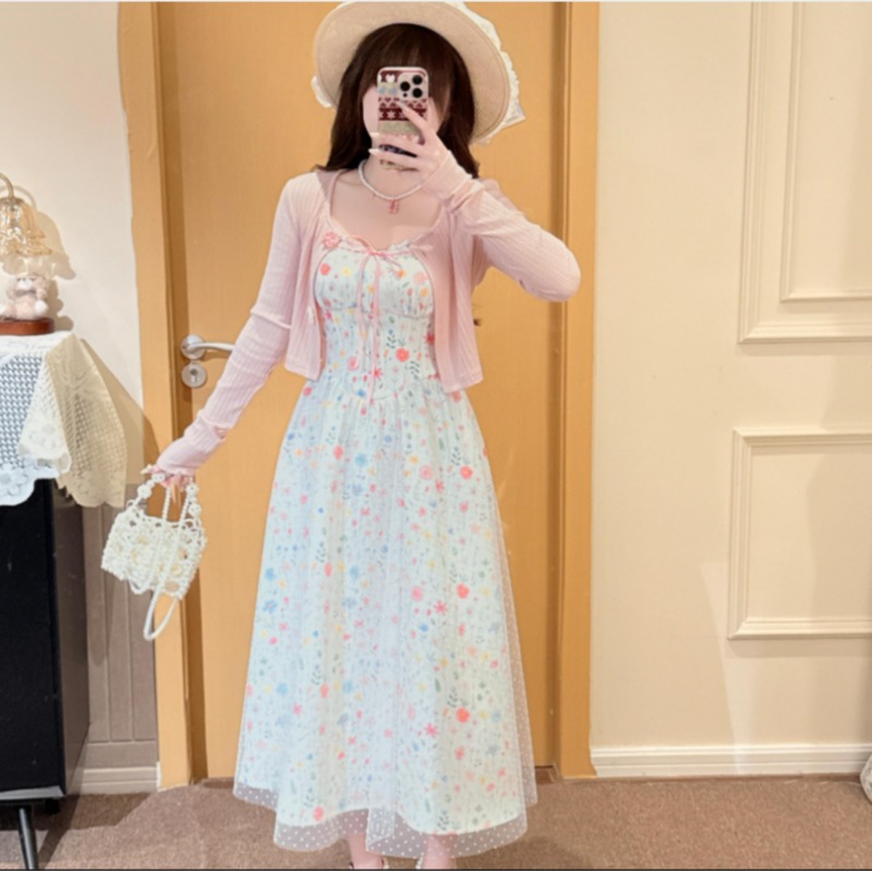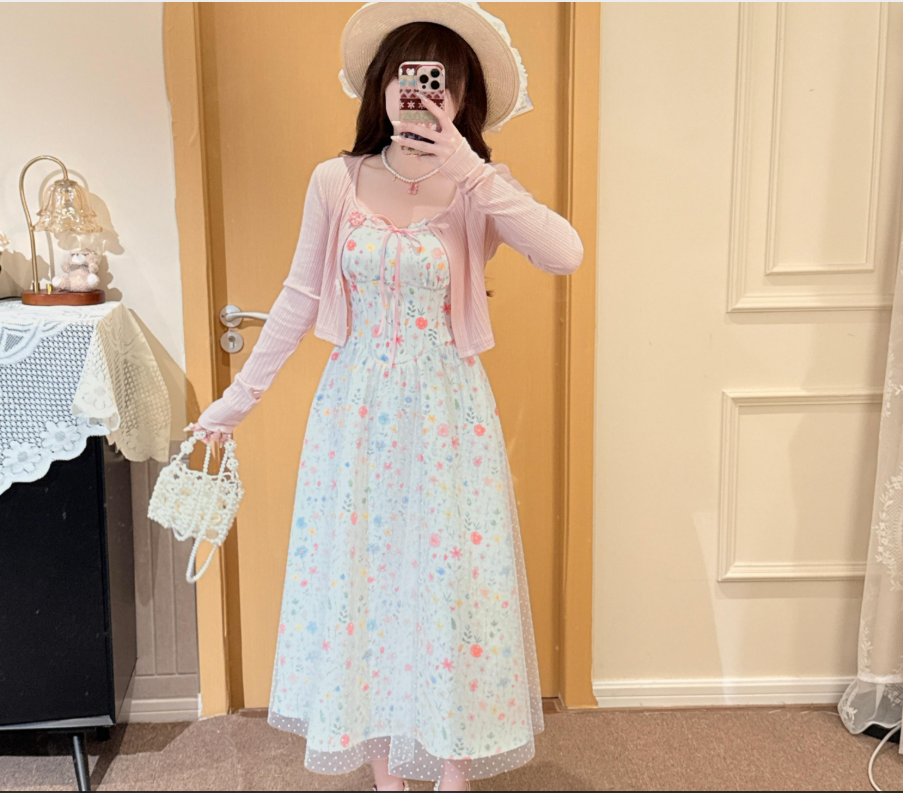 빅 사이즈 여성 의류 지방 mm 살구 색상 전원 바람 달콤함 작은 꽃무늬 프랑스식 레이스 슬립 드레스 오픈 가디건 투피스 세트