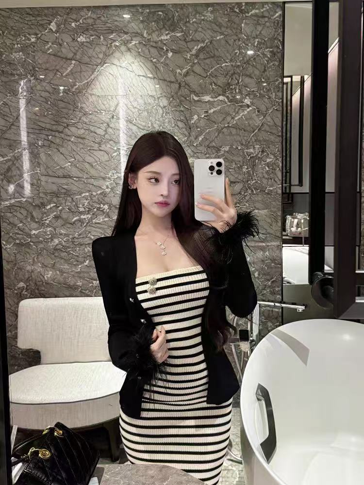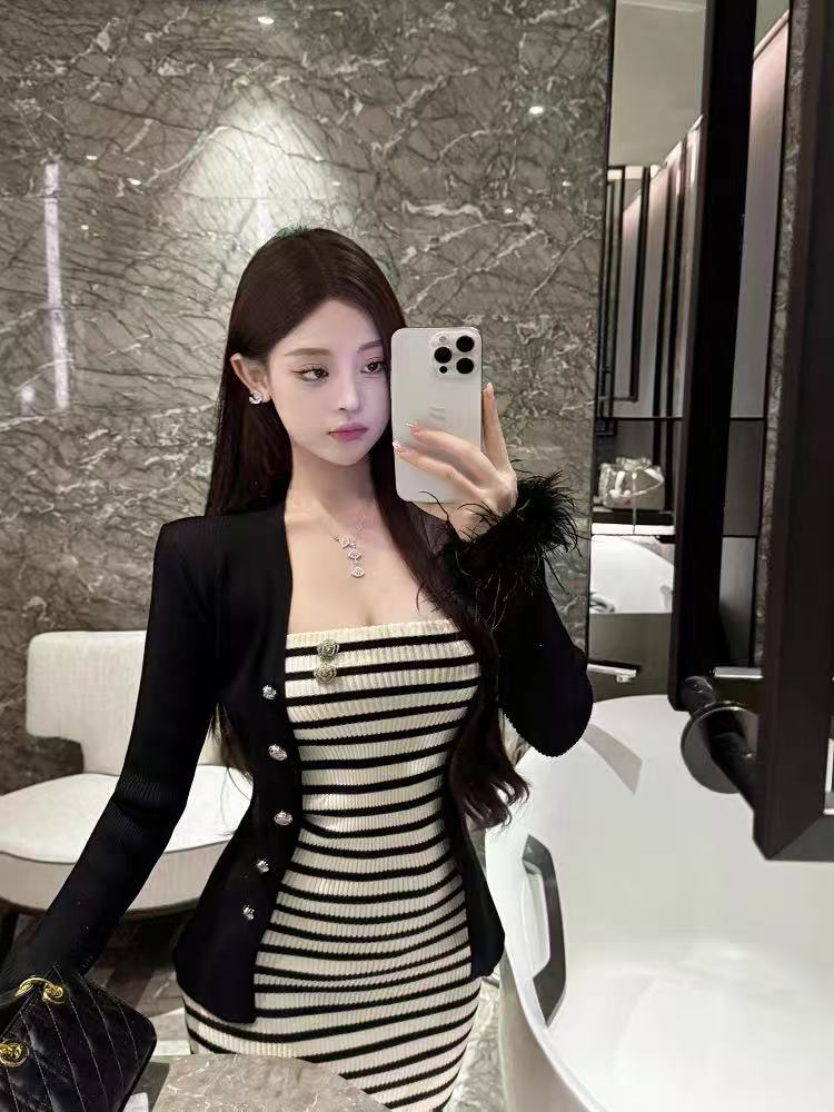 여름 새로운 핫걸 니트 스트라이프 슬립 프랑스식 허리 수축 드레스 몸매 가꾸기 슬림해 보이는 섹시함 치마 롱 스커트