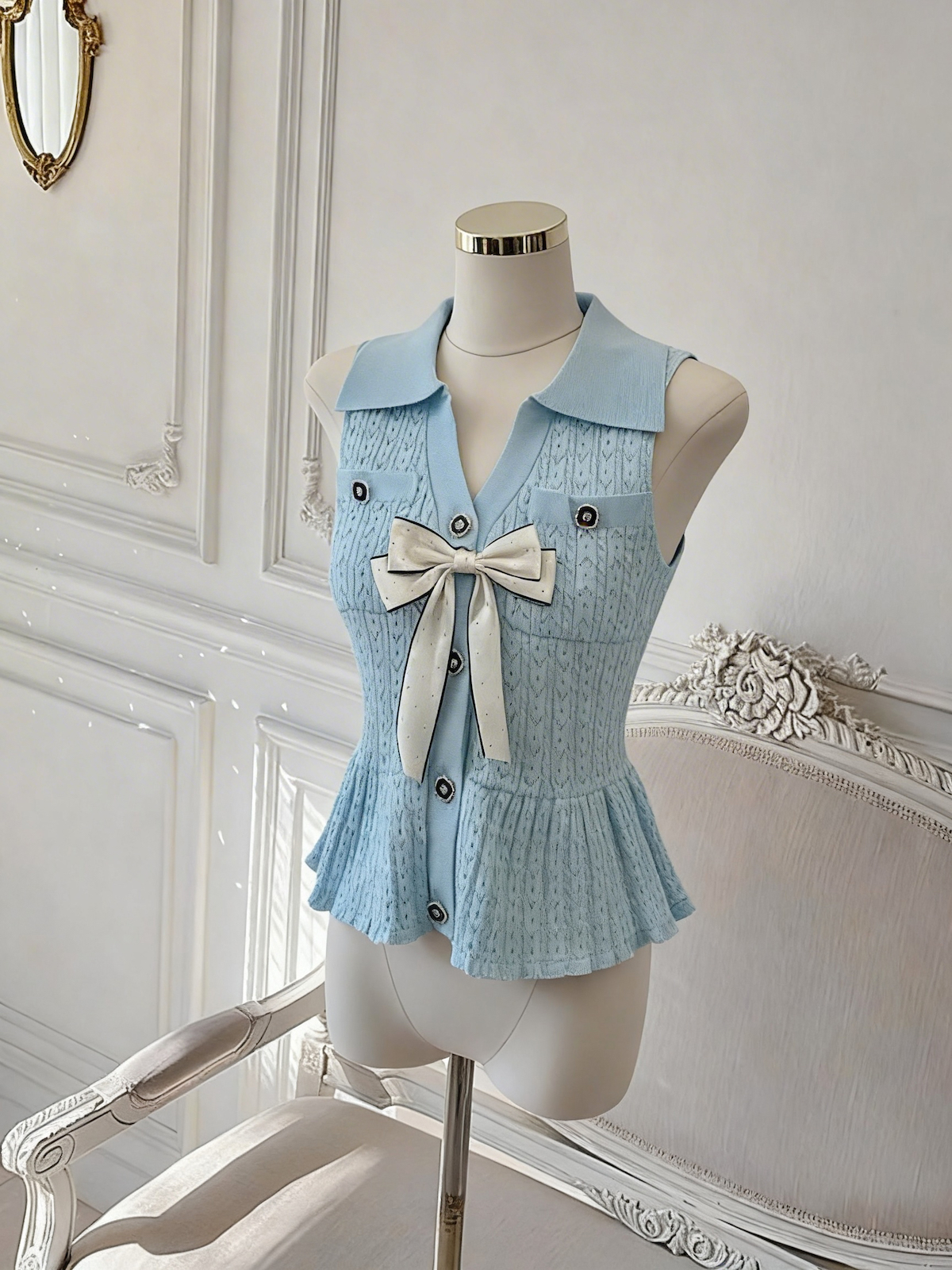 정가 있음 보호 프랑스식 나비 매듭 니트 조끼 홀로우 아웃 자수 오픈 가디건 한 부서 민소매 폴로 칼라 맨위