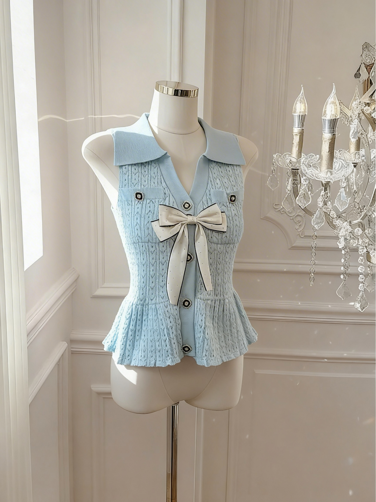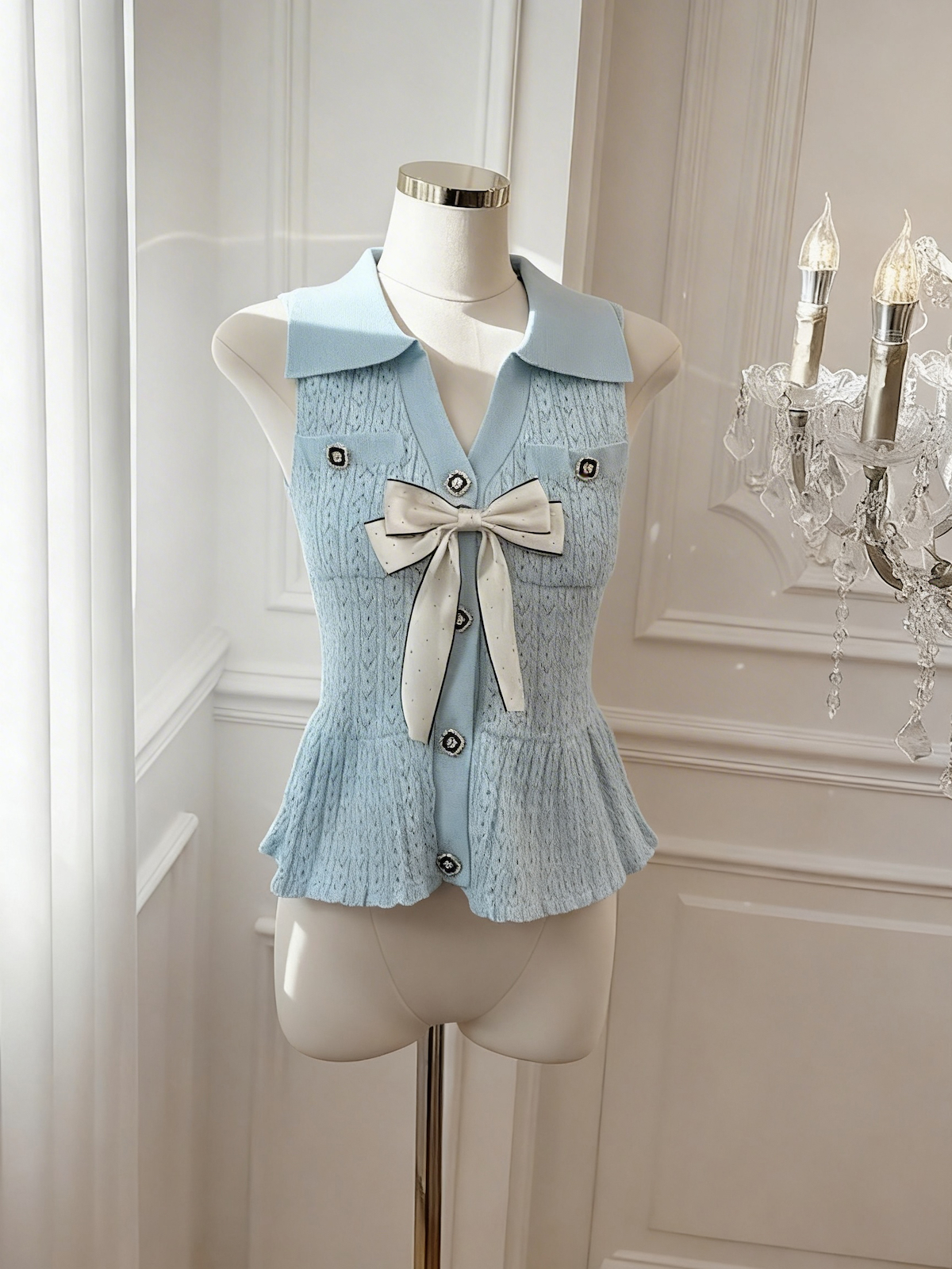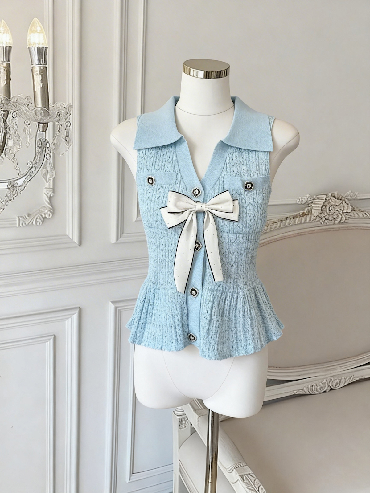 정가 있음 보호 프랑스식 나비 매듭 니트 조끼 홀로우 아웃 자수 오픈 가디건 한 부서 민소매 폴로 칼라 맨위