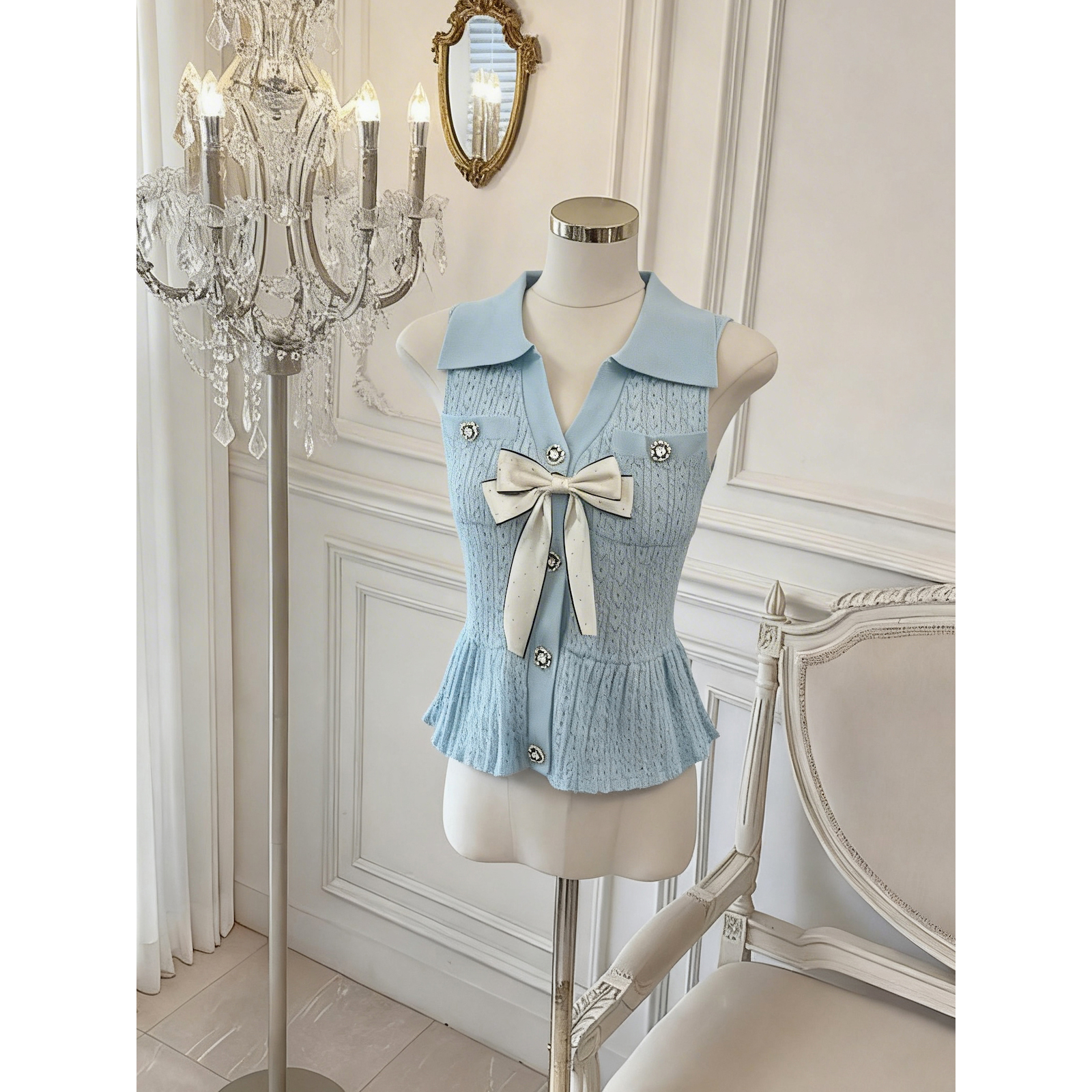 정가 있음 보호 프랑스식 명문 여성 바람 니트 조끼 여성 여름 작은 샤넬 스타일 자카드 고유 한 리본 반팔 맨위