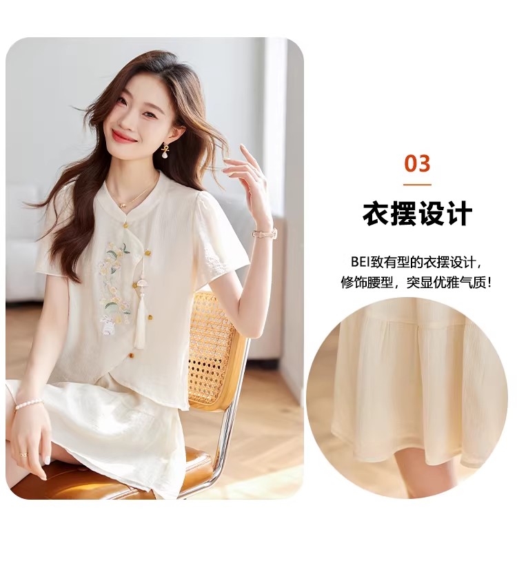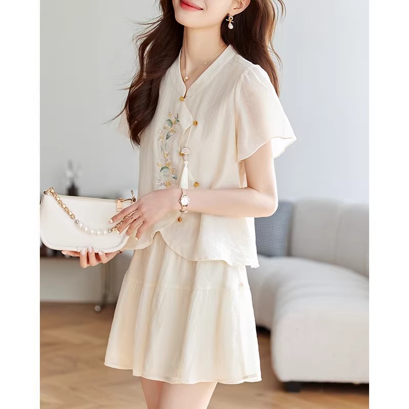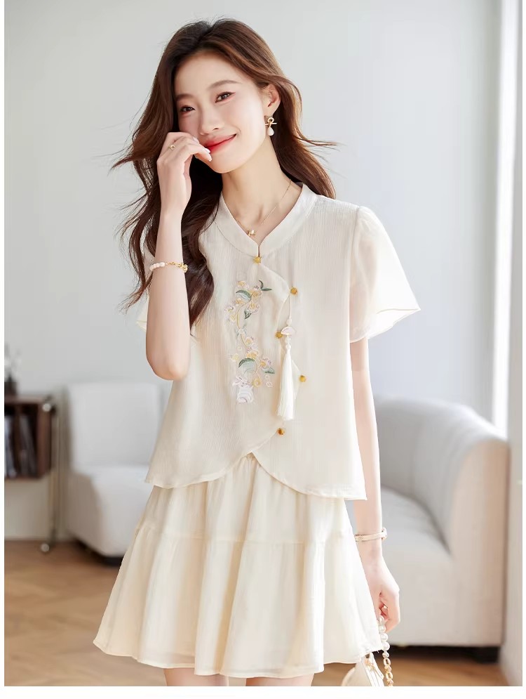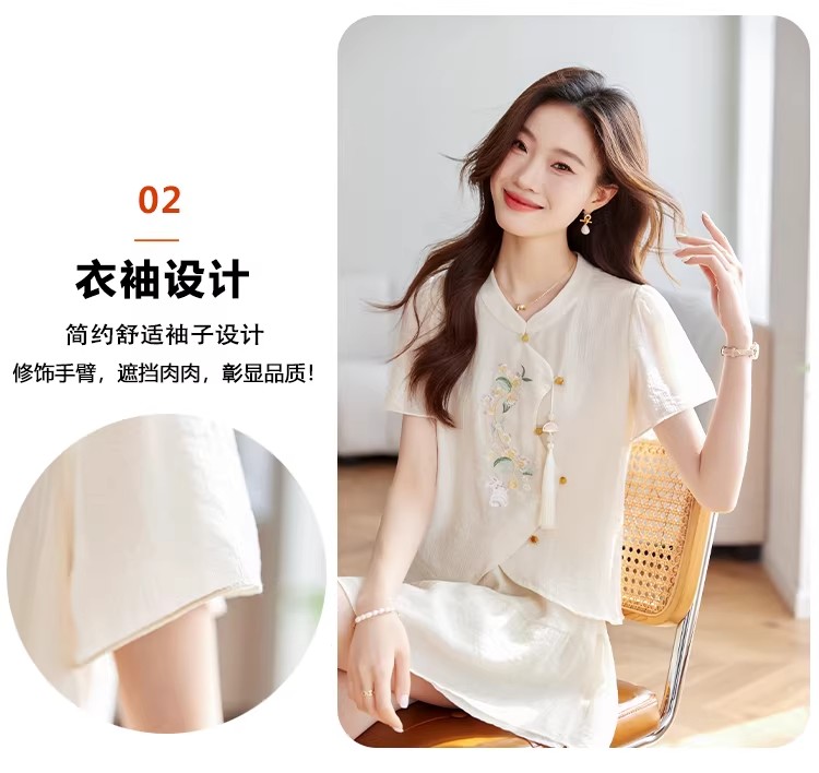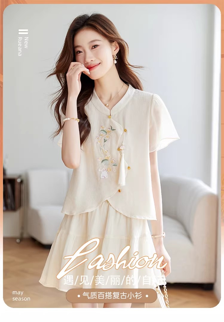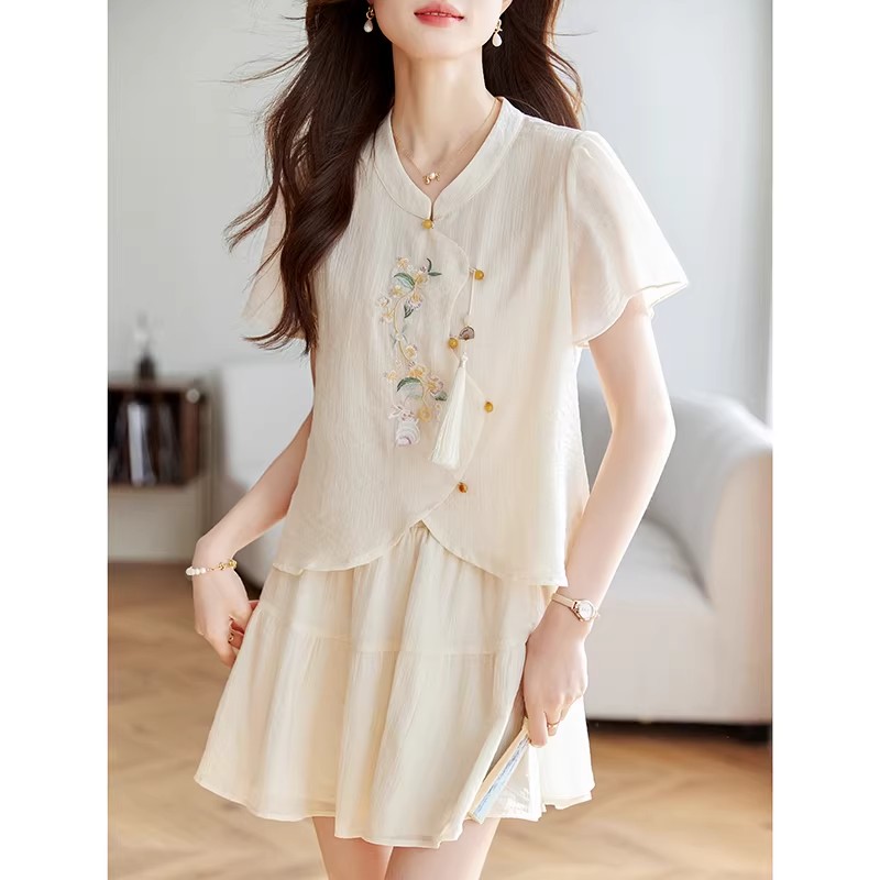 새로운 중식 국풍 자수 반팔 쉬폰 여성 셔츠 여름 드레스 2026 년 새로운 패션 다용도 반신 치마 세트