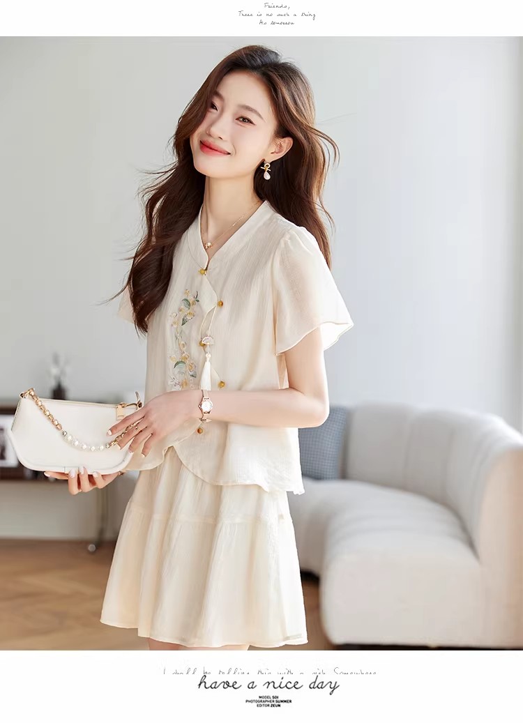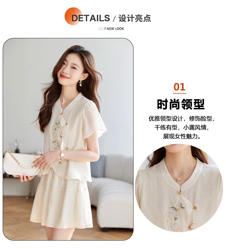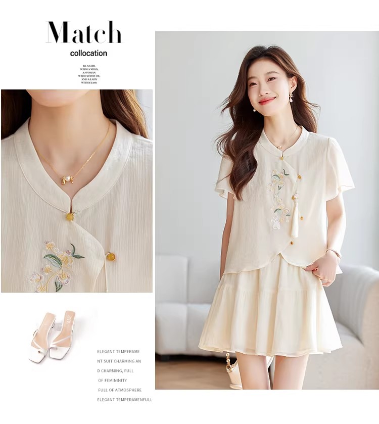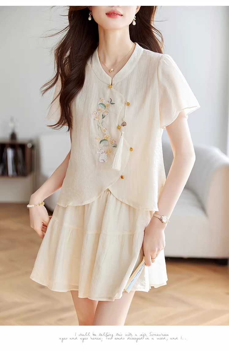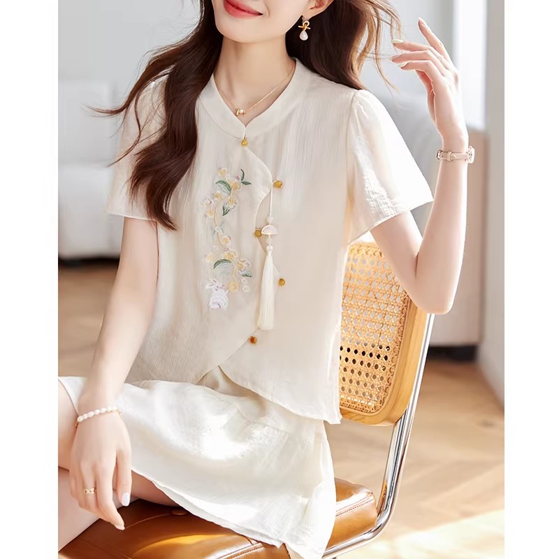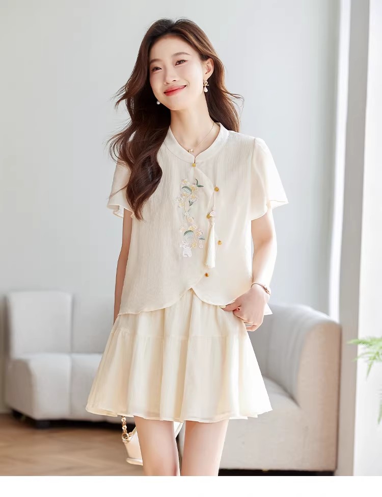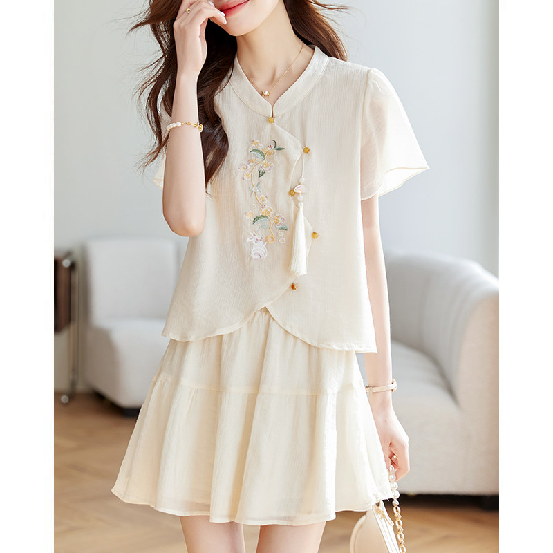 새로운 중식 국풍 자수 반팔 쉬폰 여성 셔츠 여름 드레스 2026 년 새로운 패션 다용도 반신 치마 세트