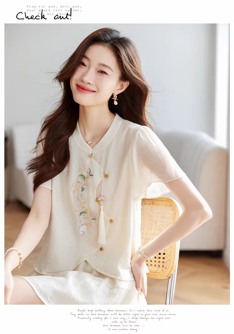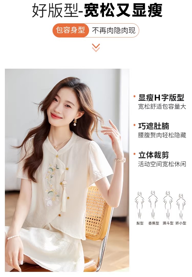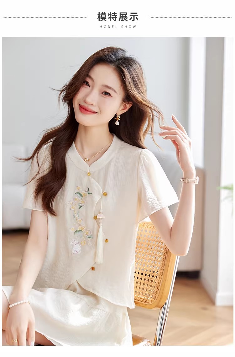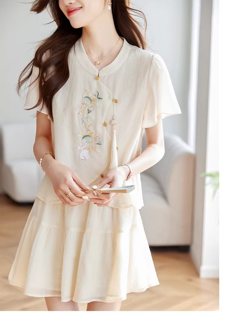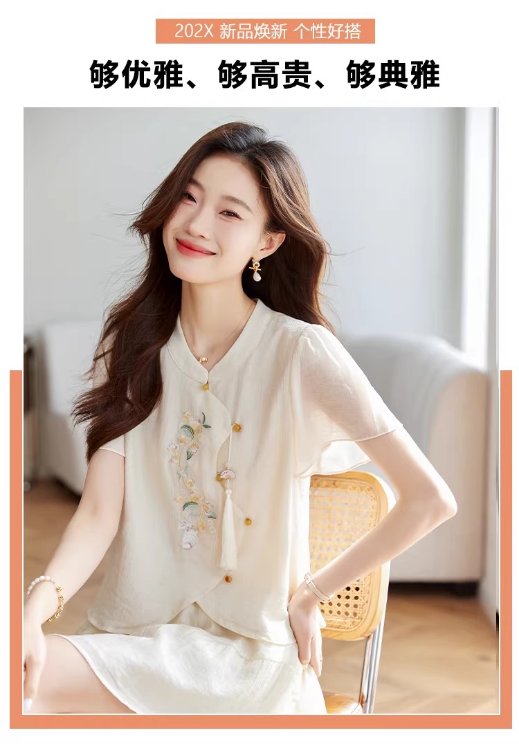 새로운 중식 국풍 자수 반팔 쉬폰 여성 셔츠 여름 드레스 2026 년 새로운 패션 다용도 반신 치마 세트