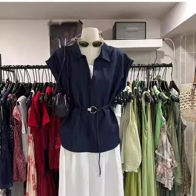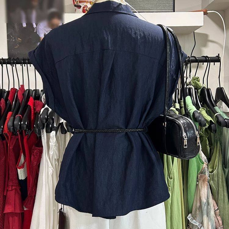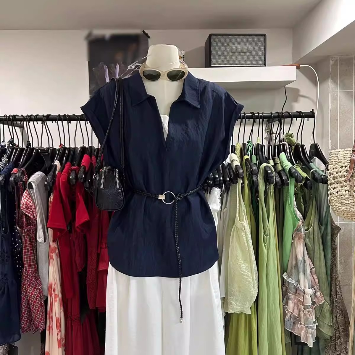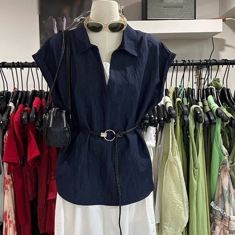 파란색 POLO 칼라 경기 스카프 민소매 여성 셔츠 여름 2026 새로운 루즈핏 캐주얼 셔츠 품격 슬림해 보이는 맨위