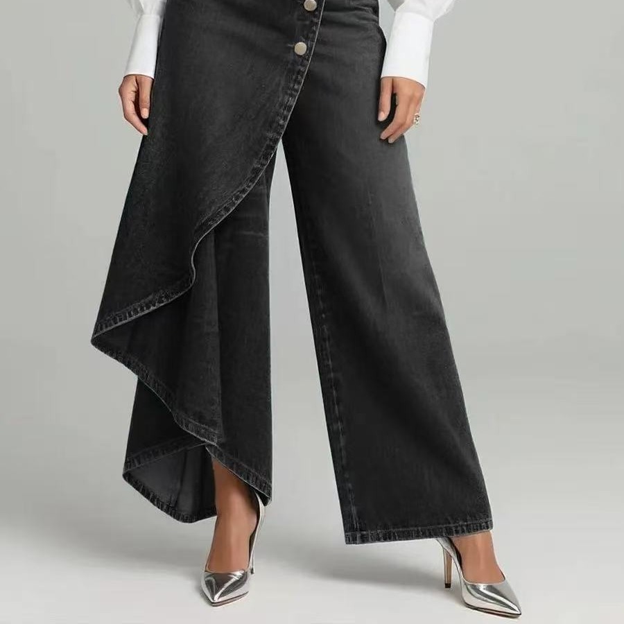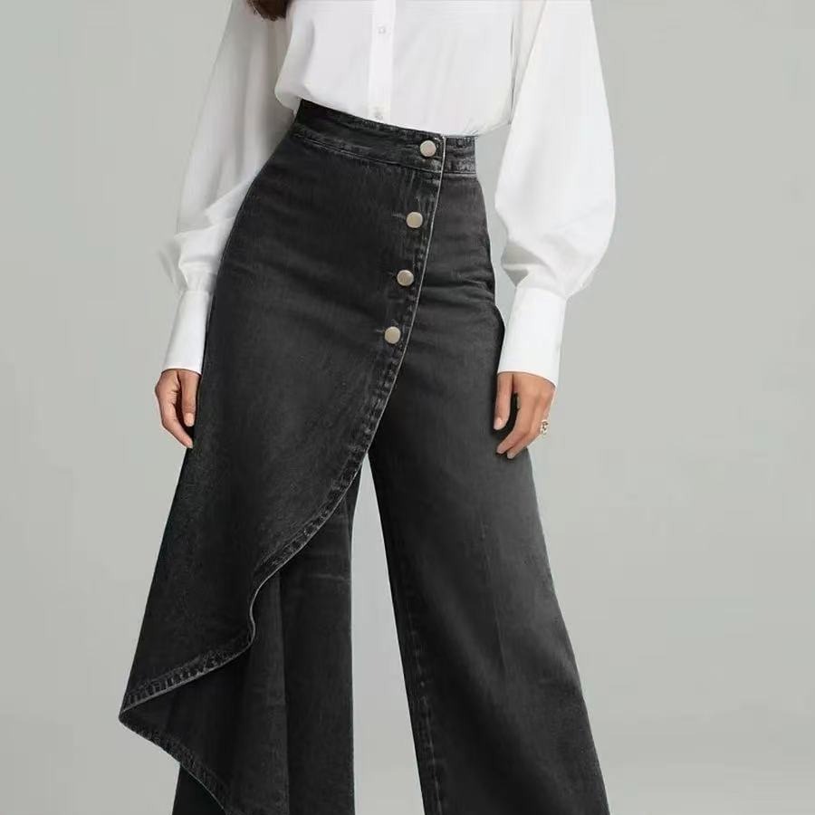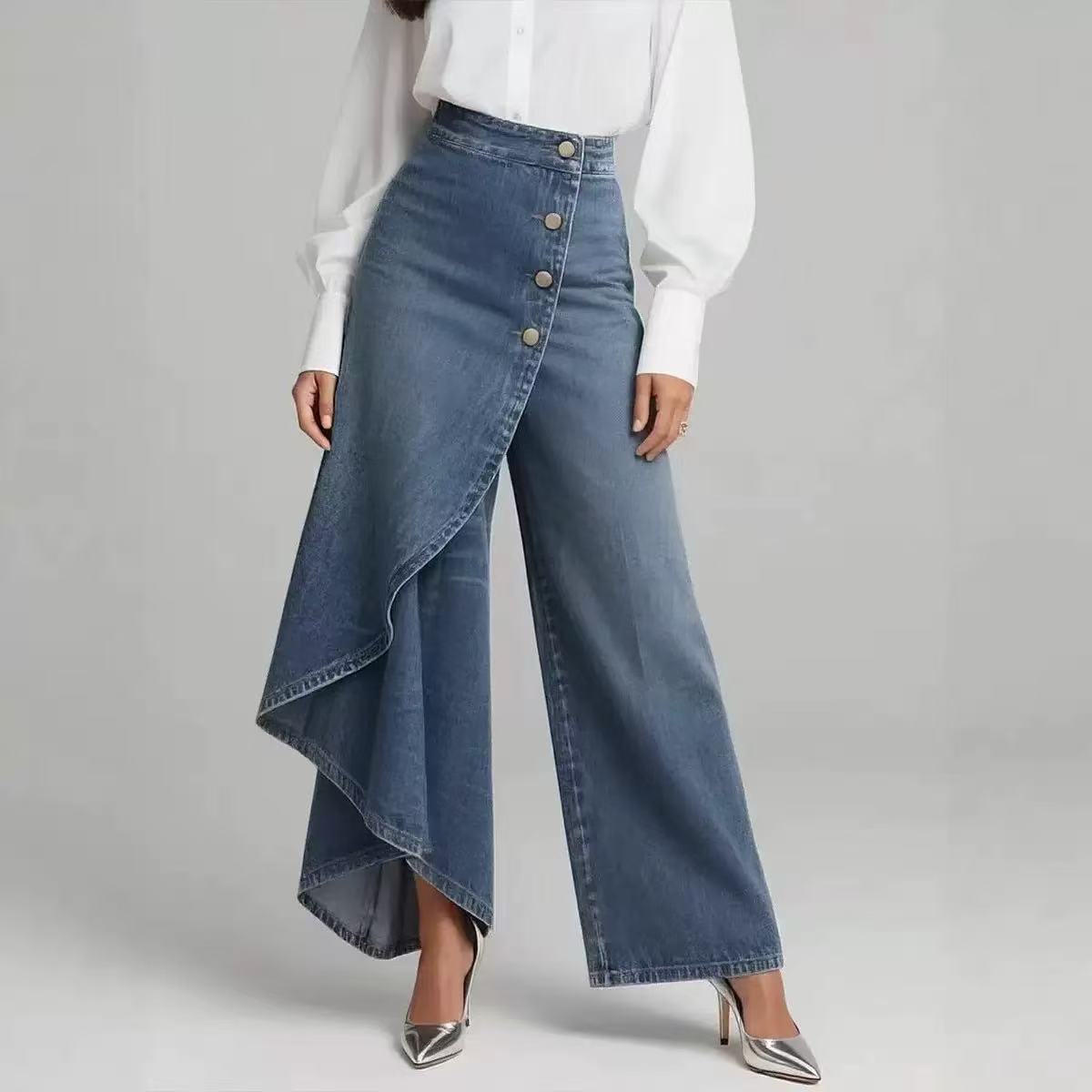 2026 새로운 유럽과 미국 국경 간 아마존 폭발 봄 여름 여성 의류 레트로 불규칙 중간 허리 모방 데님 긴 바지