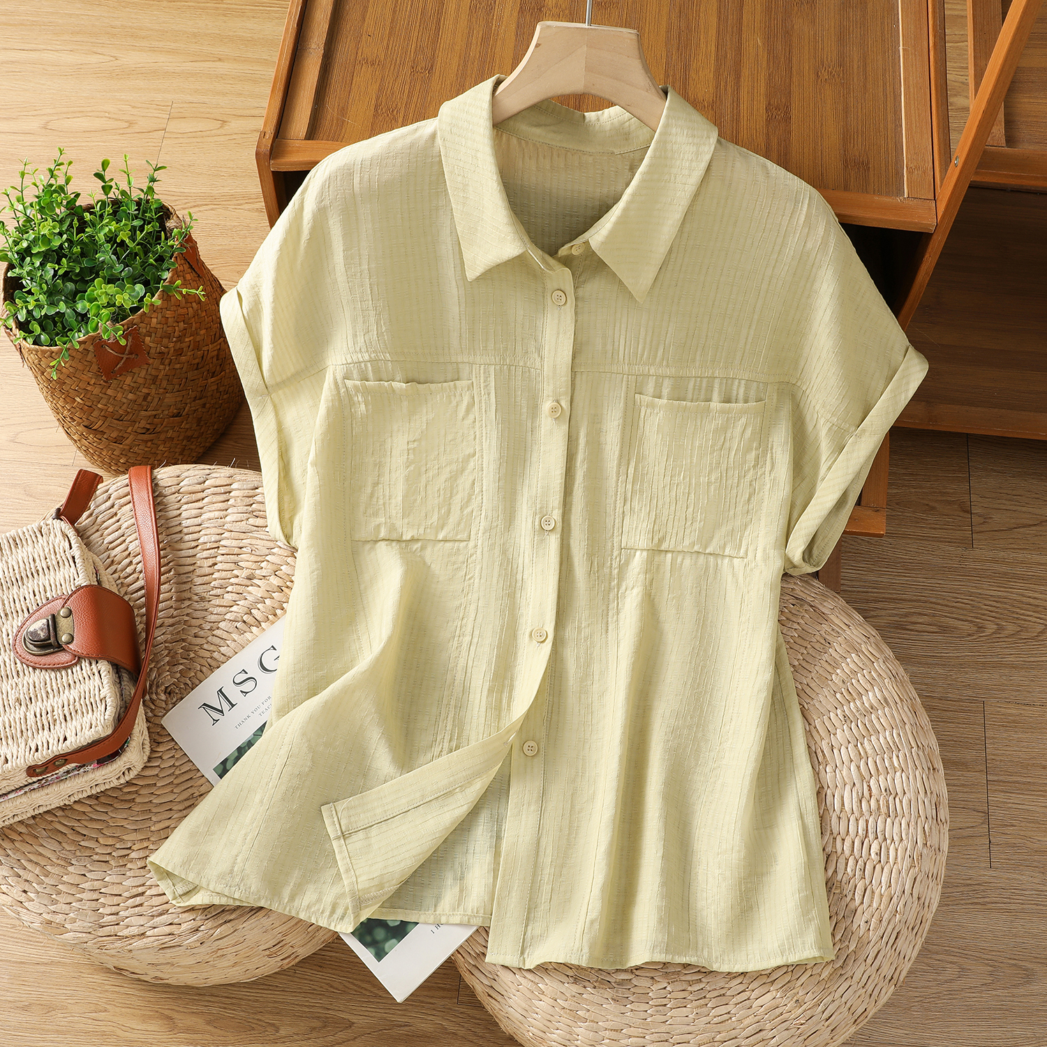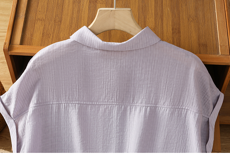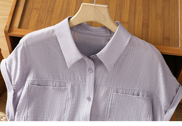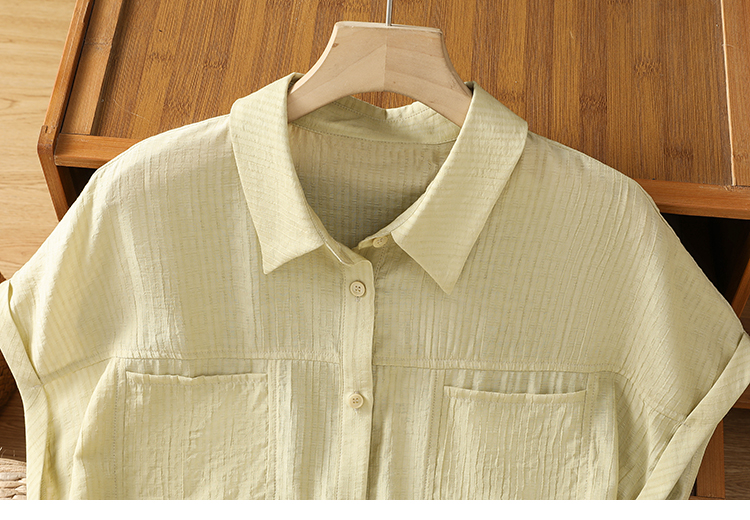 실사 2026 여름 섹션 면 100% 얇은 스타일 이중층 세로 줄무늬 반팔 셔츠 여성 레저 루즈핏 빅 사이즈 스탠드 칼라 맨위