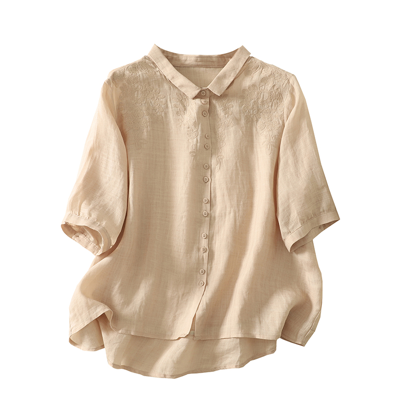실사 2026 여름 새로운 아마 빅 사이즈 스탠드 칼라 7부 소매 루즈핏 태양 보호 셔츠 패션 연령 감소 여성 셔츠