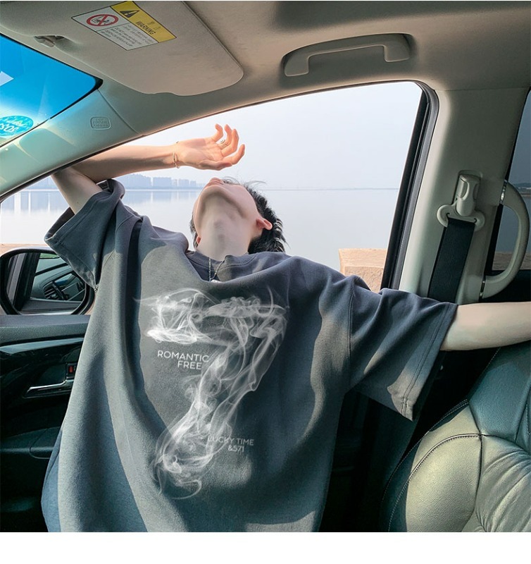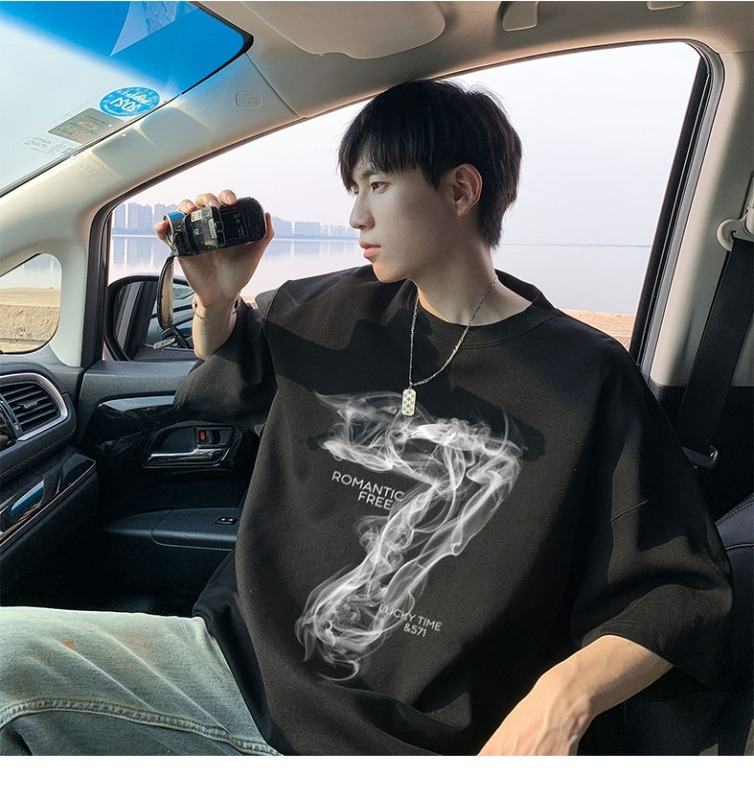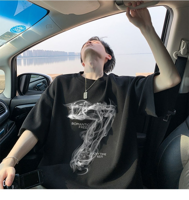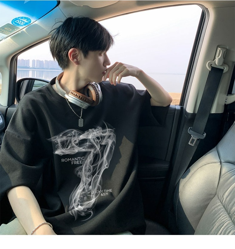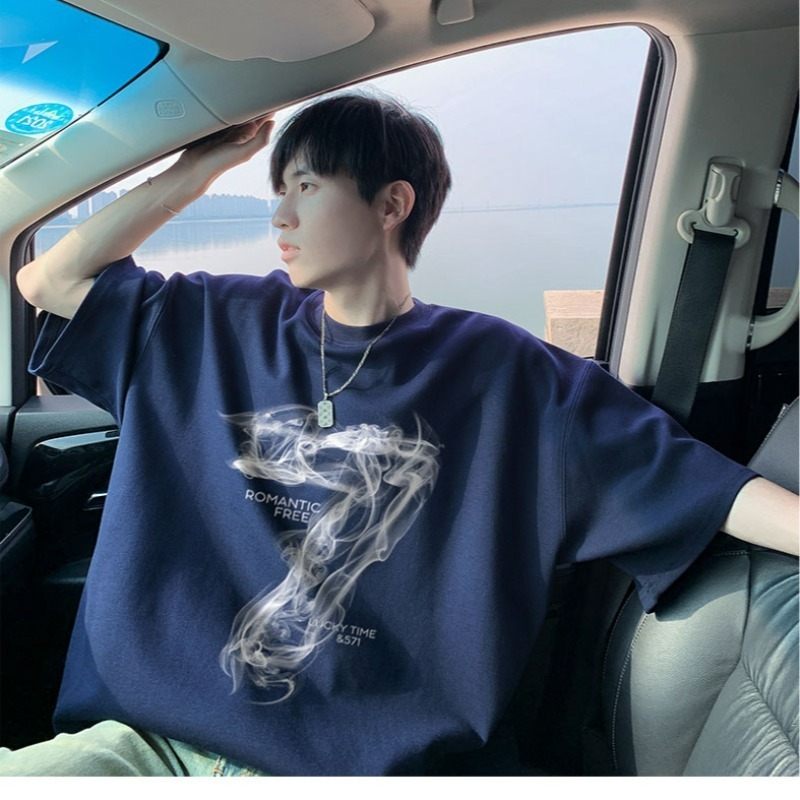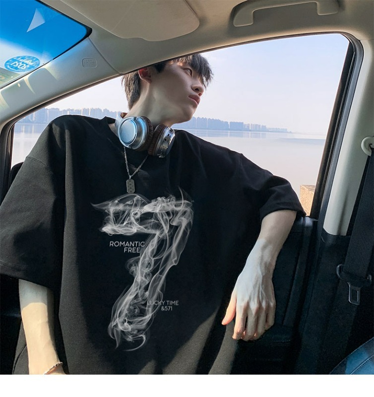 숫자 7 부서 100 순면 프린트 순면 티셔츠 남자 여름 레트로 악당 잘 생긴 튀김 거리 반팔 커플 반소매 동정