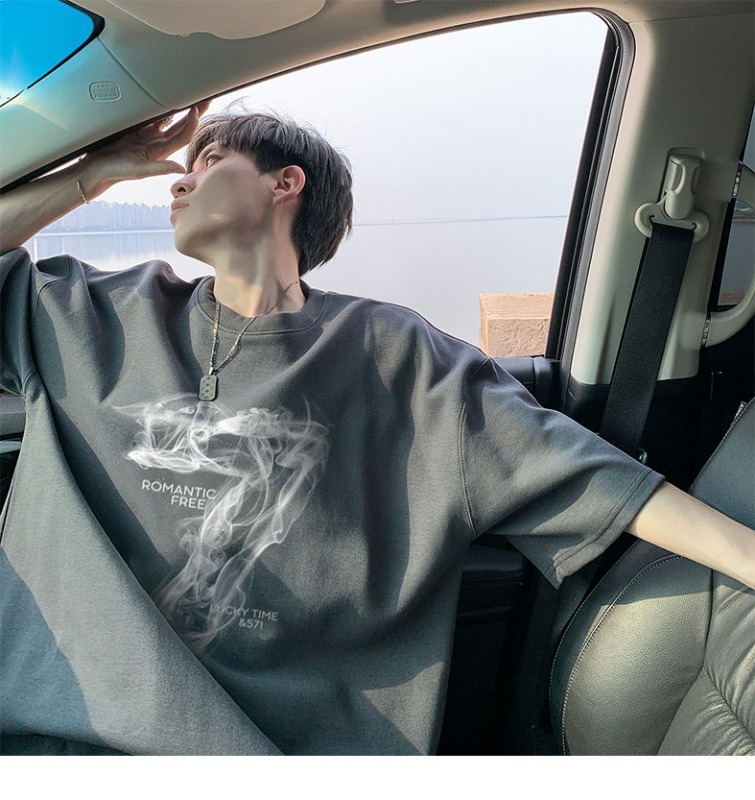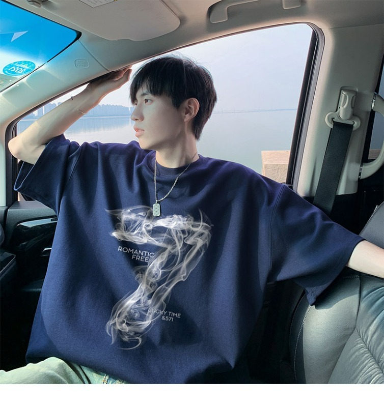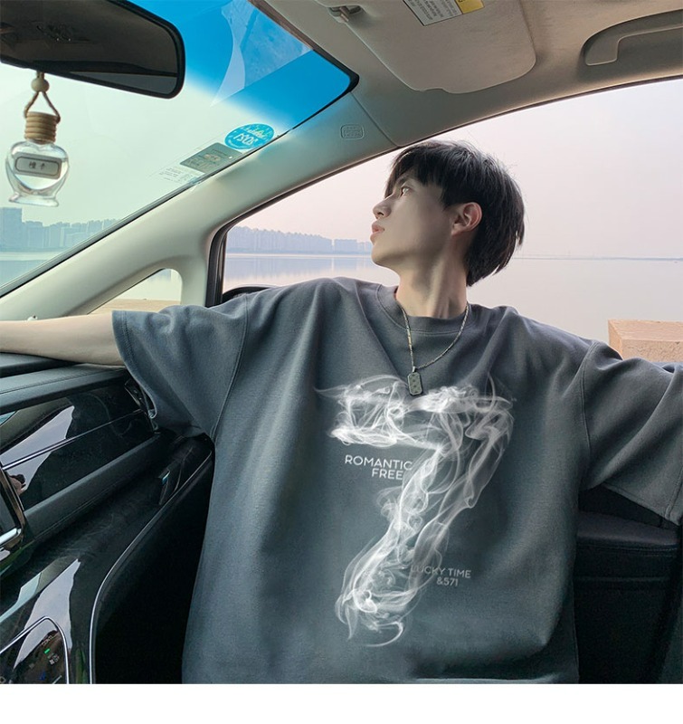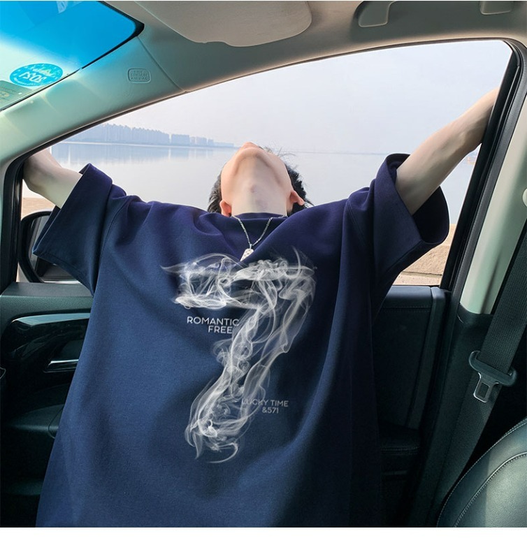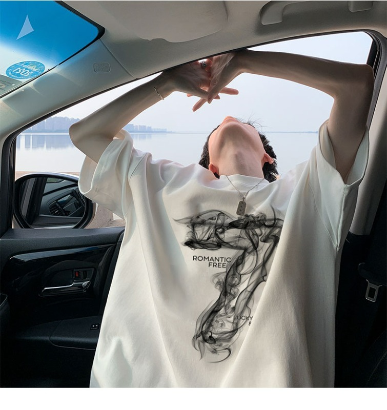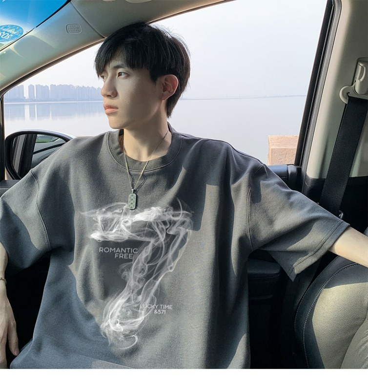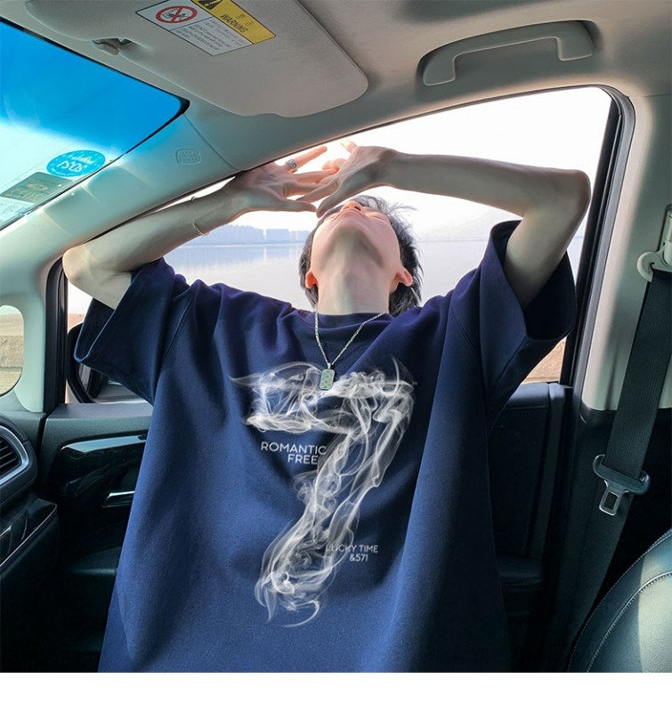 숫자 7 부서 100 순면 프린트 순면 티셔츠 남자 여름 레트로 악당 잘 생긴 튀김 거리 반팔 커플 반소매 동정