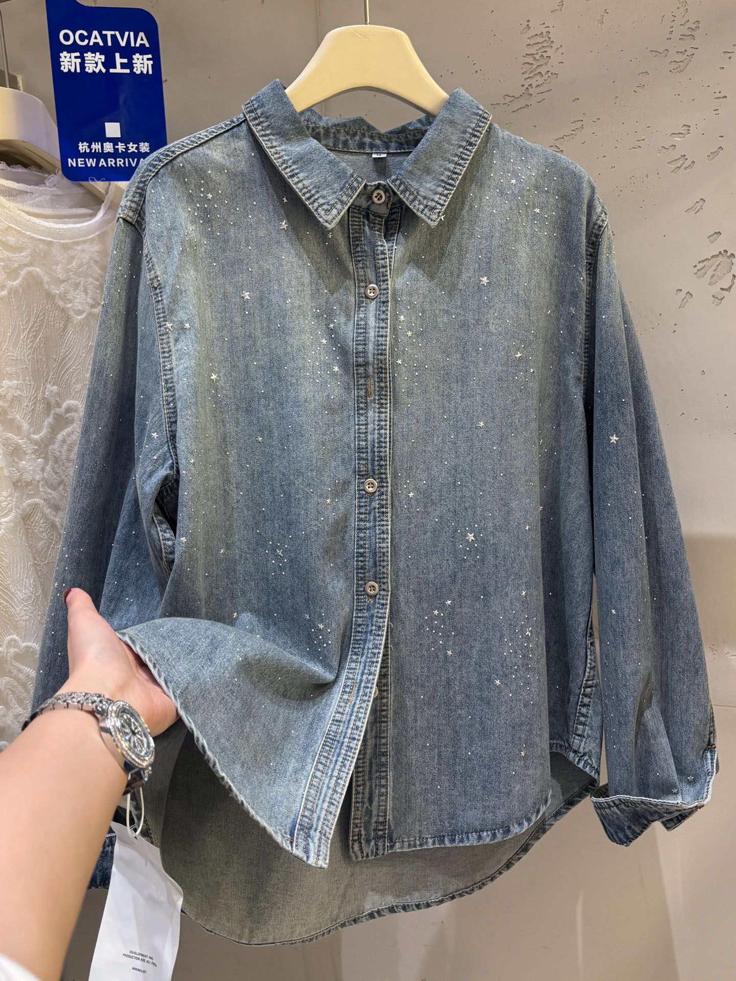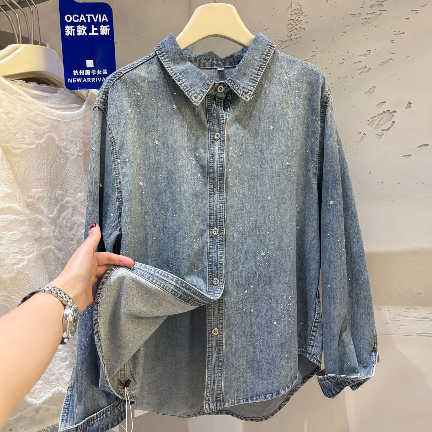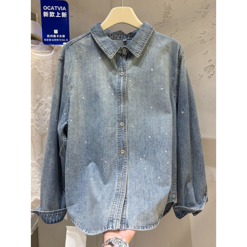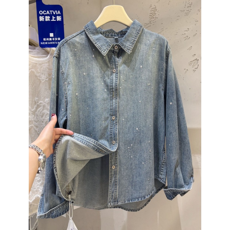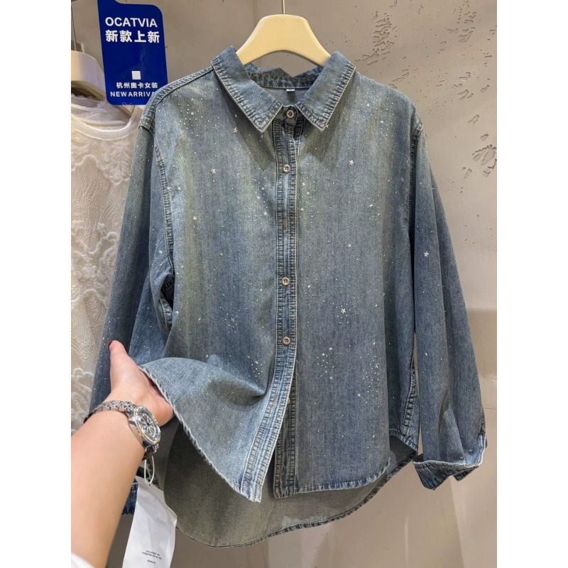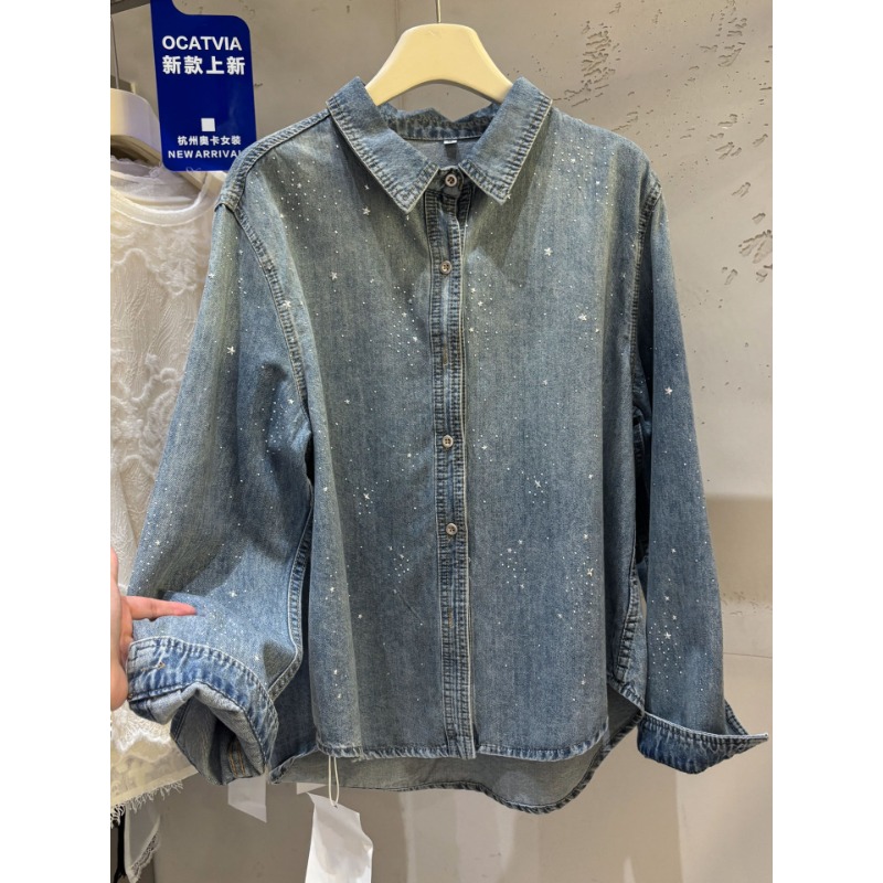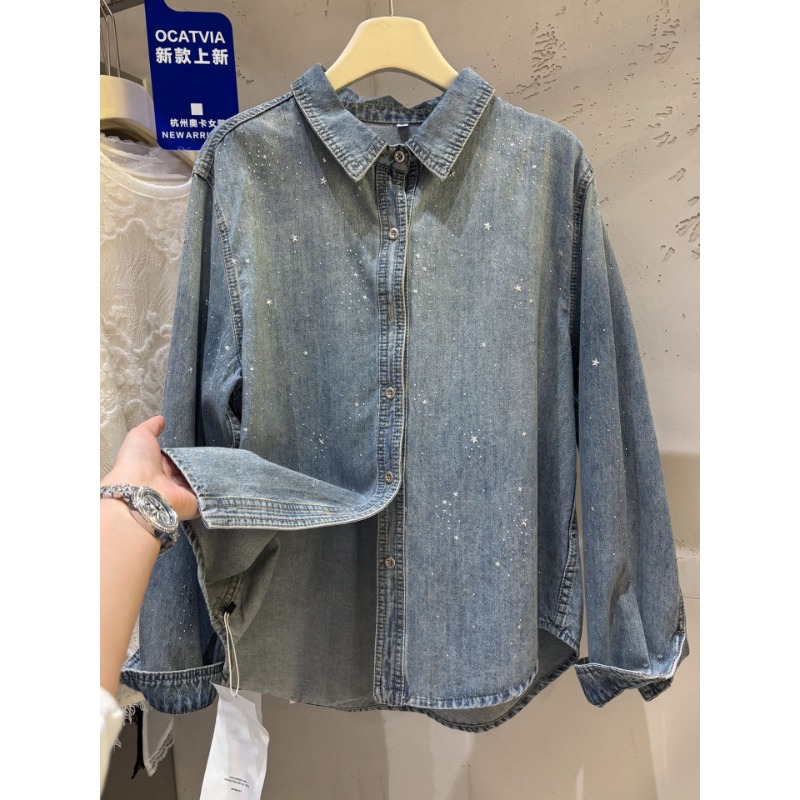 높음 세트 유럽 상품 빛나는 별 핫픽스 데님 셔츠 여성 긴 소매 2026 봄 새로운 캐주얼 다용도 맨위