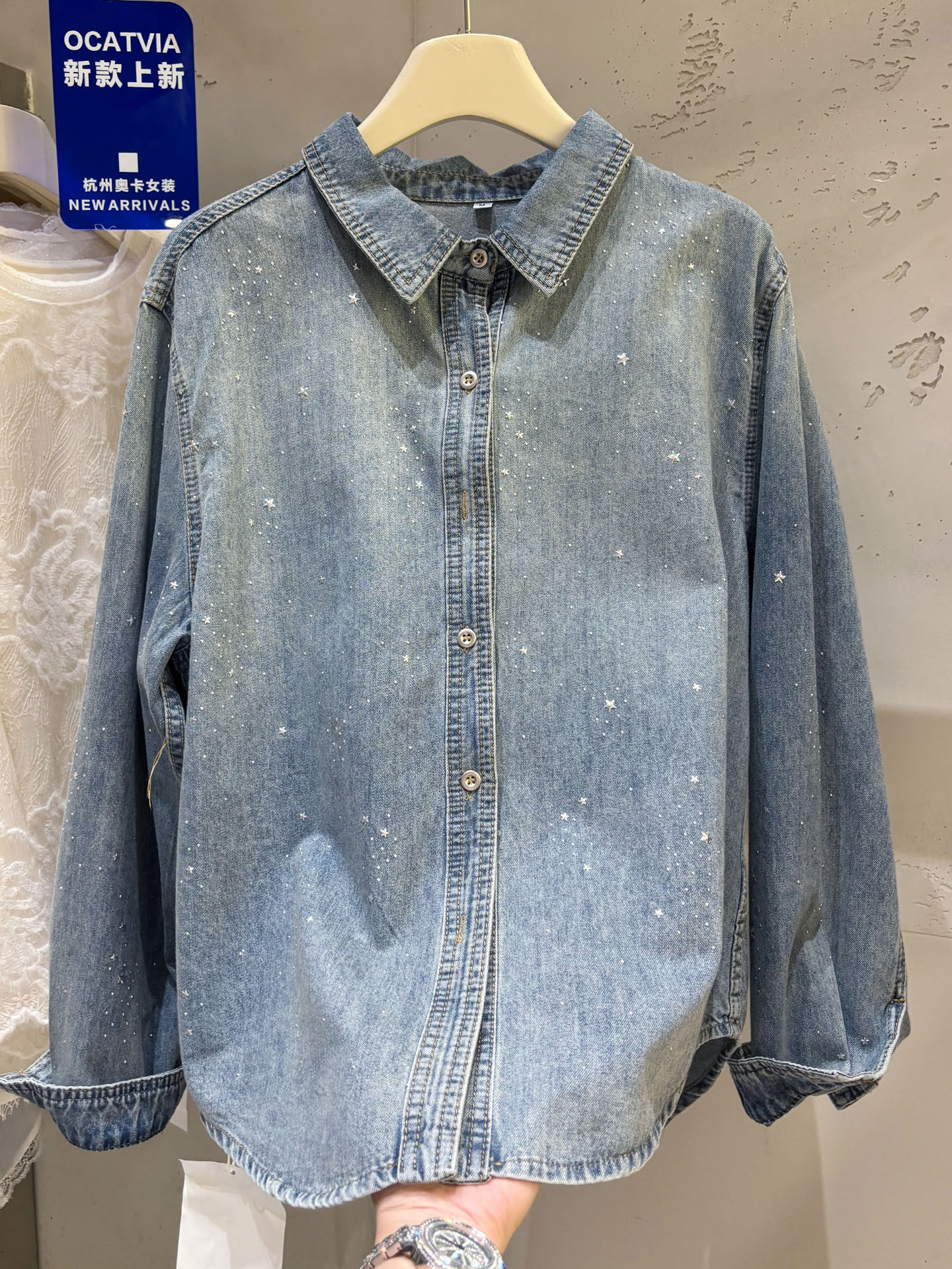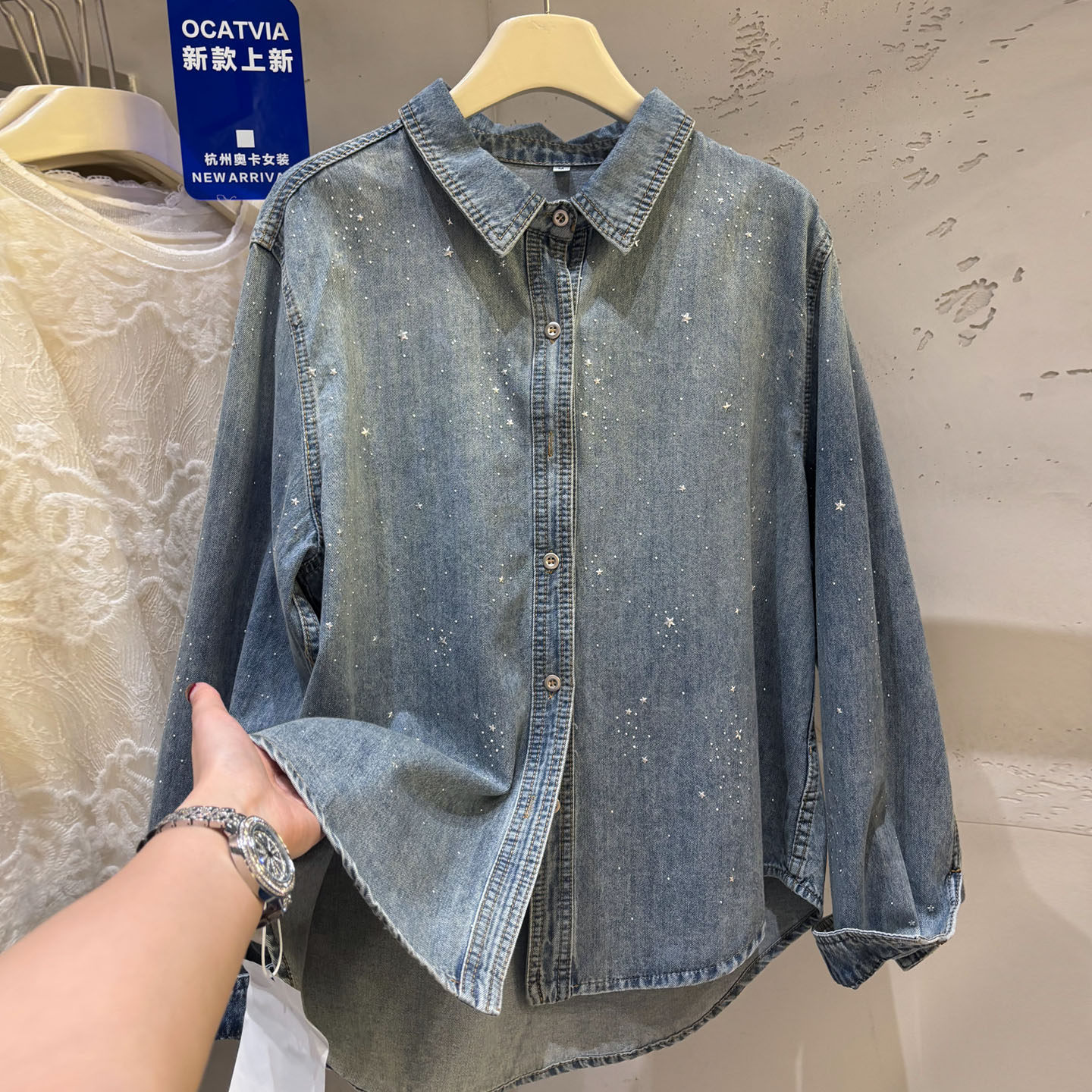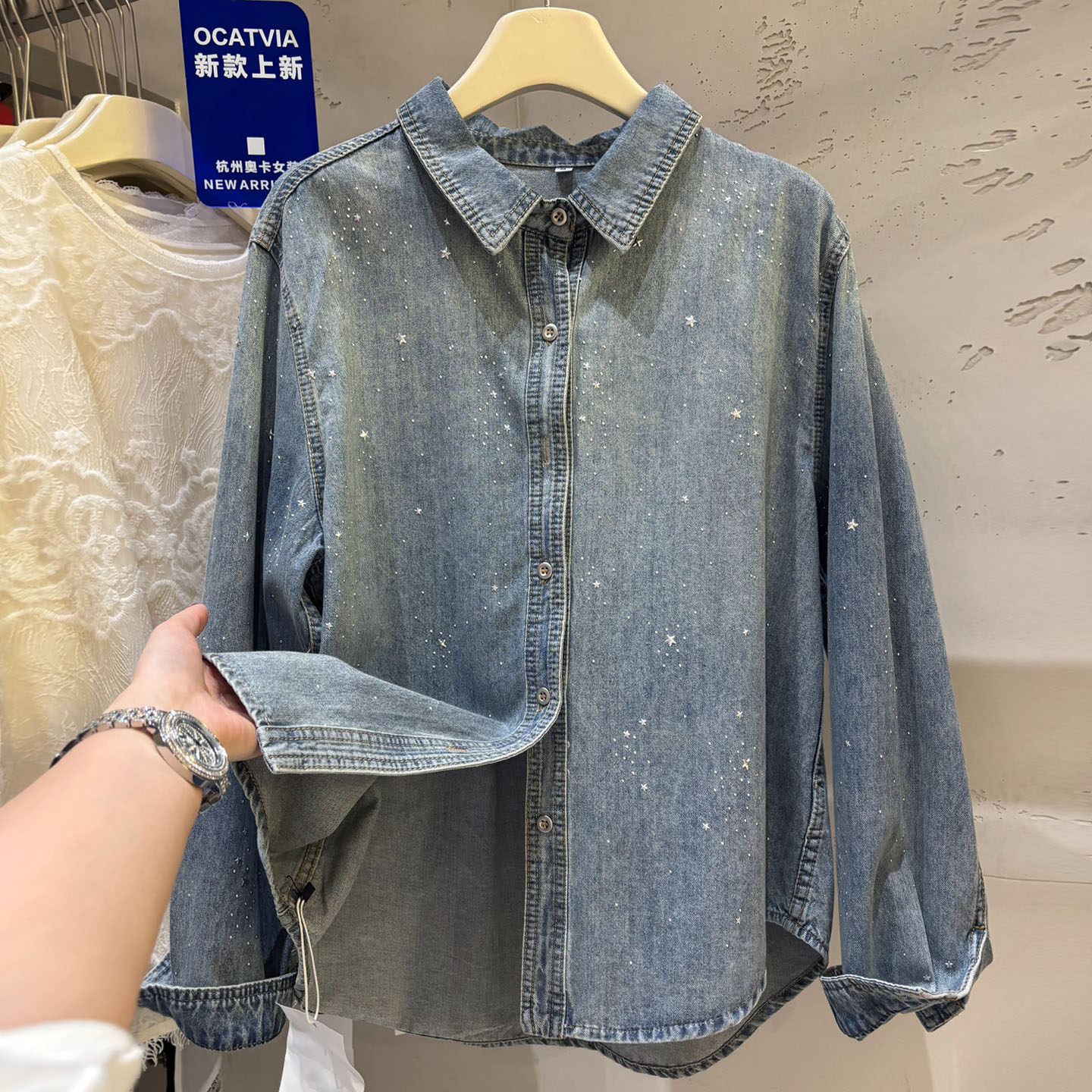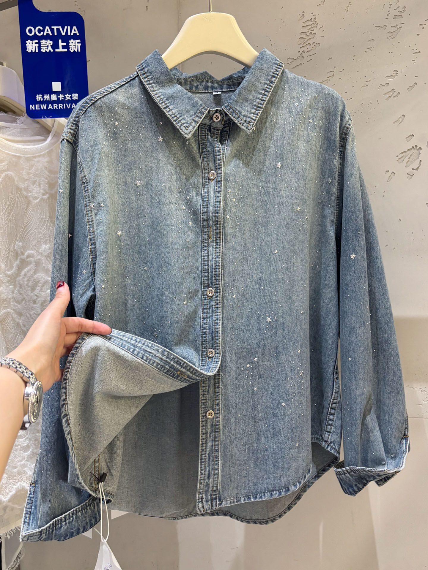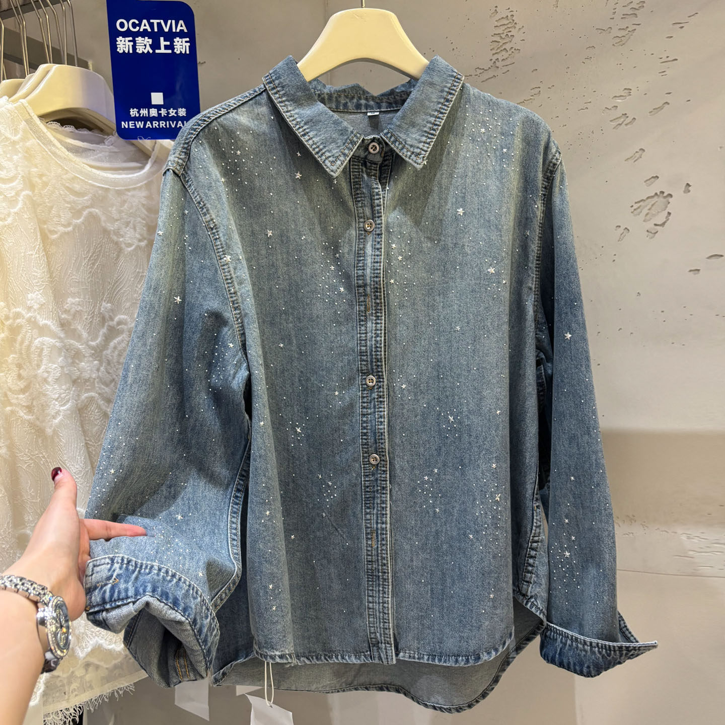 높음 세트 유럽 상품 빛나는 별 핫픽스 데님 셔츠 여성 긴 소매 2026 봄 새로운 캐주얼 다용도 맨위