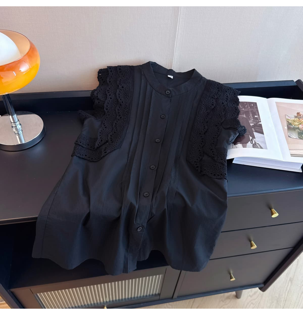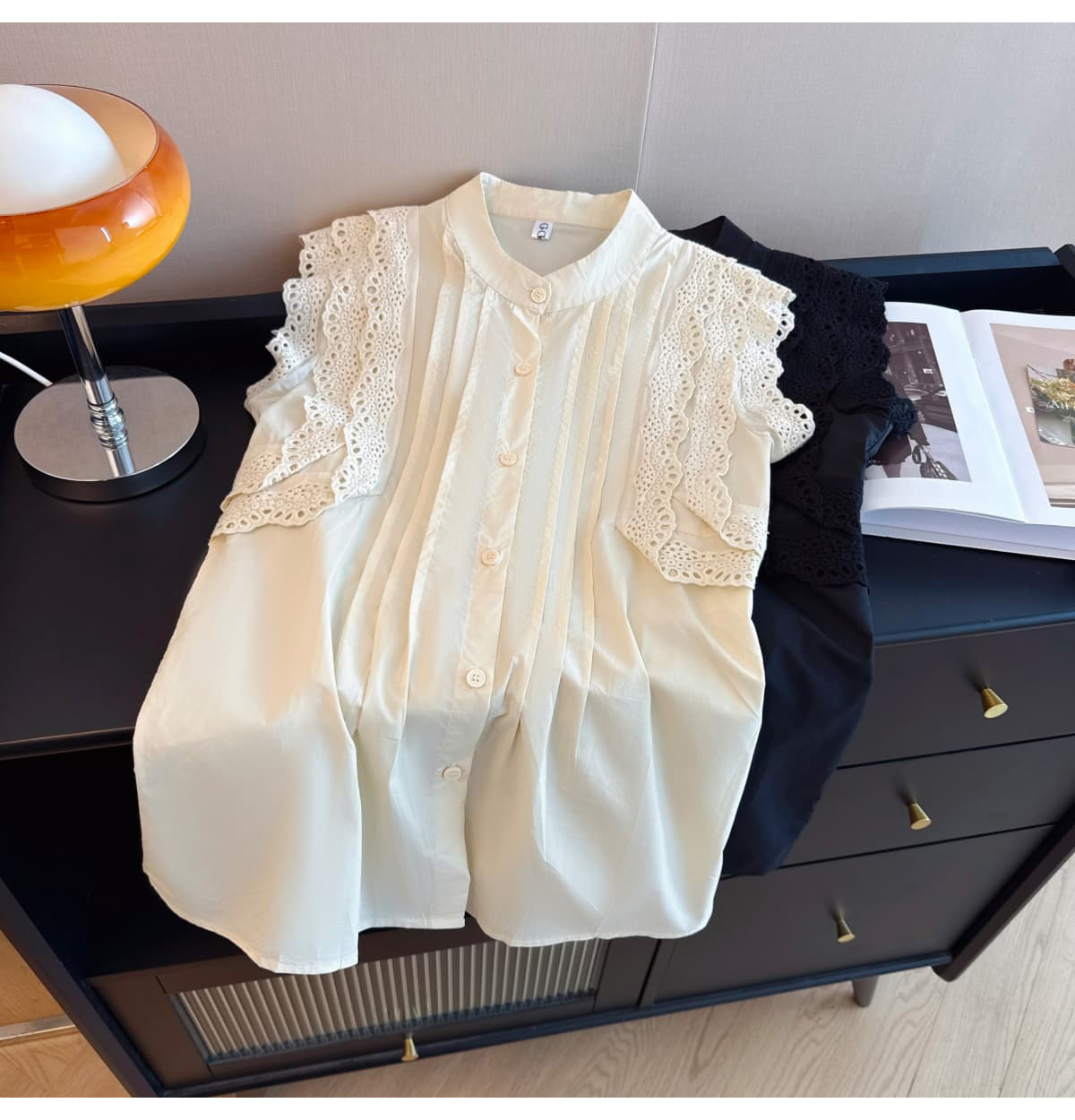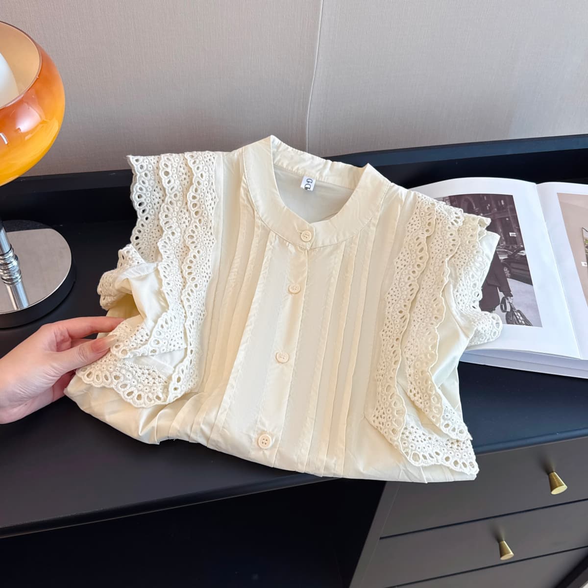 실사 지방 mm 프랑스식 특별 빅 사이즈 레이스 조각 루즈핏 여성용 짧은 소매 품격 인형 셔츠 맨위 빅 사이즈 여성 의류