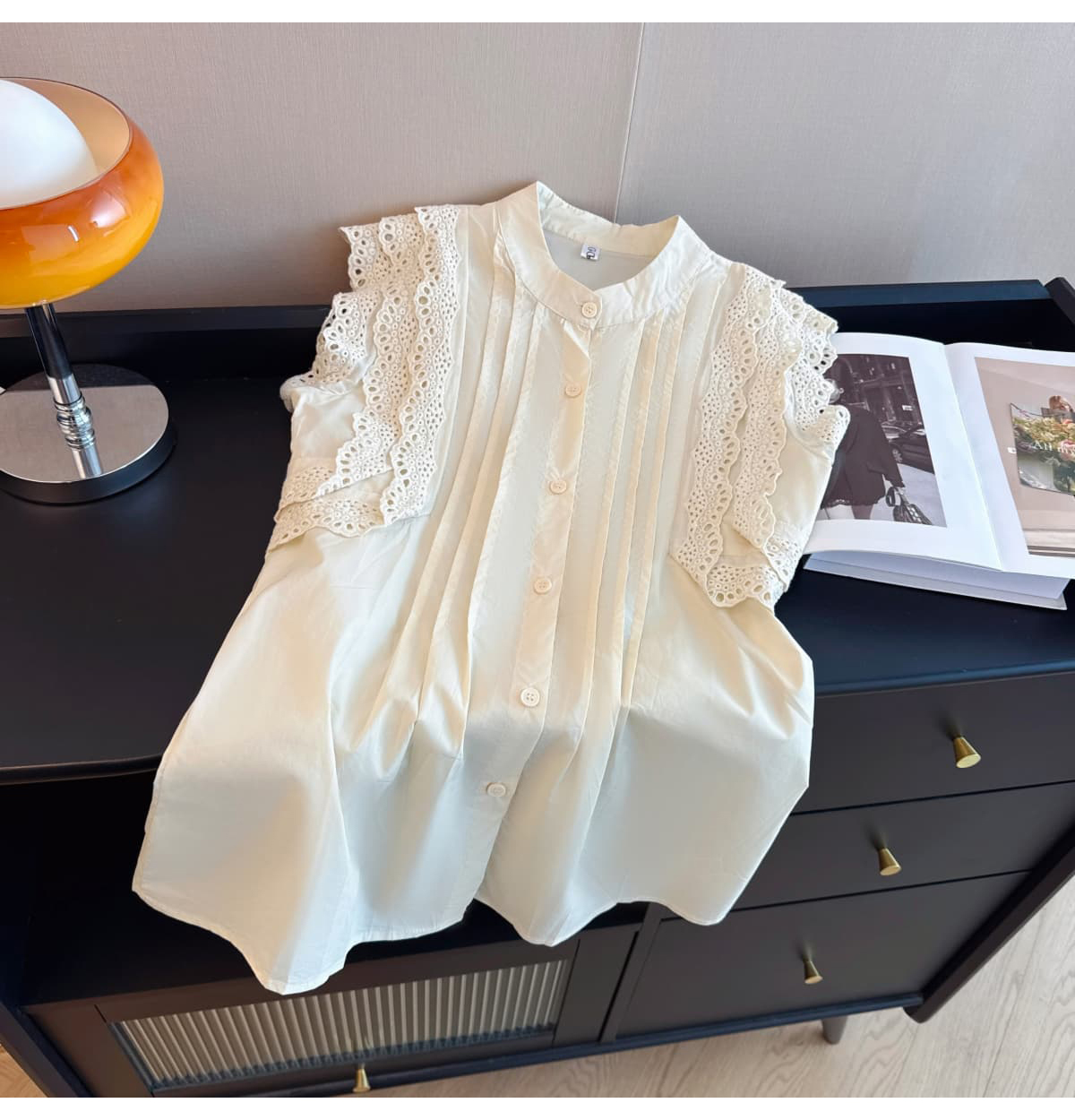 실사 지방 mm 빅 사이즈 순면 도트 무늬 목이버섯 레이스 측면 작은 날다 소매 여성 셔츠 여름 연령 감소 민소매 맨위