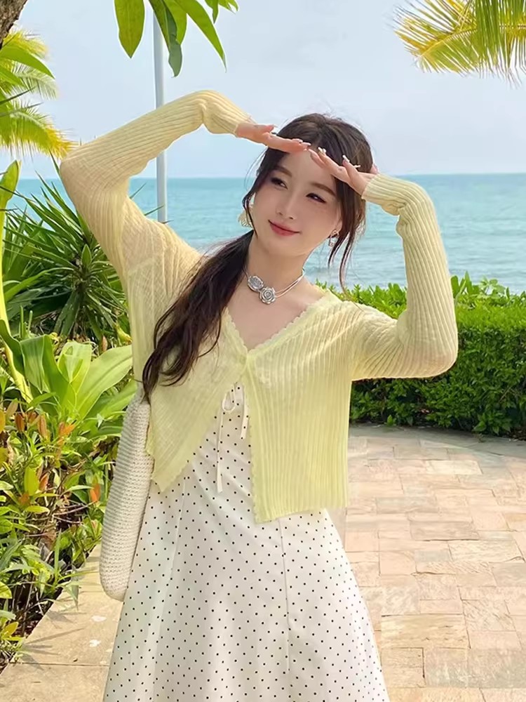 황색 긴팔 니트 오픈 가디건 여성 이른 봄 2026 년 새로운 얇은 스타일 스웨터 자외선 차단 재킷 몸매 가꾸기 맨위 외부 가져 가라.