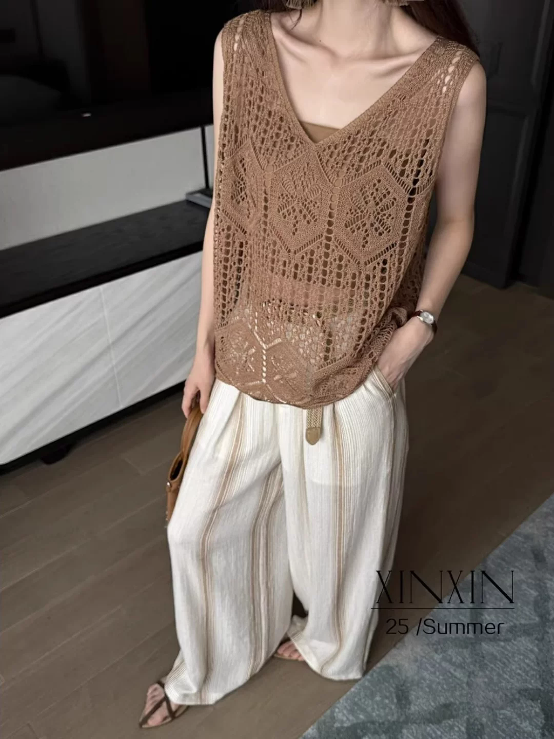 프랑스식 작은 대중 고유 한 레트로 홀로우 아웃 카키 색 V넥 니트 조끼 여성 여름 Chic 어깨 베스트 맨위