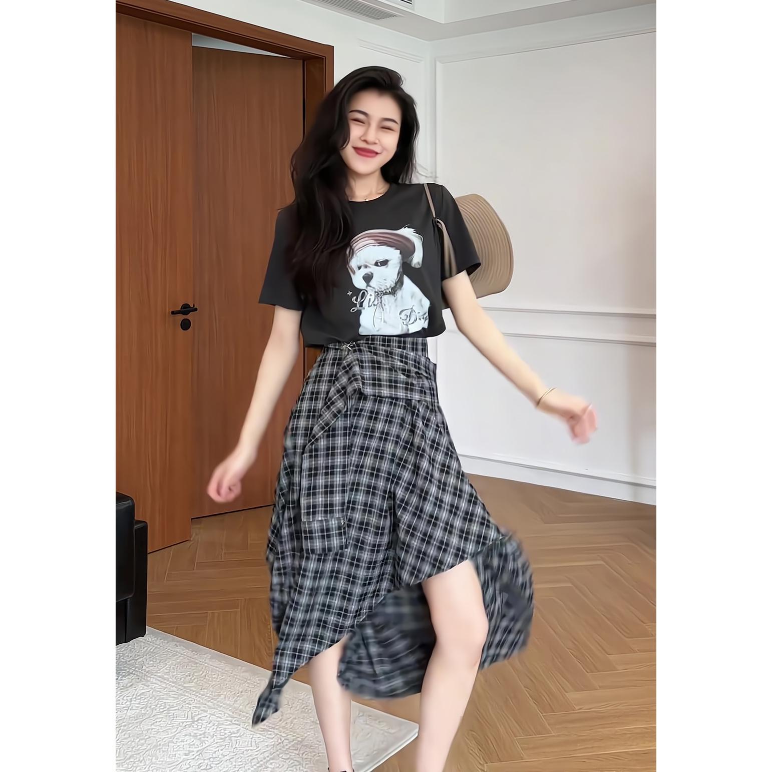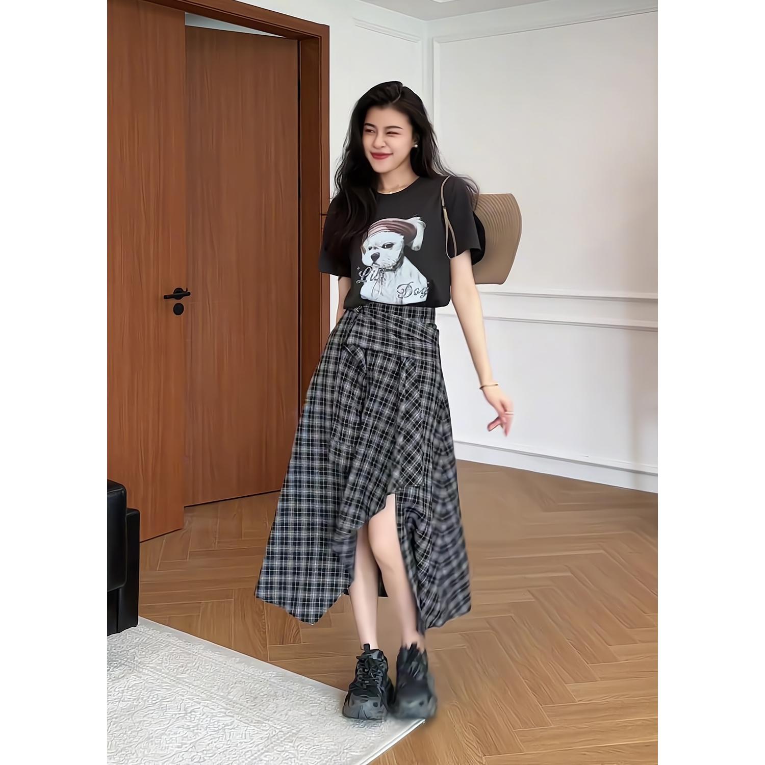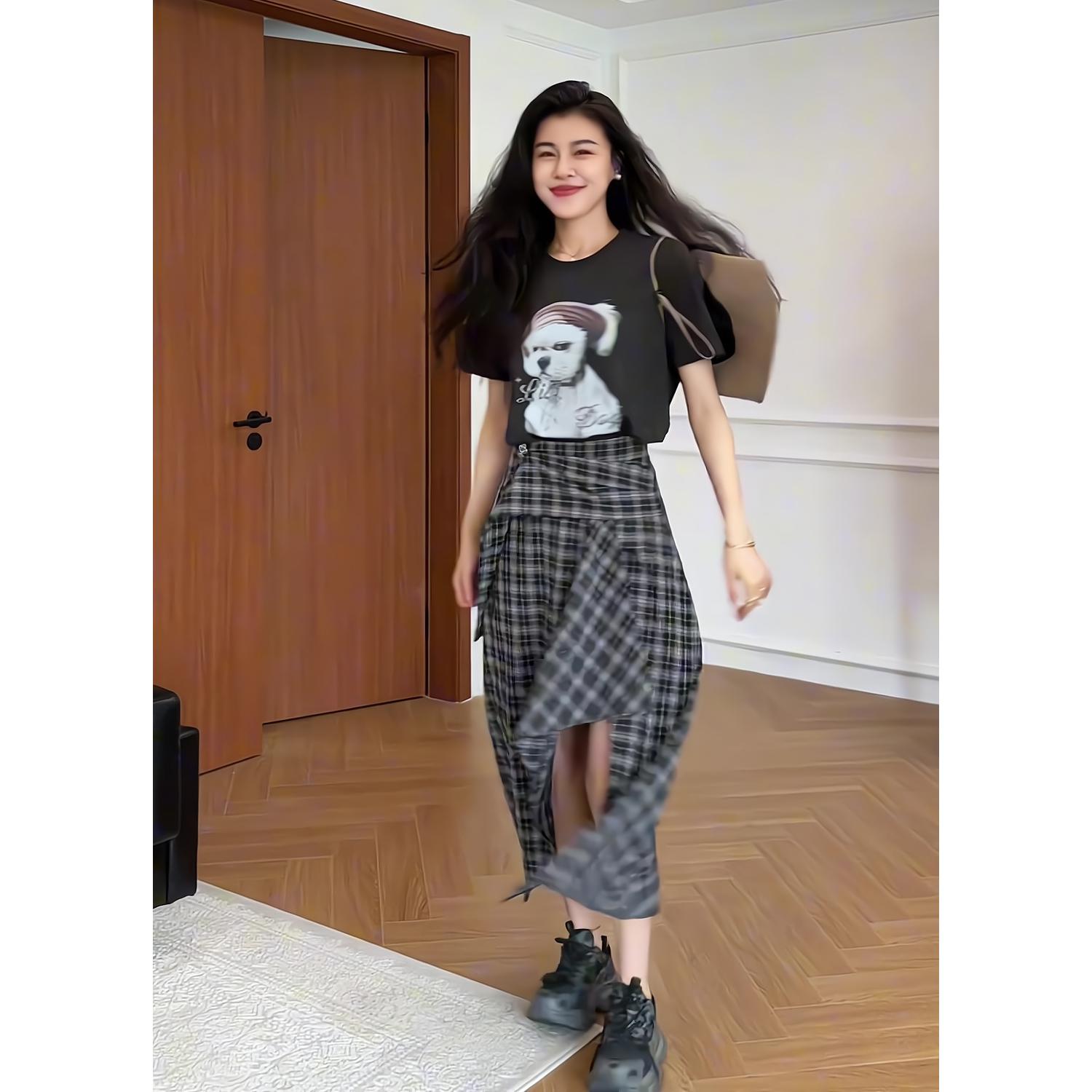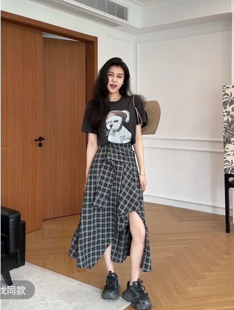 장 A 스타 와일드 세트 아메리칸 높음 거리 워싱 반팔 t+ 불규칙 체크무늬 반 스커트