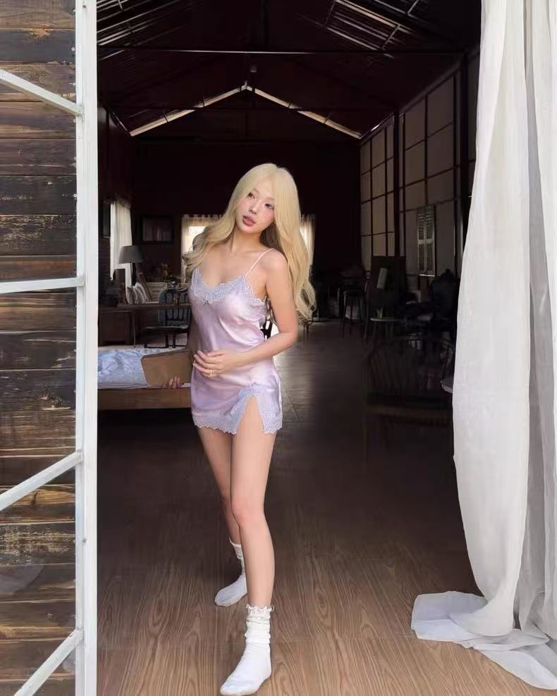 라벤더 레이스 조각 새틴 슬립 나이트 드레스 순수한 욕망 바람 트임 섹시함