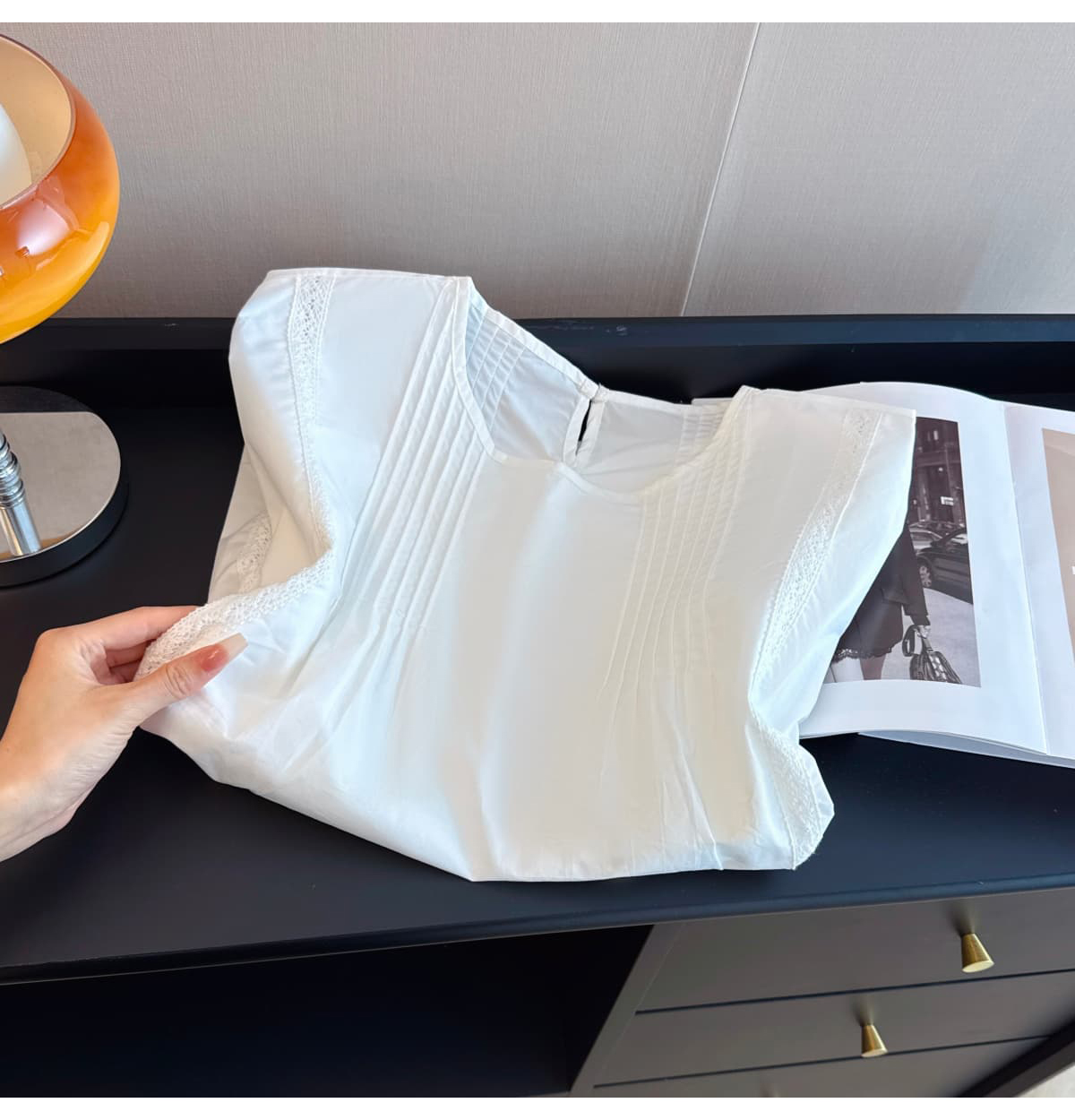 실사 지방 mm 빅 사이즈 순면 도트 무늬 목이버섯 레이스 측면 작은 날다 소매 여성 셔츠 여름 연령 감소 민소매 맨위