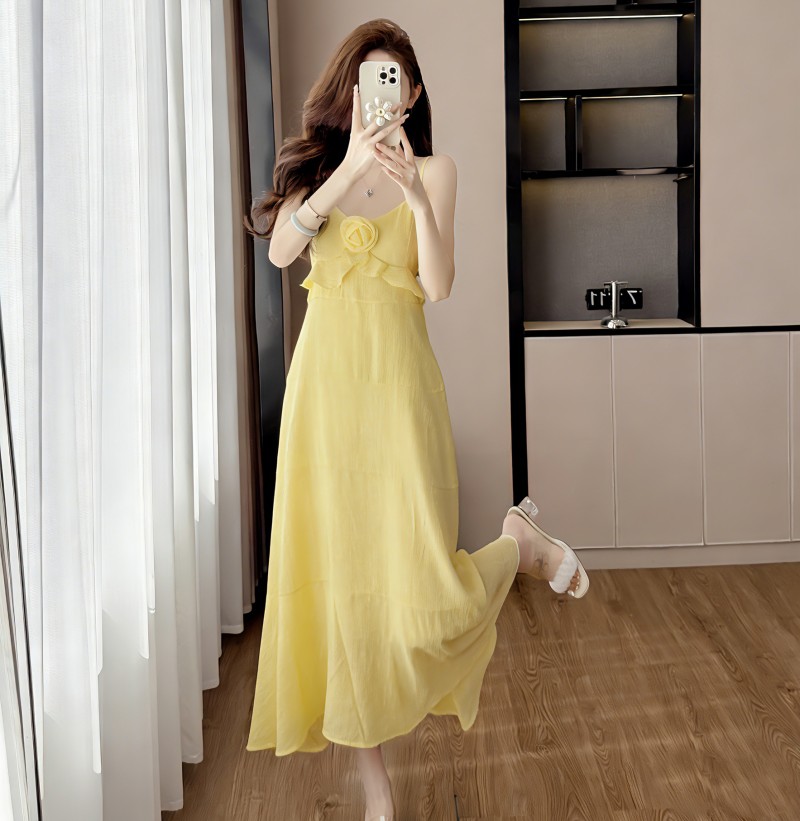 프랑스식 전원 바람 황색 슬립 길다 치마 3 차원 꽃 소녀 센스 해변가 휴가 바람 여성 드레스