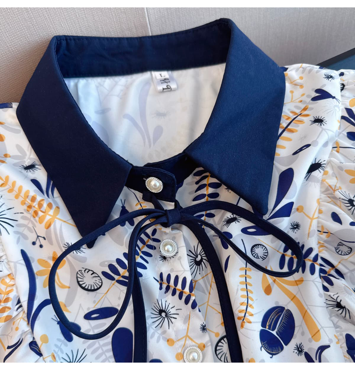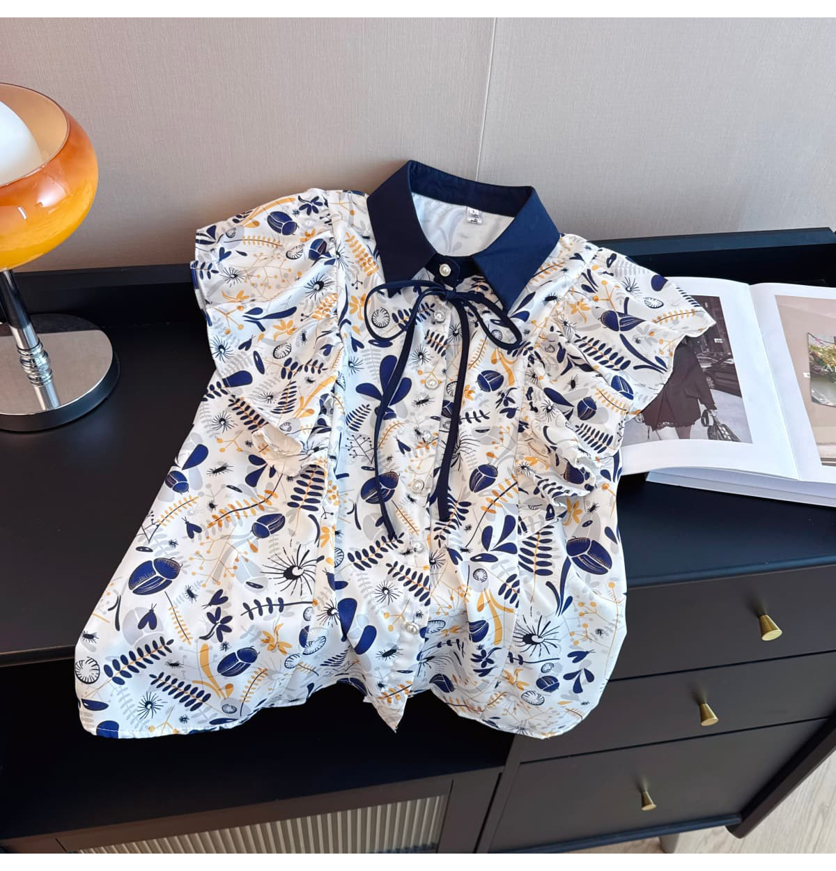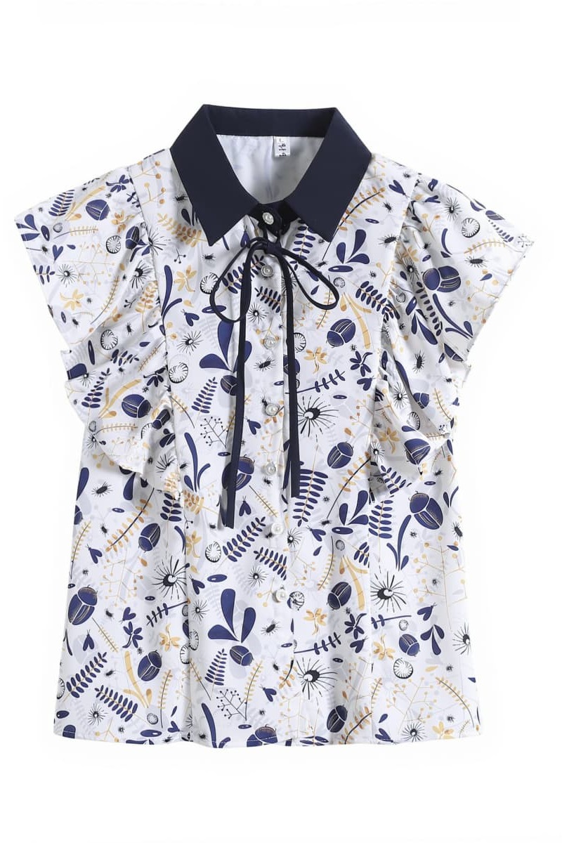 실사 슬림해 보이는 반팔 프린트 셔츠 품질 패션 Feifei 소매 쉬폰 블라우스 나비 넥타이 셔츠
