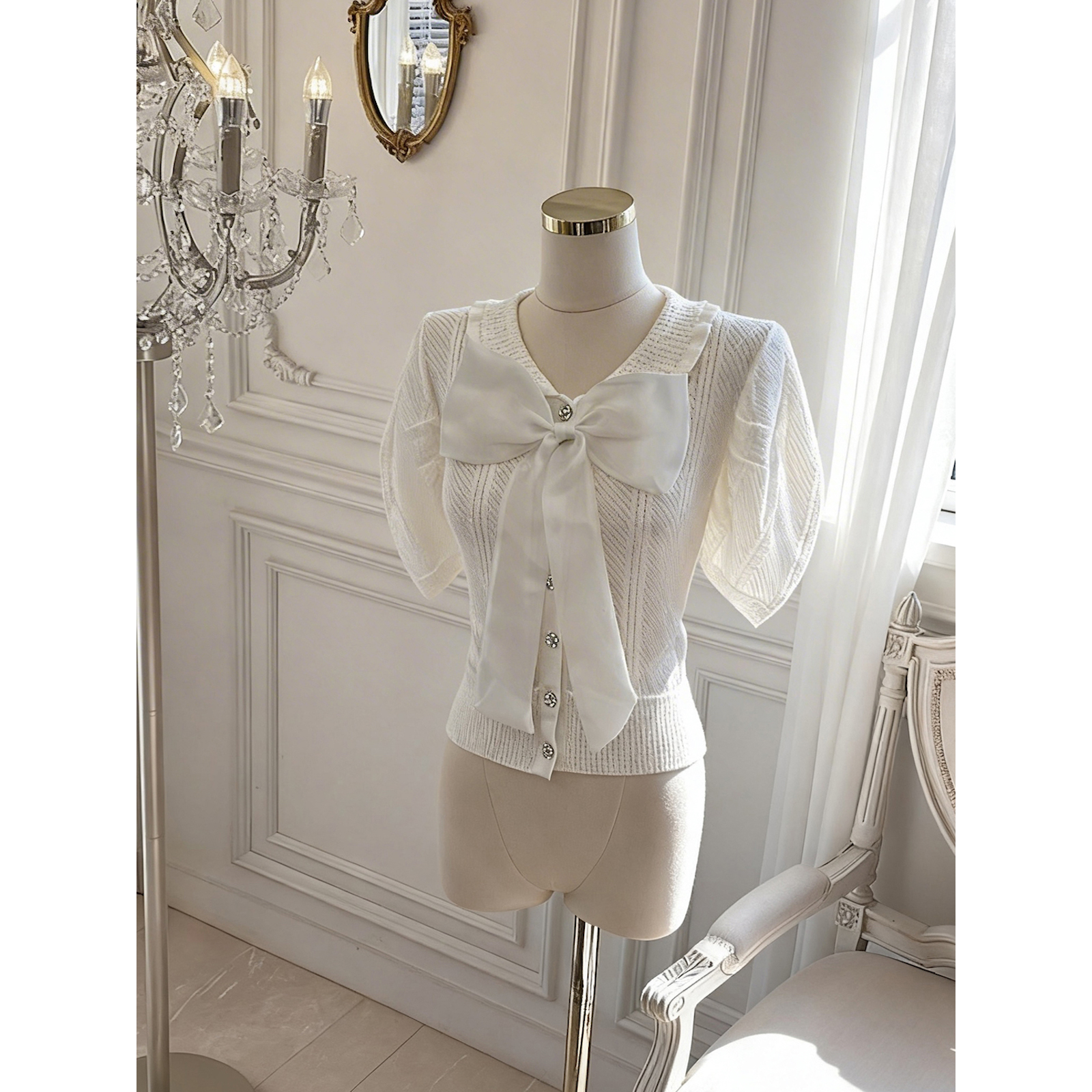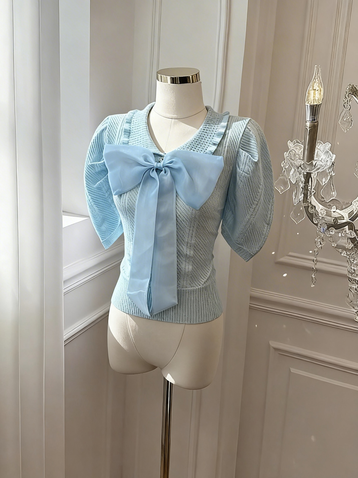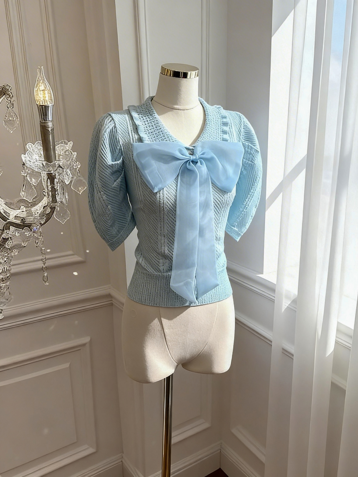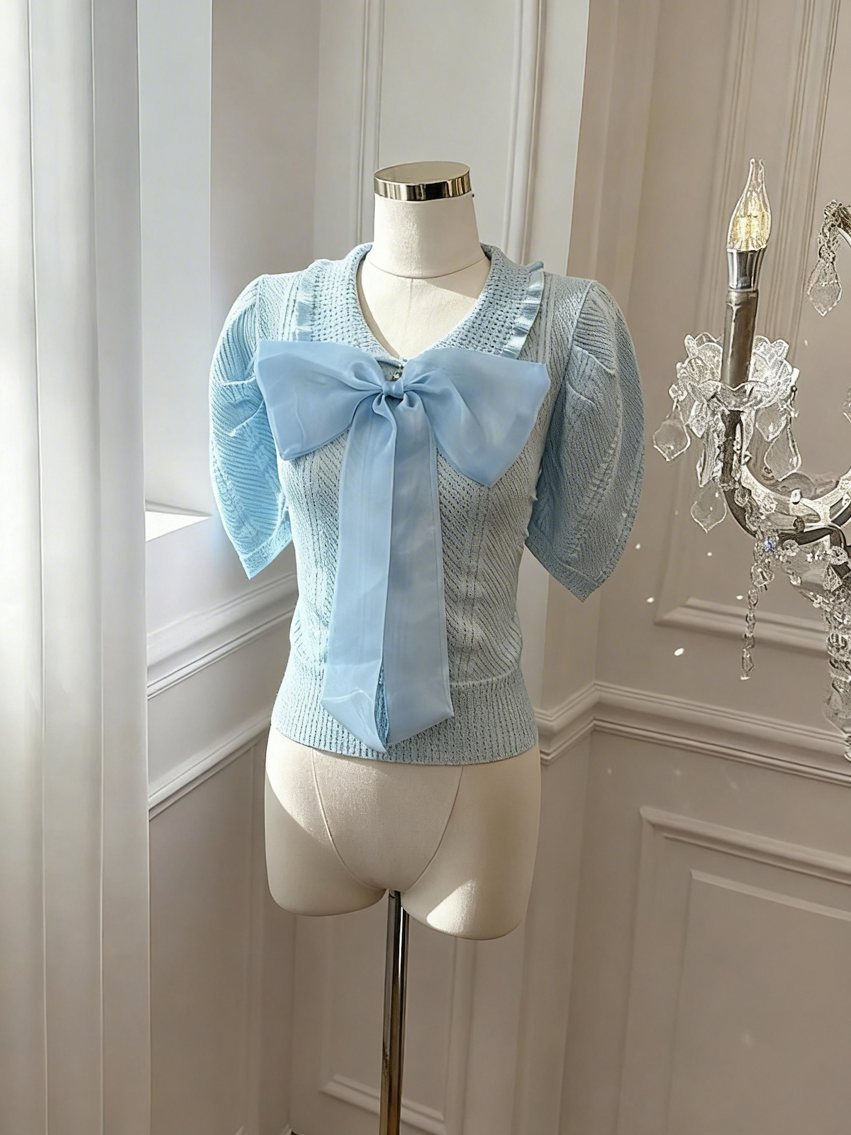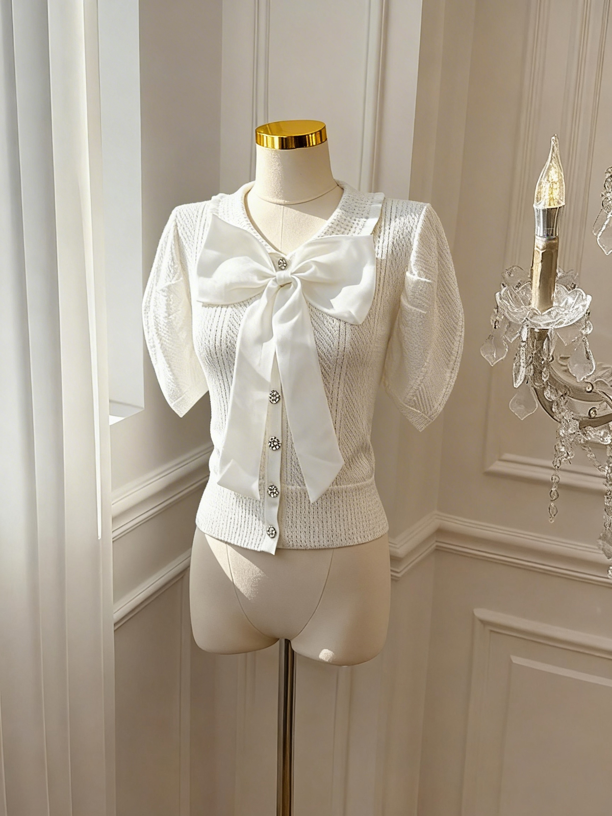 정가 있음 보호 베이비 칼라 얼음 실크 반팔 티셔츠 여름 한국 스타일 쇼트 스타일 나비 매듭 거품 소매 니트 스웨터