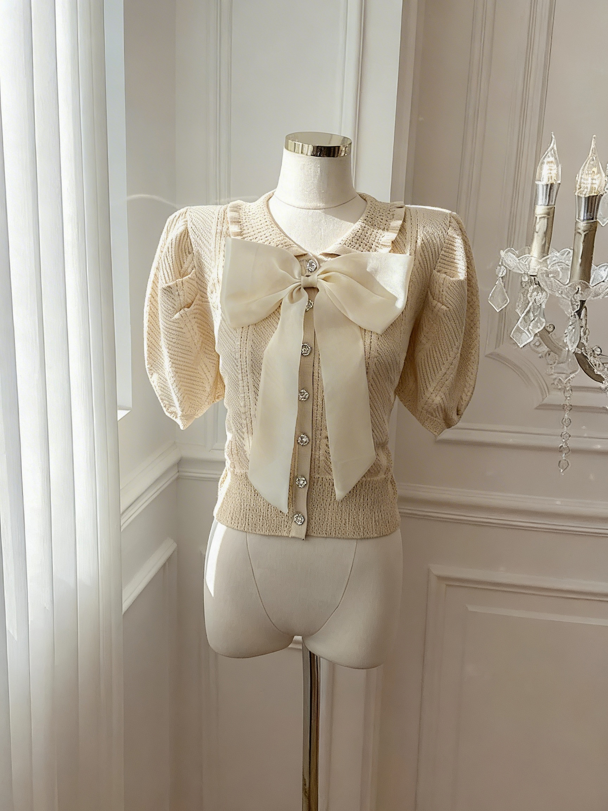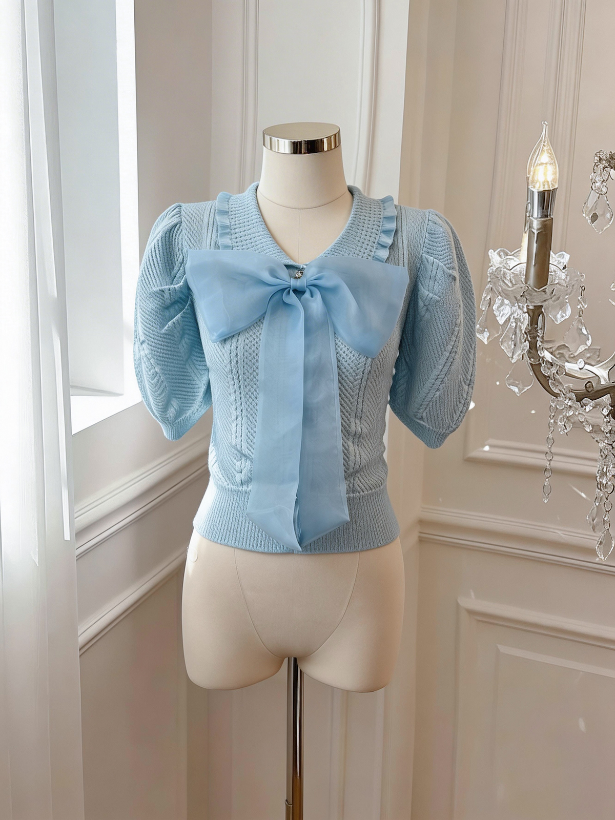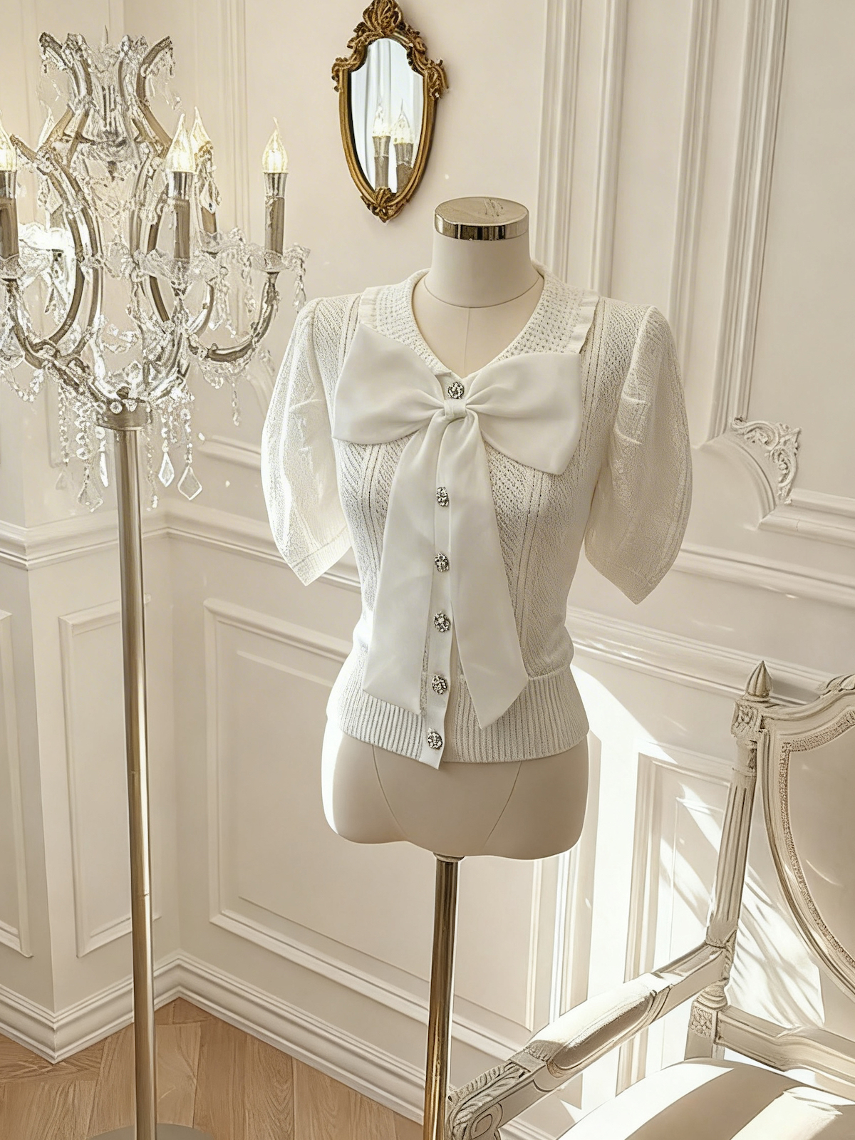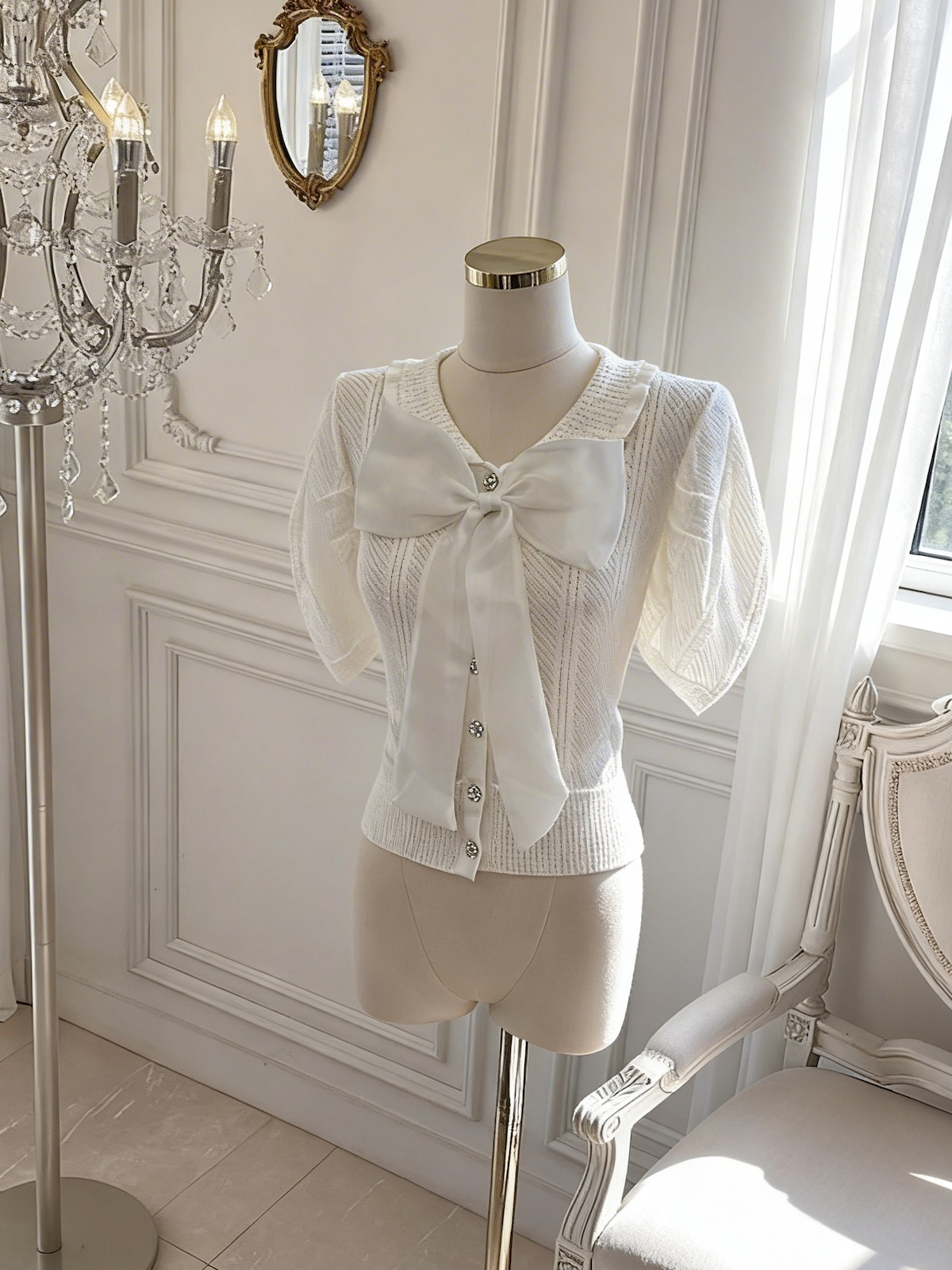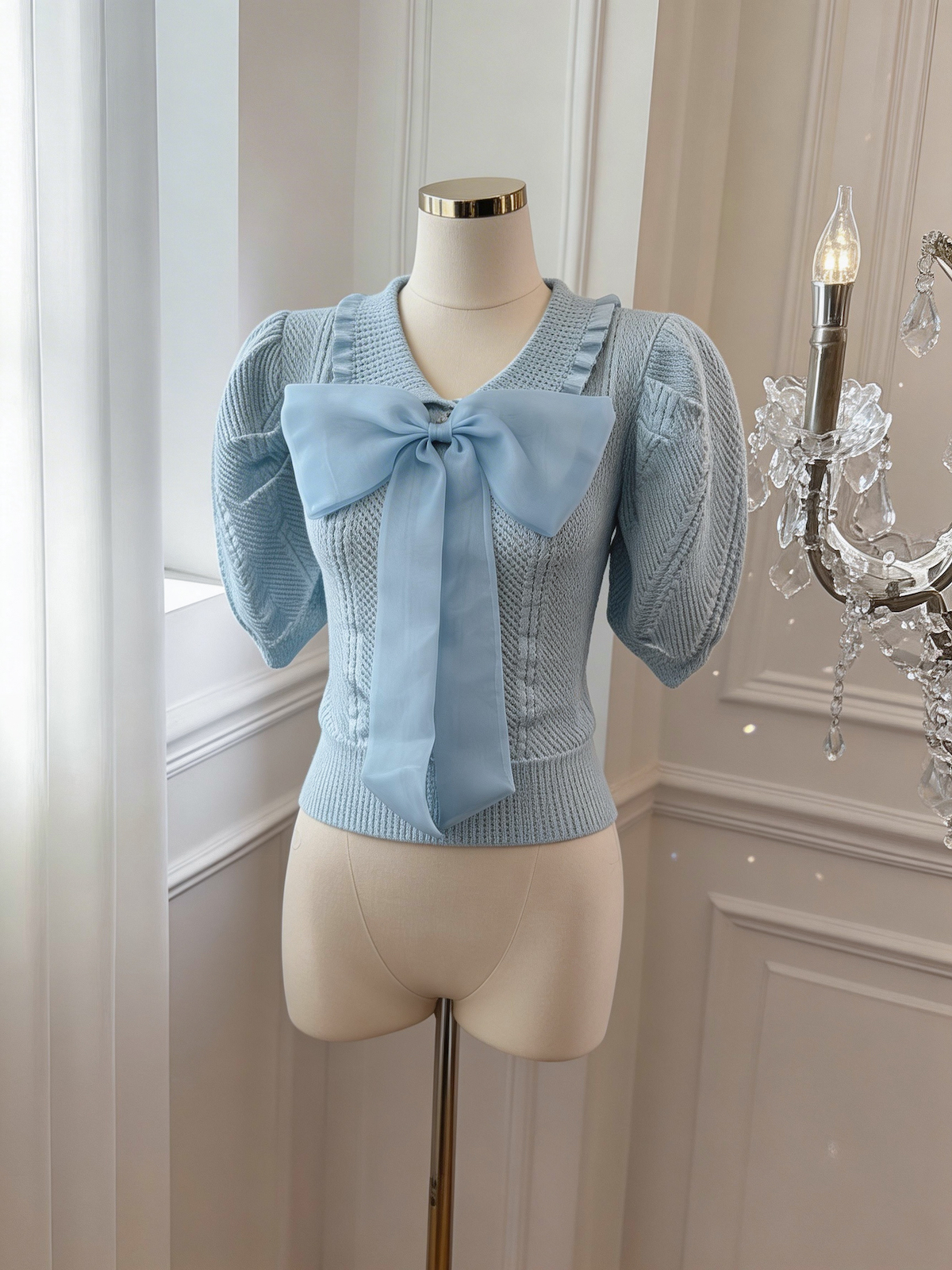 정가 있음 보호 베이비 칼라 얼음 실크 반팔 티셔츠 여름 한국 스타일 쇼트 스타일 나비 매듭 거품 소매 니트 스웨터