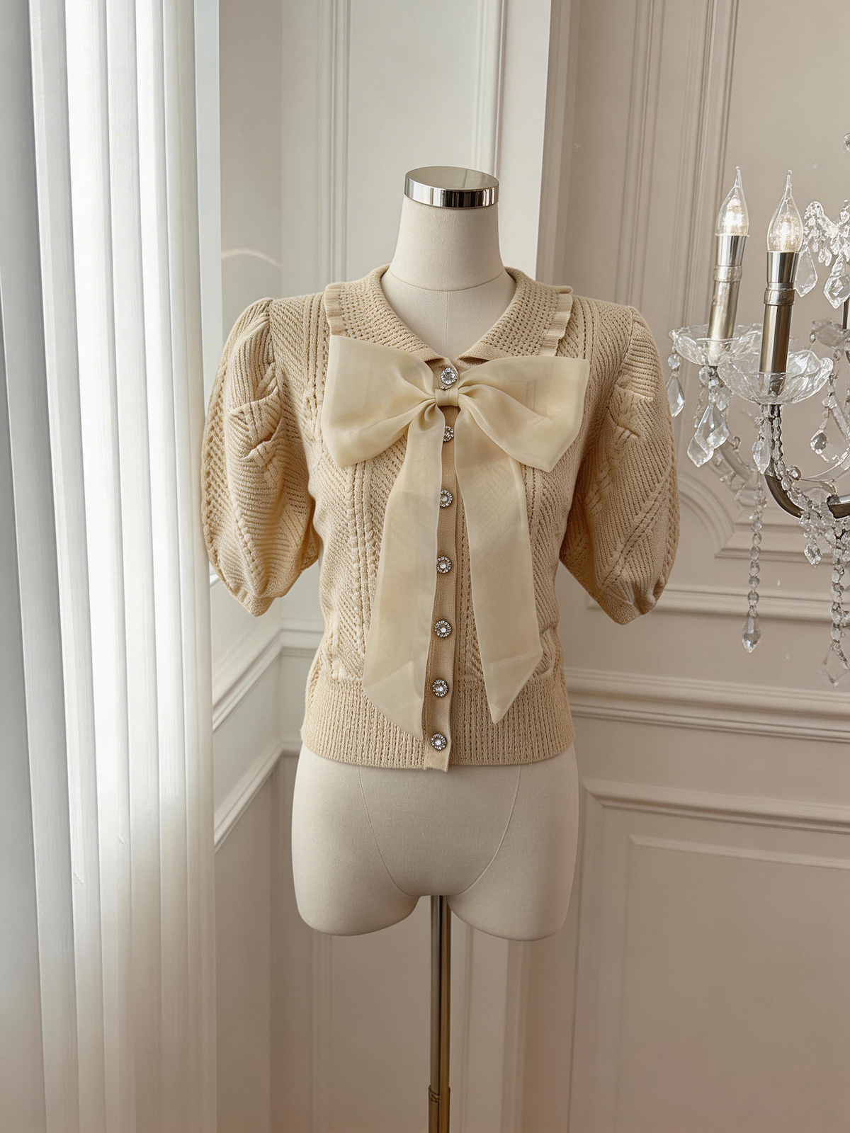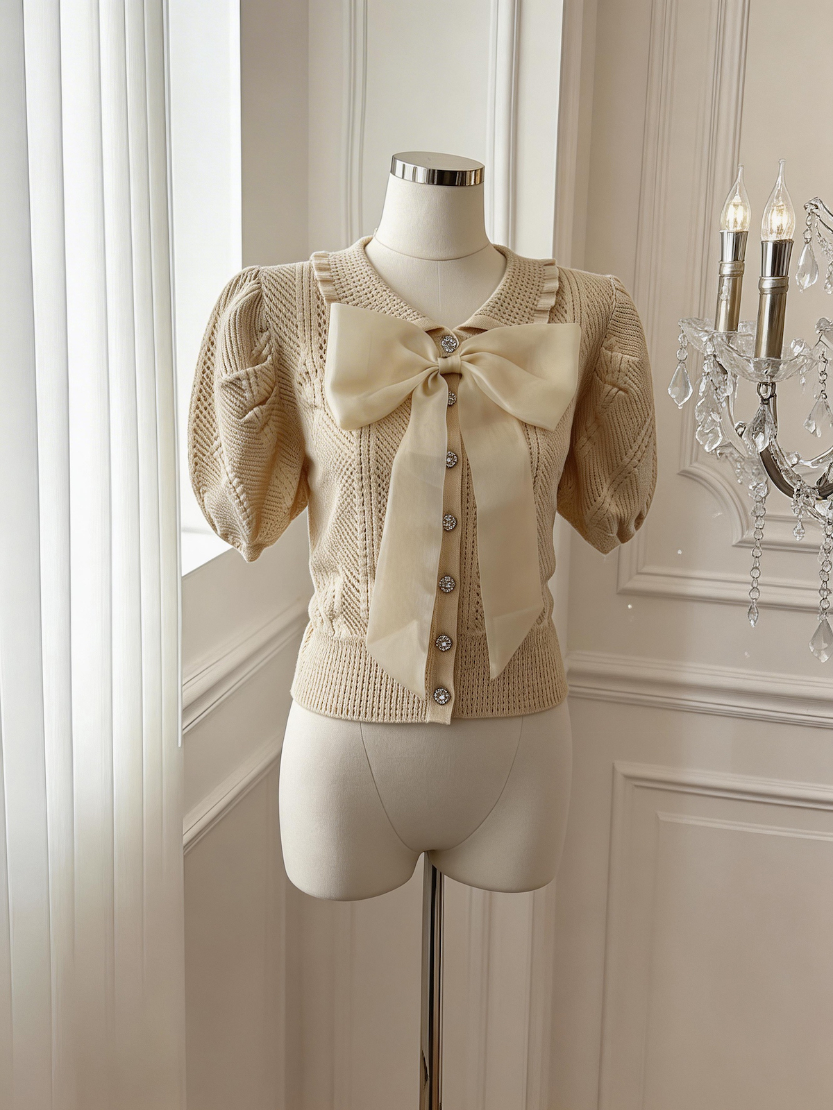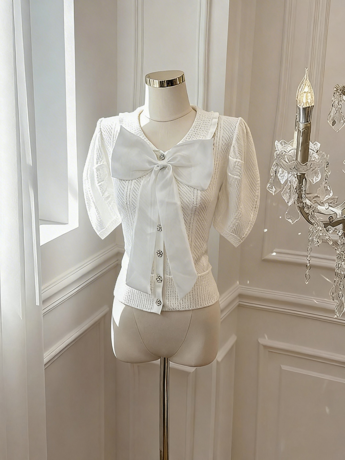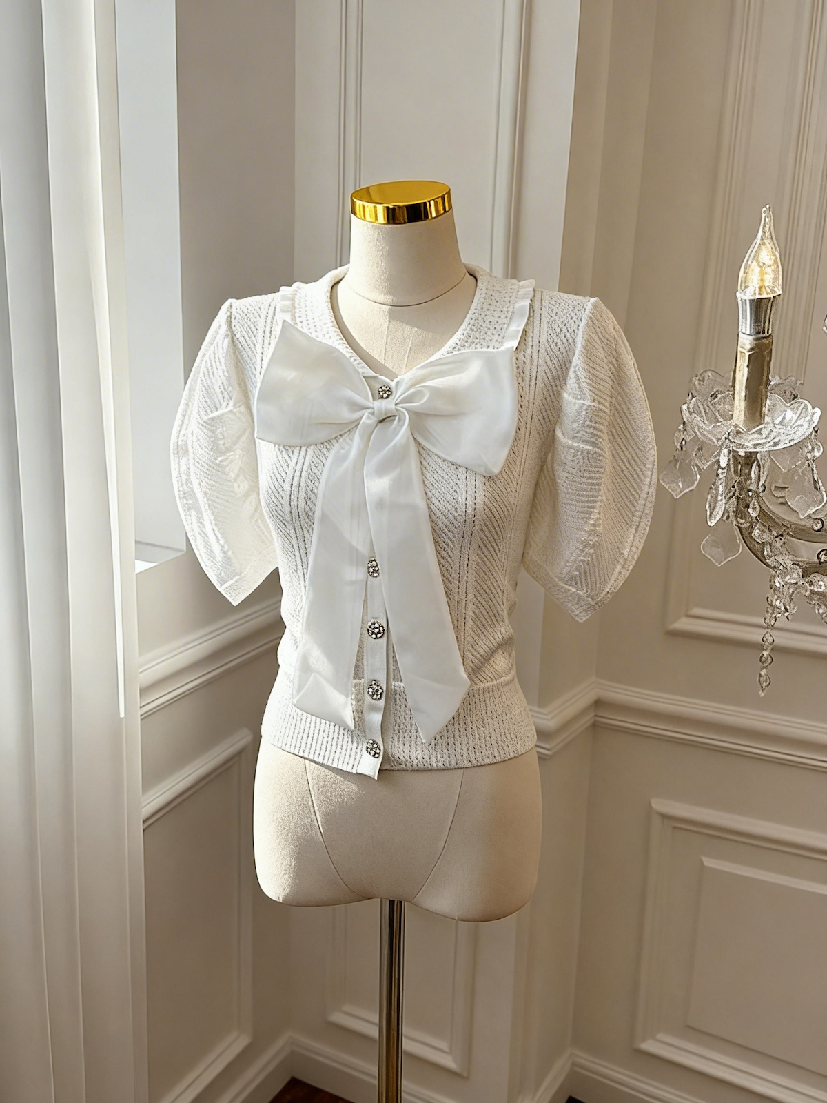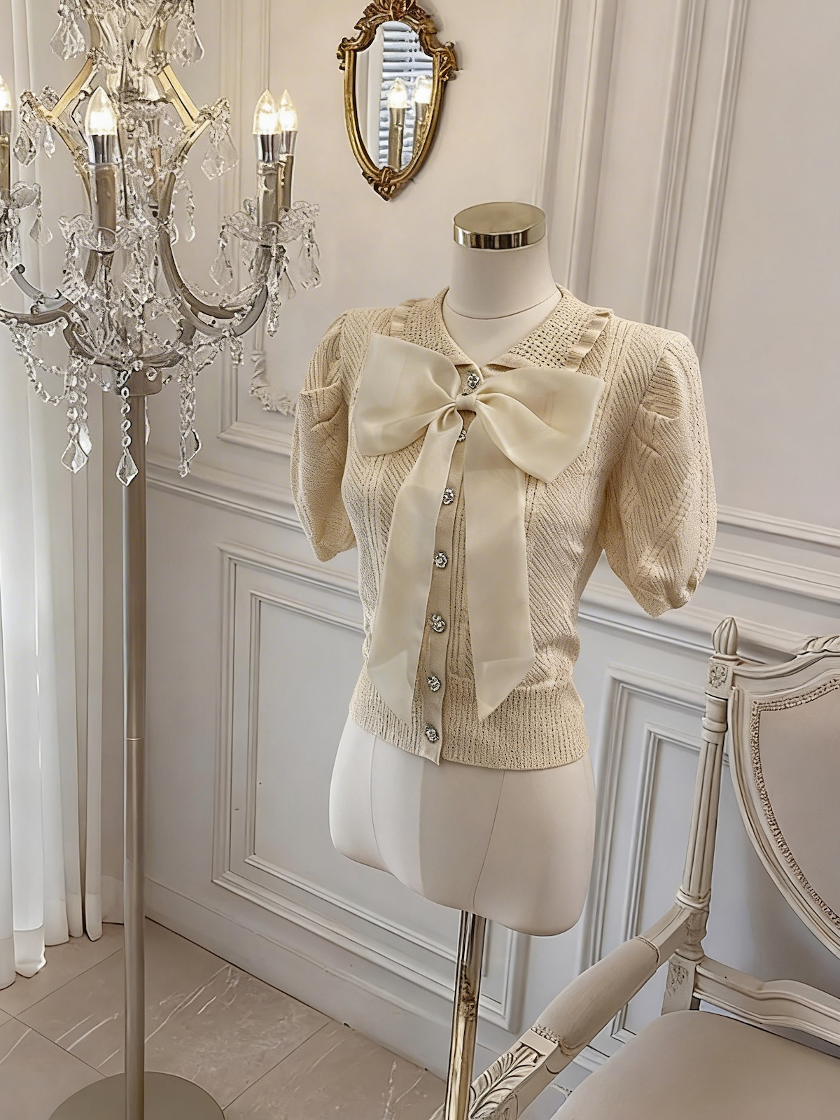 정가 있음 보호 베이비 칼라 얼음 실크 반팔 티셔츠 여름 한국 스타일 쇼트 스타일 나비 매듭 거품 소매 니트 스웨터