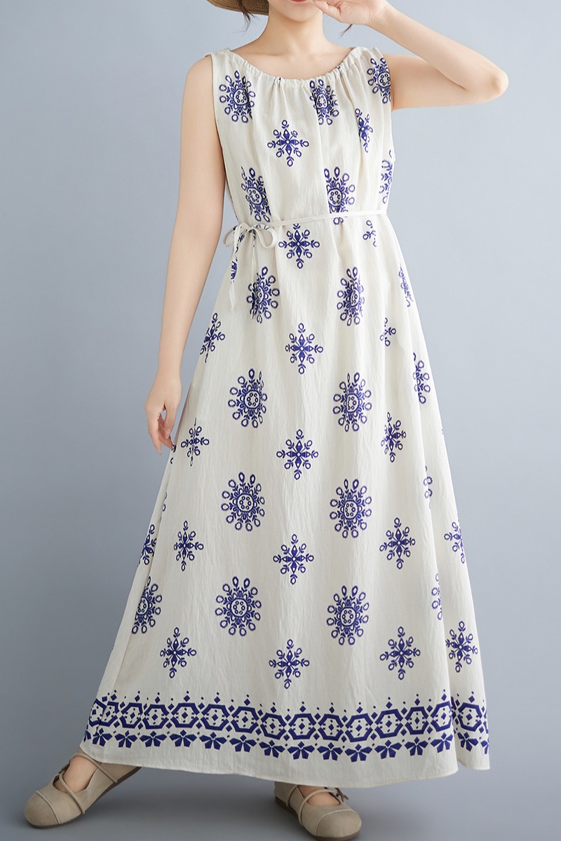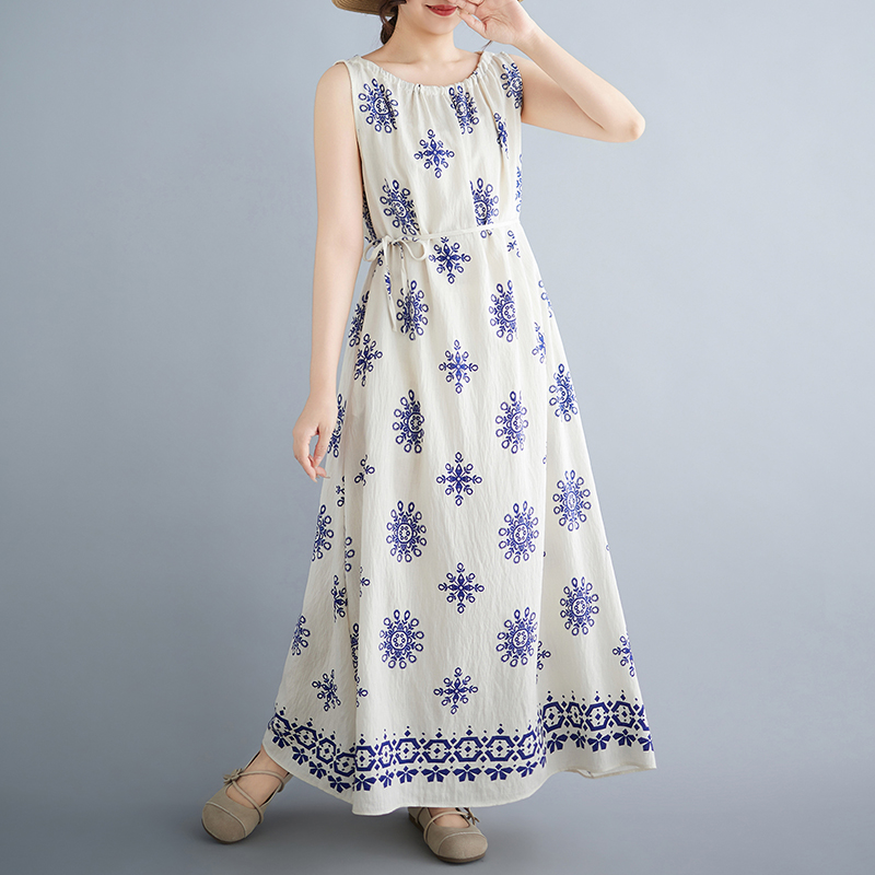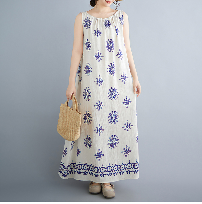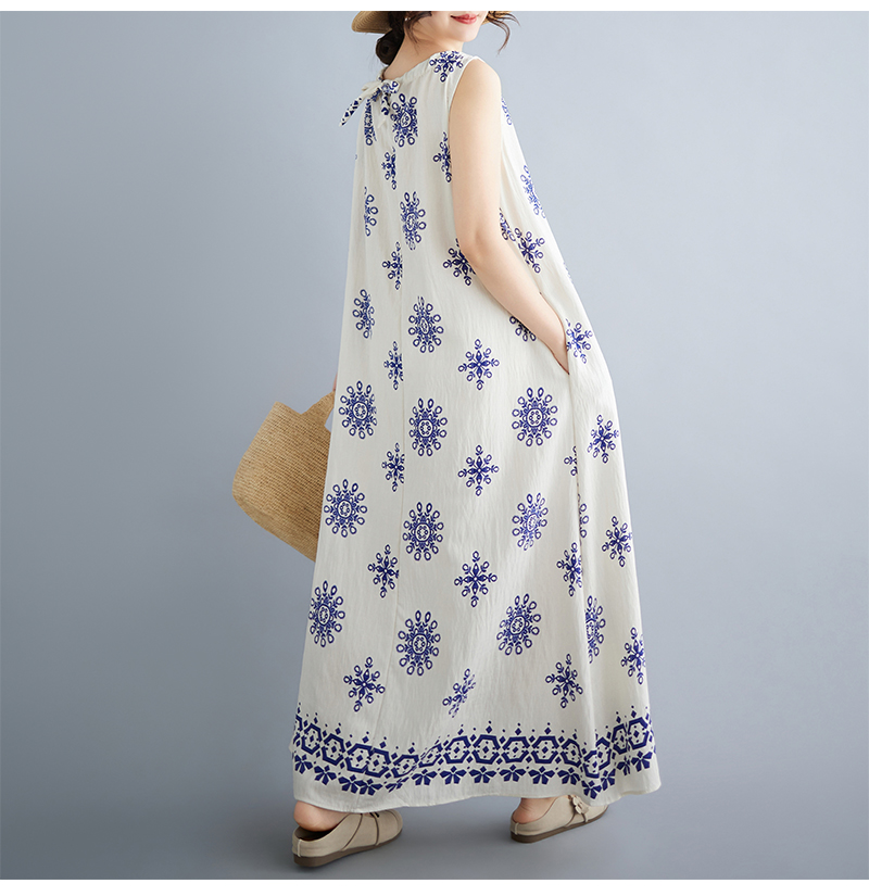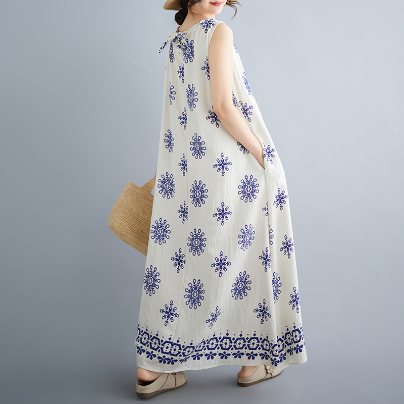 실사 2026 여름 디자인 센스 루즈핏 민족 스타일 프린트 여성 드레스 품격 여행 휴가 바람 롱 스커트
