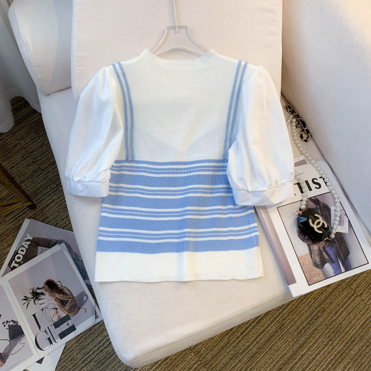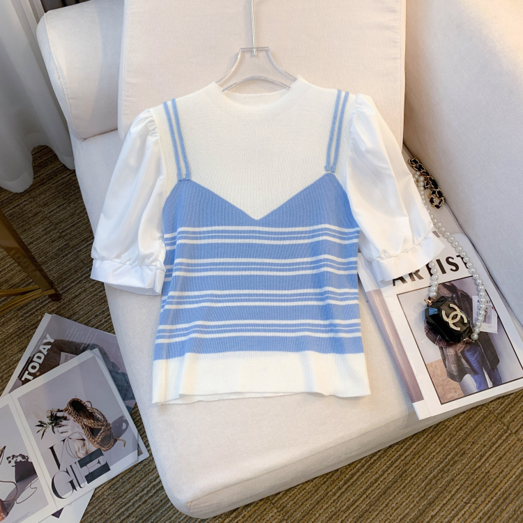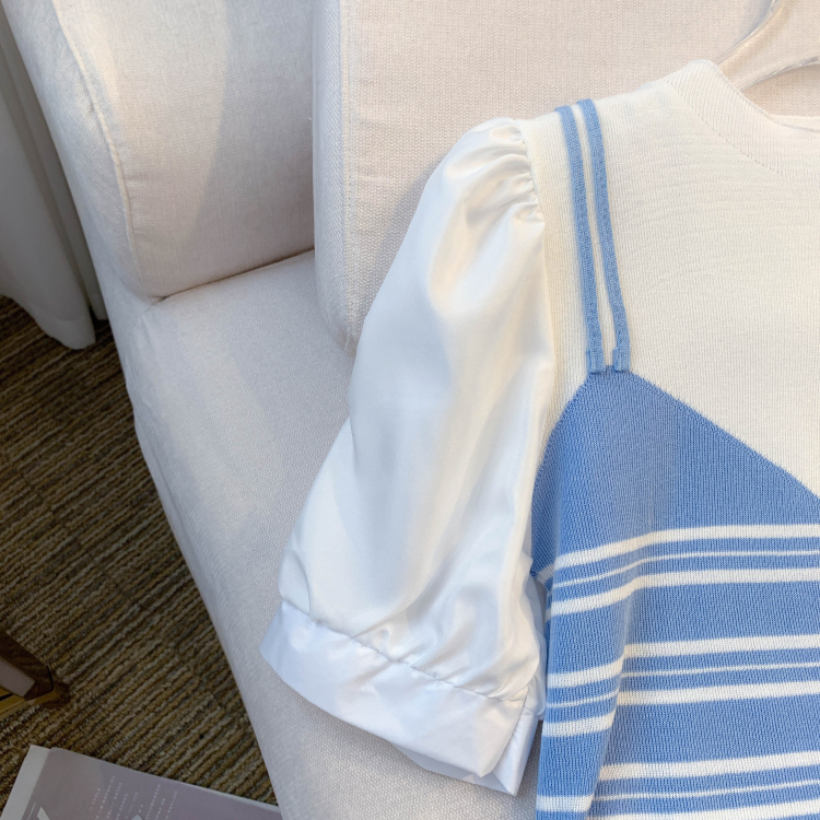 실사 대 물품 2026 여름 새로운 ins 디자인 센스 반팔 티셔츠 작은 대중 얼음 실크 니트 패치워크 맨위 여성