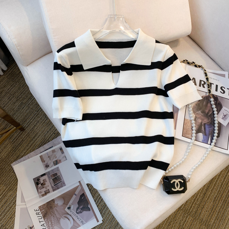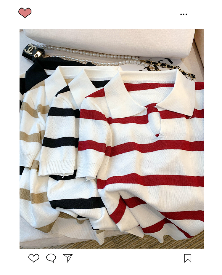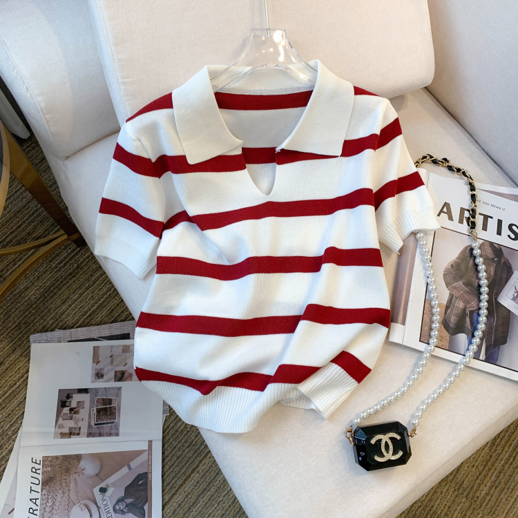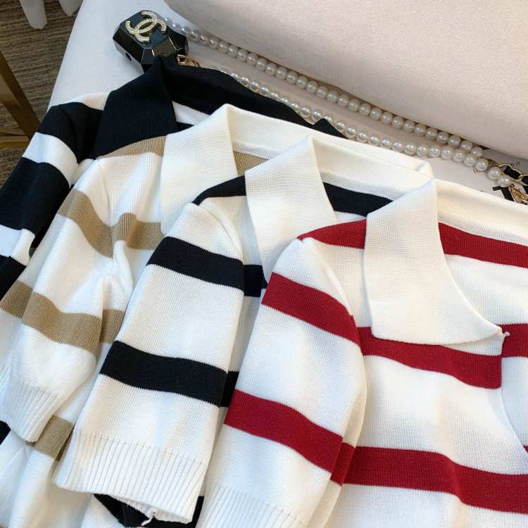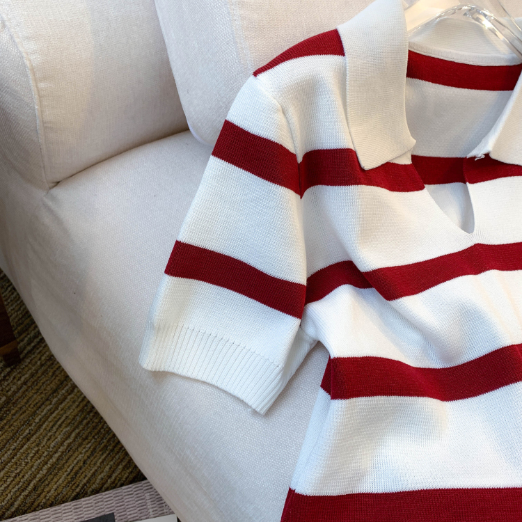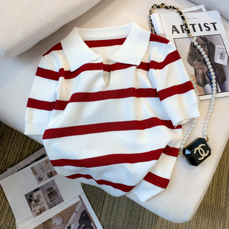 실사 대 물품 2026 여름 새로운 디자인 센스 무지개 스트라이프 POLO 칼라 티셔츠 얇은 스타일 얼음 실크 니트 여성