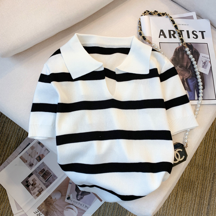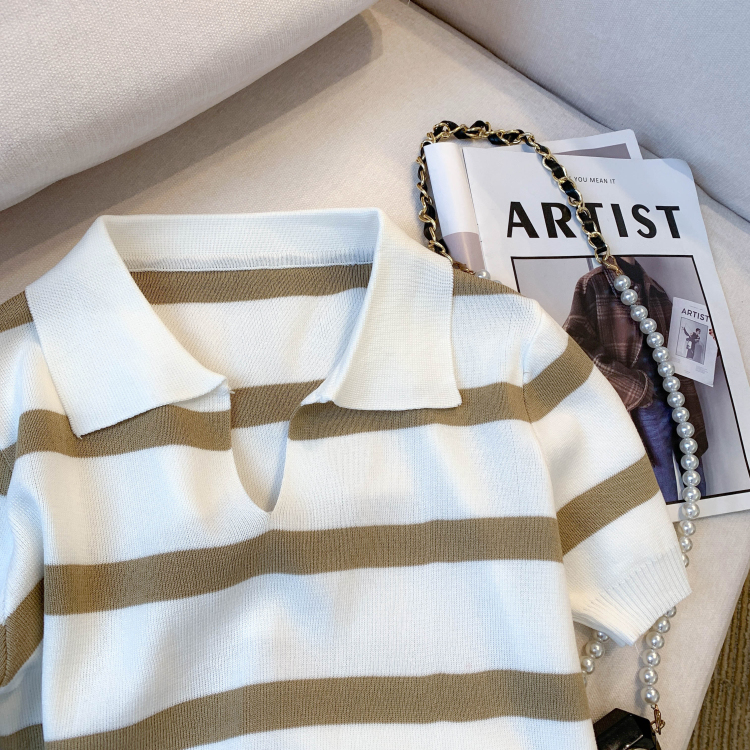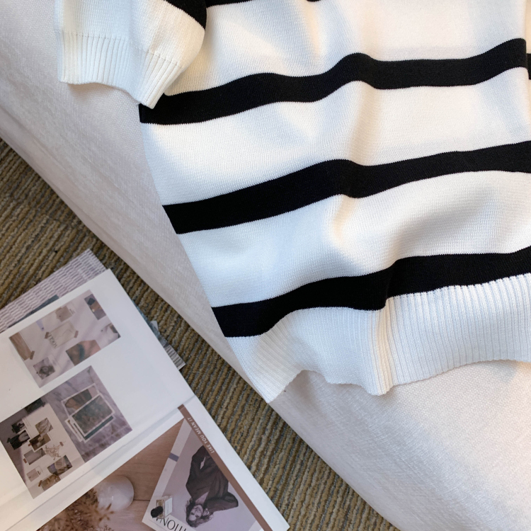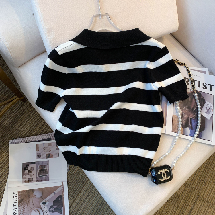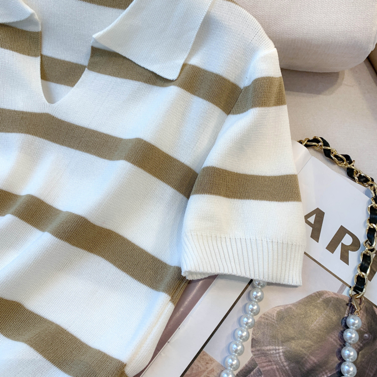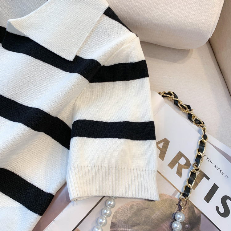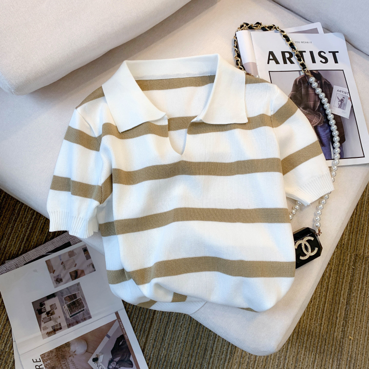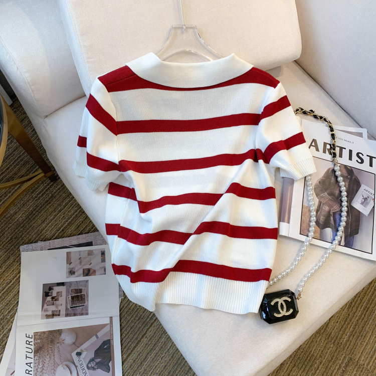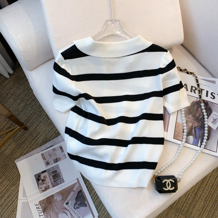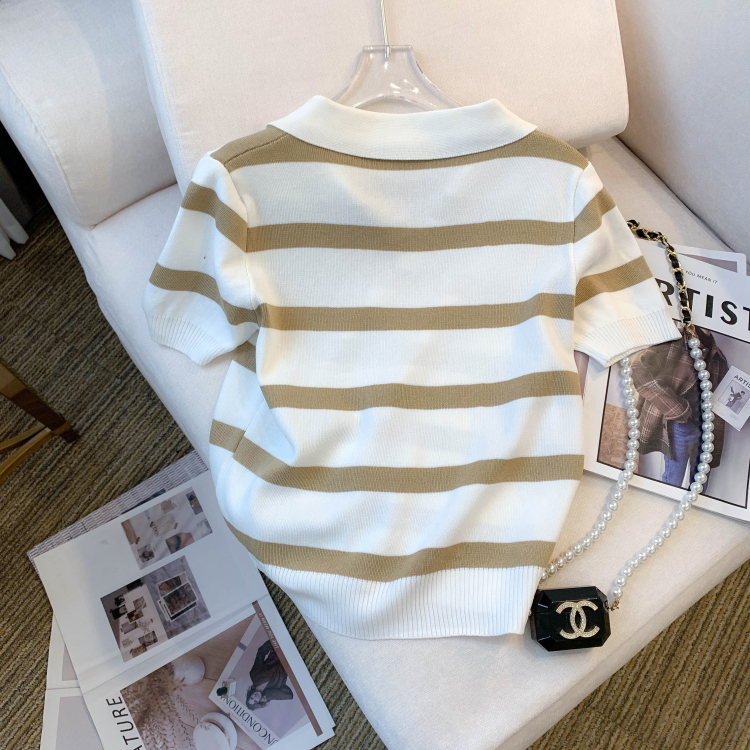 실사 대 물품 2026 여름 새로운 디자인 센스 스트라이프 하프 오픈 가디건 반팔 맨위 티셔츠 얼음 실크 니트 스웨터 여성