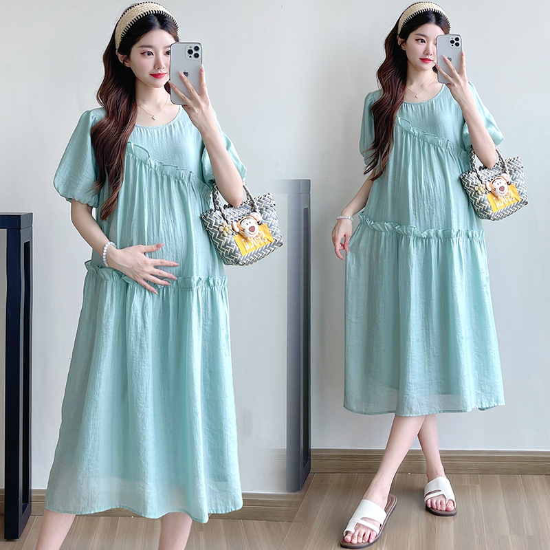 2026 여름 새로운 출산 착용 낭만주의 캐주얼 레이스업 허리 수축 롱 스커트 루즈핏 임산부 드레스