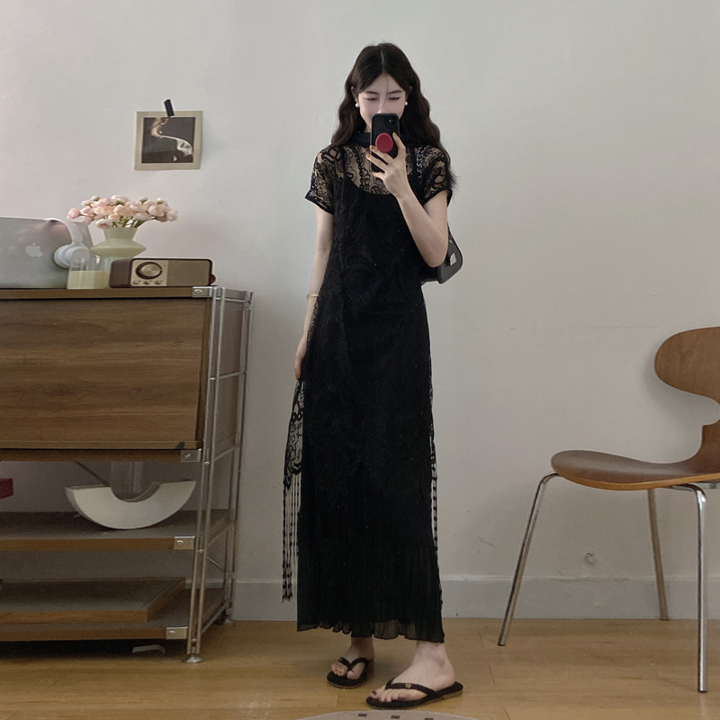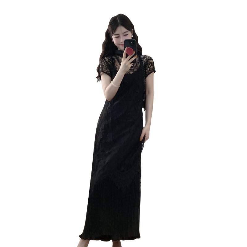 실사 빅 사이즈 감정 의기 양양하게 치파오 레이스 술 디자인 센스 투피스 세트 품격 드레스