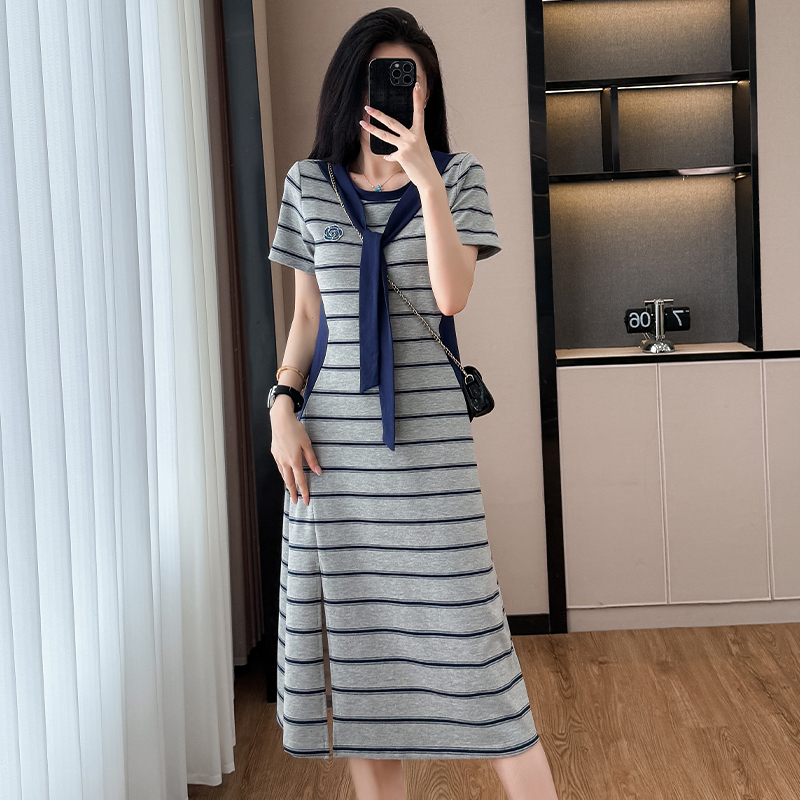 실사 작은 키 구름 실 패치워크 드레스 슬림해 보이는 표지 고기 레이스 커프스 중간 길이 빅 사이즈 티셔츠 치마 여성 여름