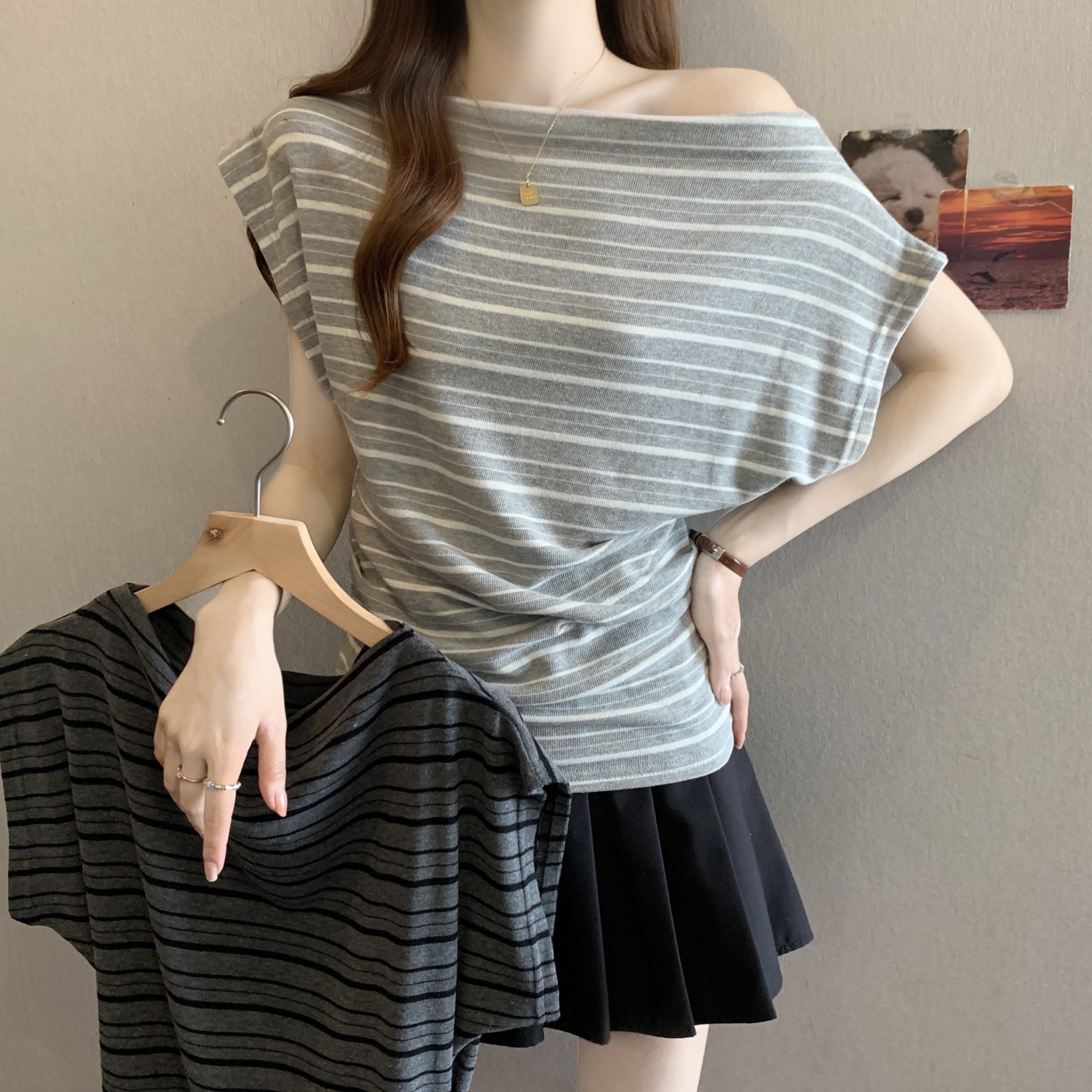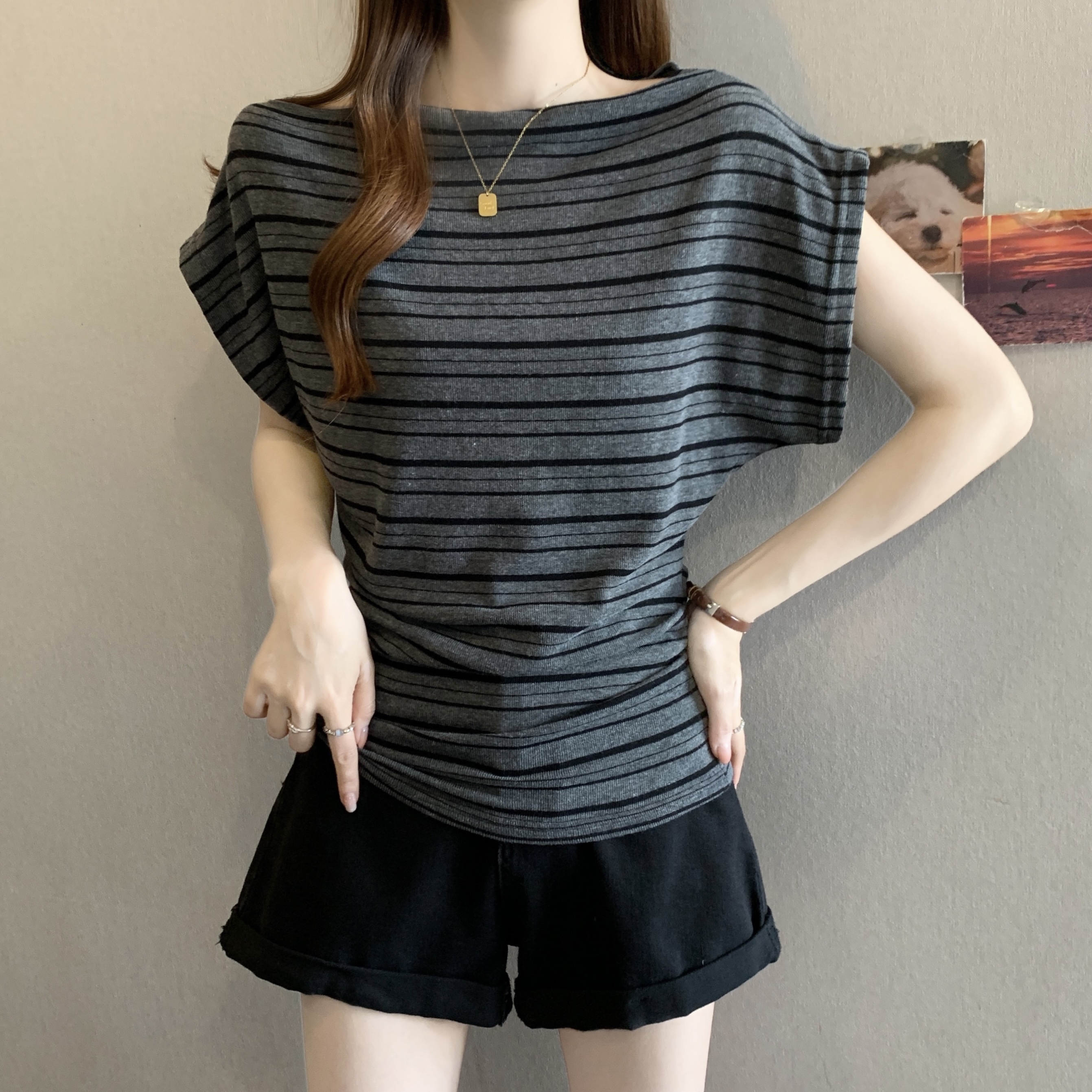 실사 빅 사이즈 지방 mm 고유 한 품격 질감 센스 비스듬한 어깨 의류 보트넥 오프숄더 슬림해 보이는 반팔 티셔츠