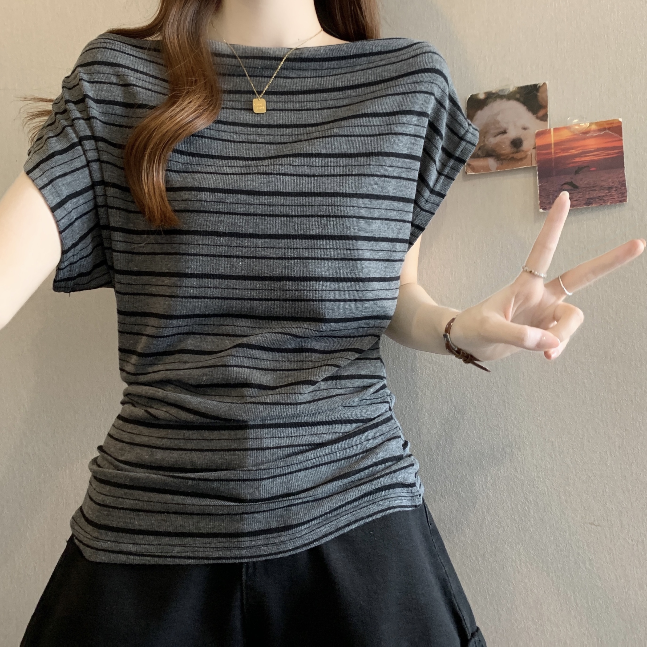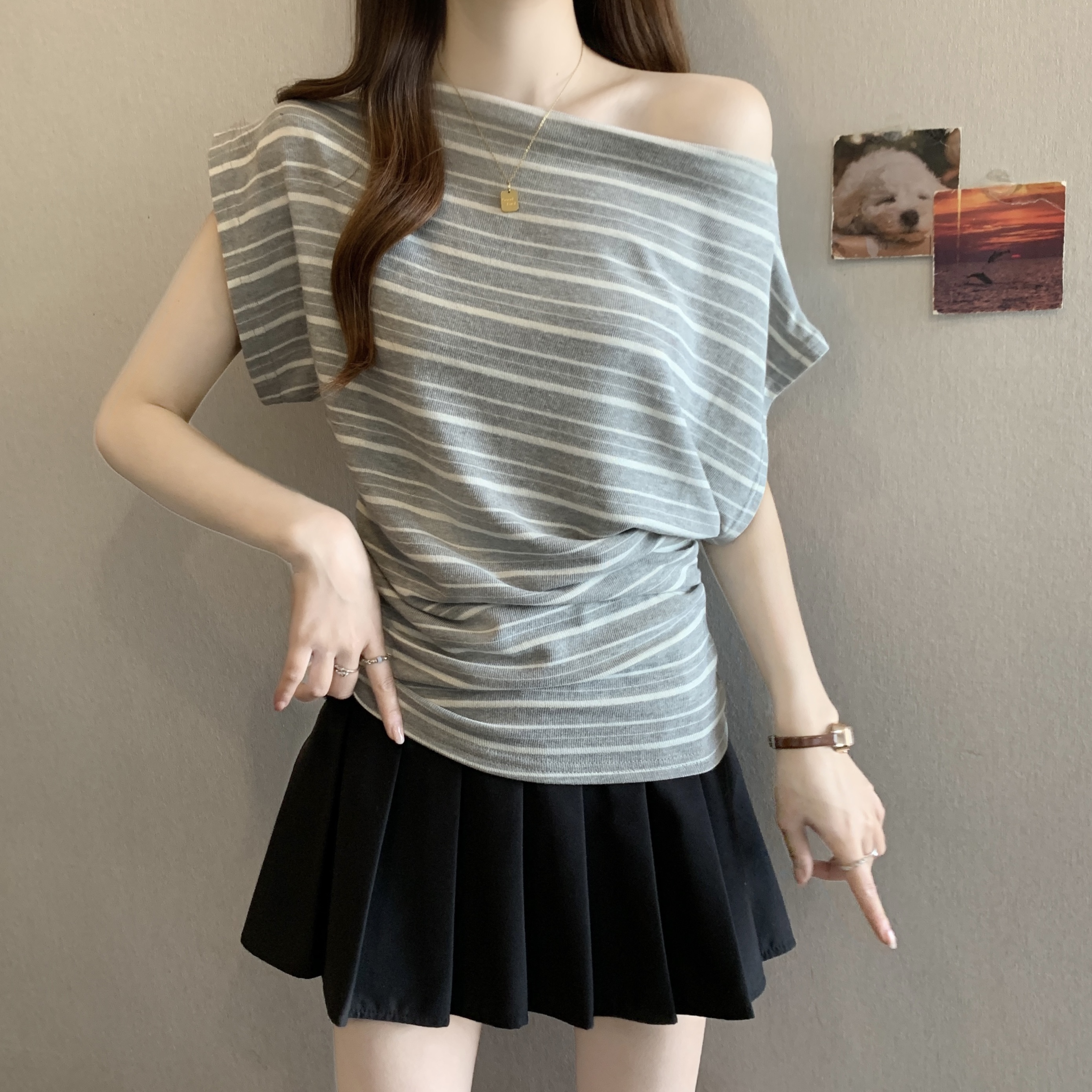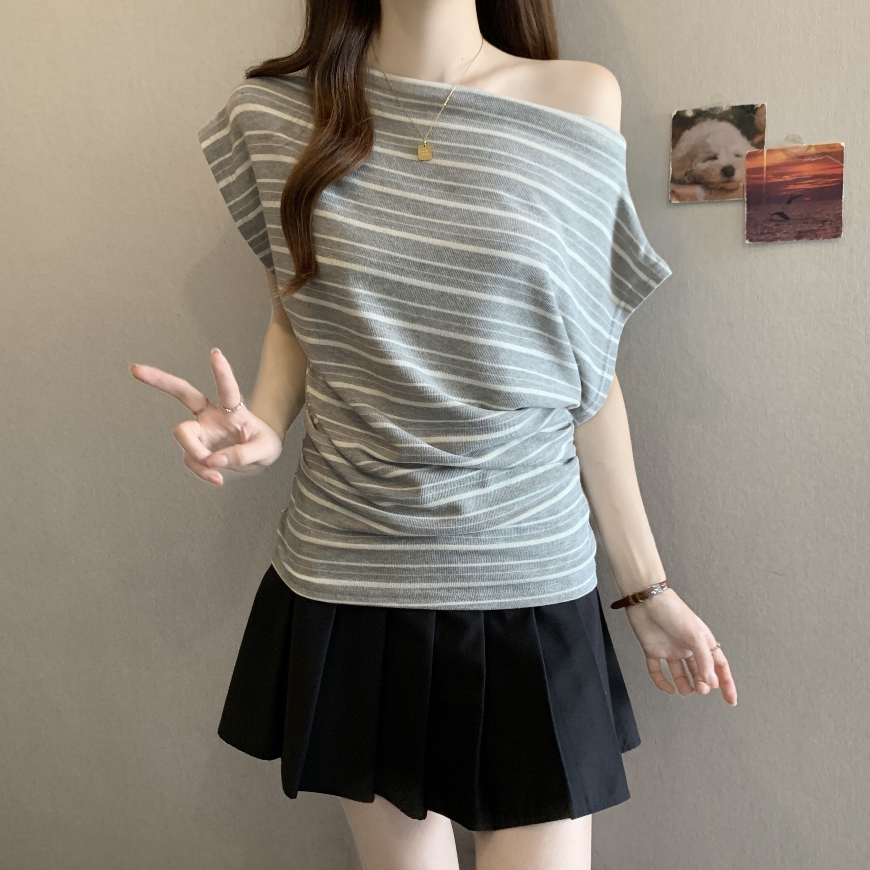 실사 2808# 마이크로 지방 mm 순수한 욕망 핫걸 오프숄더 스트라이프 반팔 티셔츠 주름 허리 수축 슬림해 보이는 비스듬한 어깨 의류