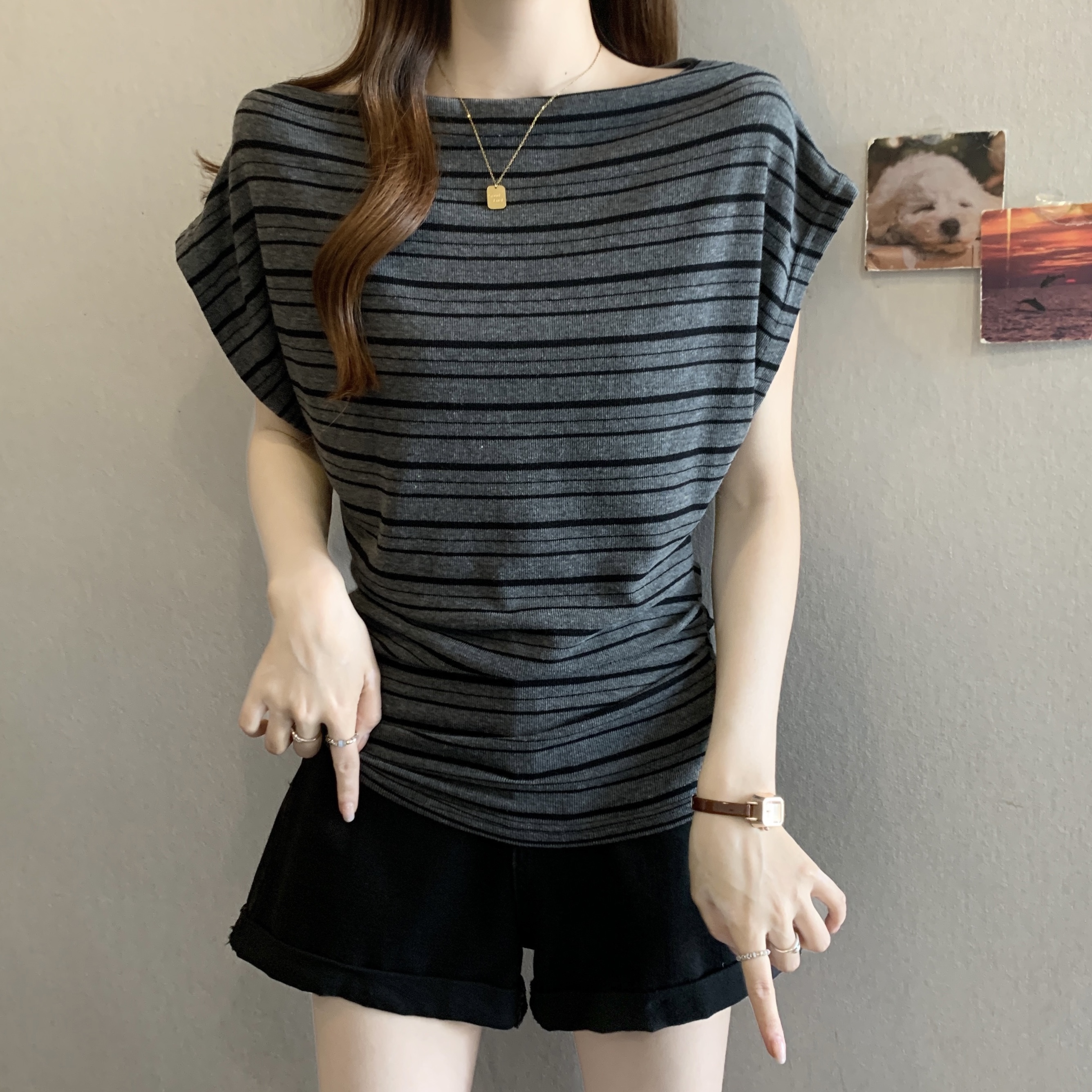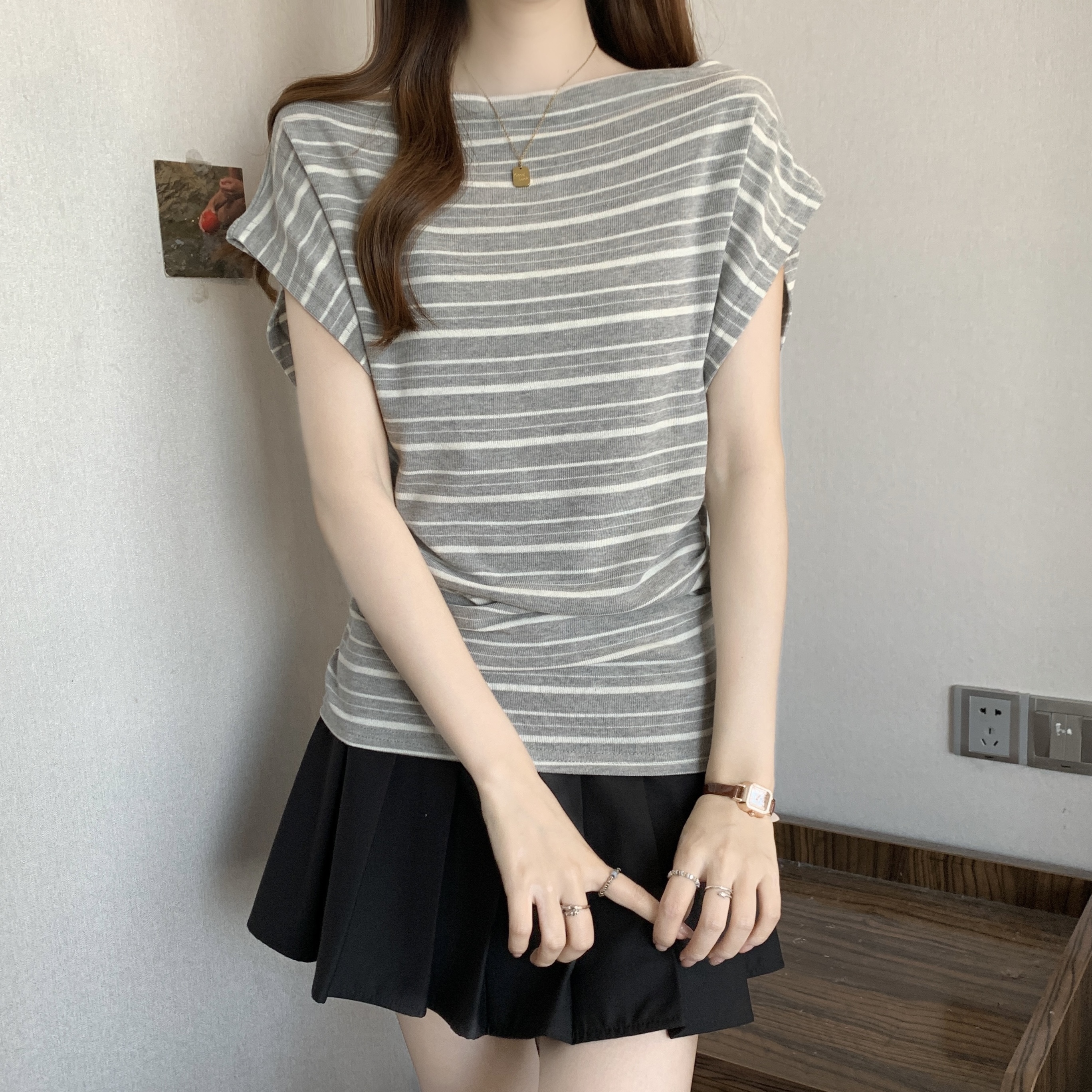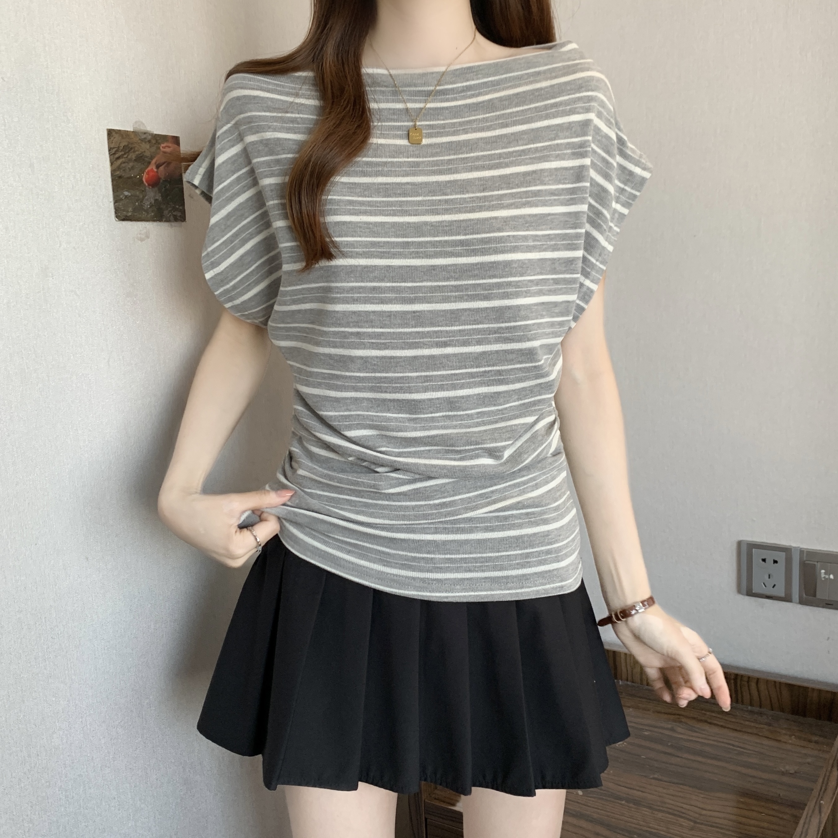 실사 2808# 마이크로 지방 mm 순수한 욕망 핫걸 오프숄더 스트라이프 반팔 티셔츠 주름 허리 수축 슬림해 보이는 비스듬한 어깨 의류