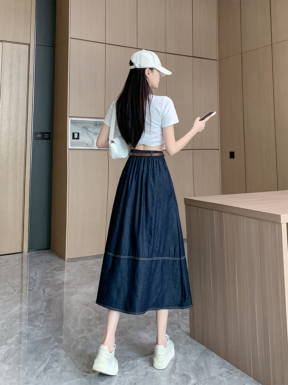 실사 빅 사이즈 여성 의류 2026 봄 한국 스타일 주간 실크 데님 반신 롱 스커트 마이크로 지방 mm 슬림해 보이는 빅 플레어 스커트