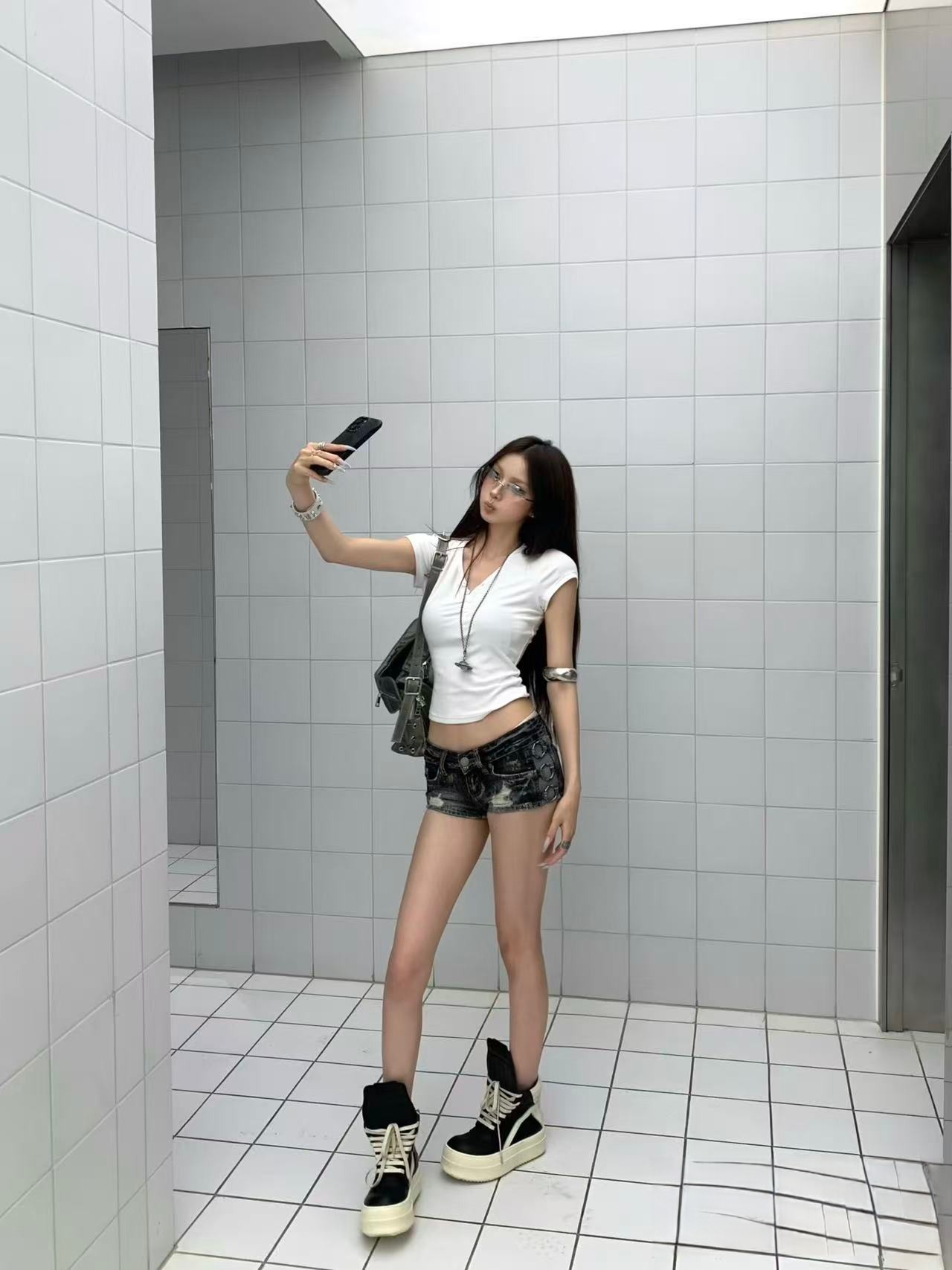 아메리칸 레트로 슈퍼 무거운 작업 원형 고리 로우 웨이스트 워싱 마 오래된 다림질 금박 데님 반바지 아메리칸 핫걸 몸매 가꾸기 핫 바지