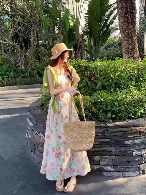 실사 프랑스식 꽃무늬 슬립 드레스 투피스 세트 고급 센스 허리 수축 슬림해 보이는 품격 휴가 바람 요정 롱 스커트
