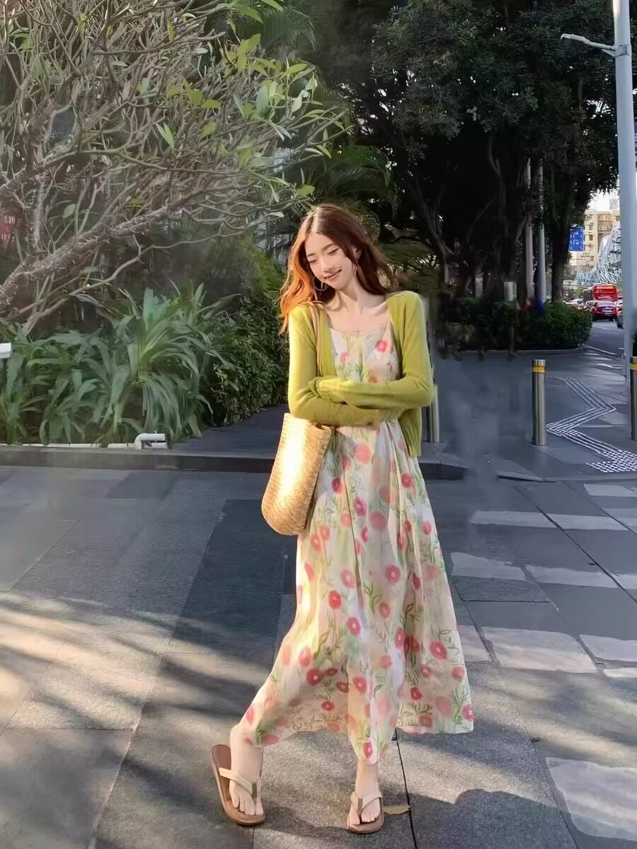 2026 섹션 프랑스식 고급 센스 작은 키 쉬폰 롱 스커트 녹색 꽃무늬 슬립 드레스 투피스 슈트 여성 여름