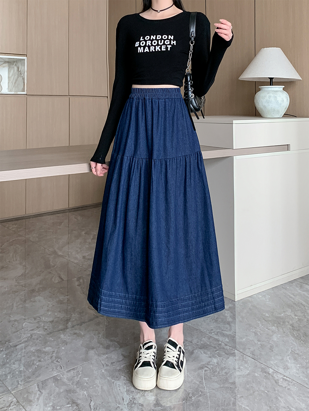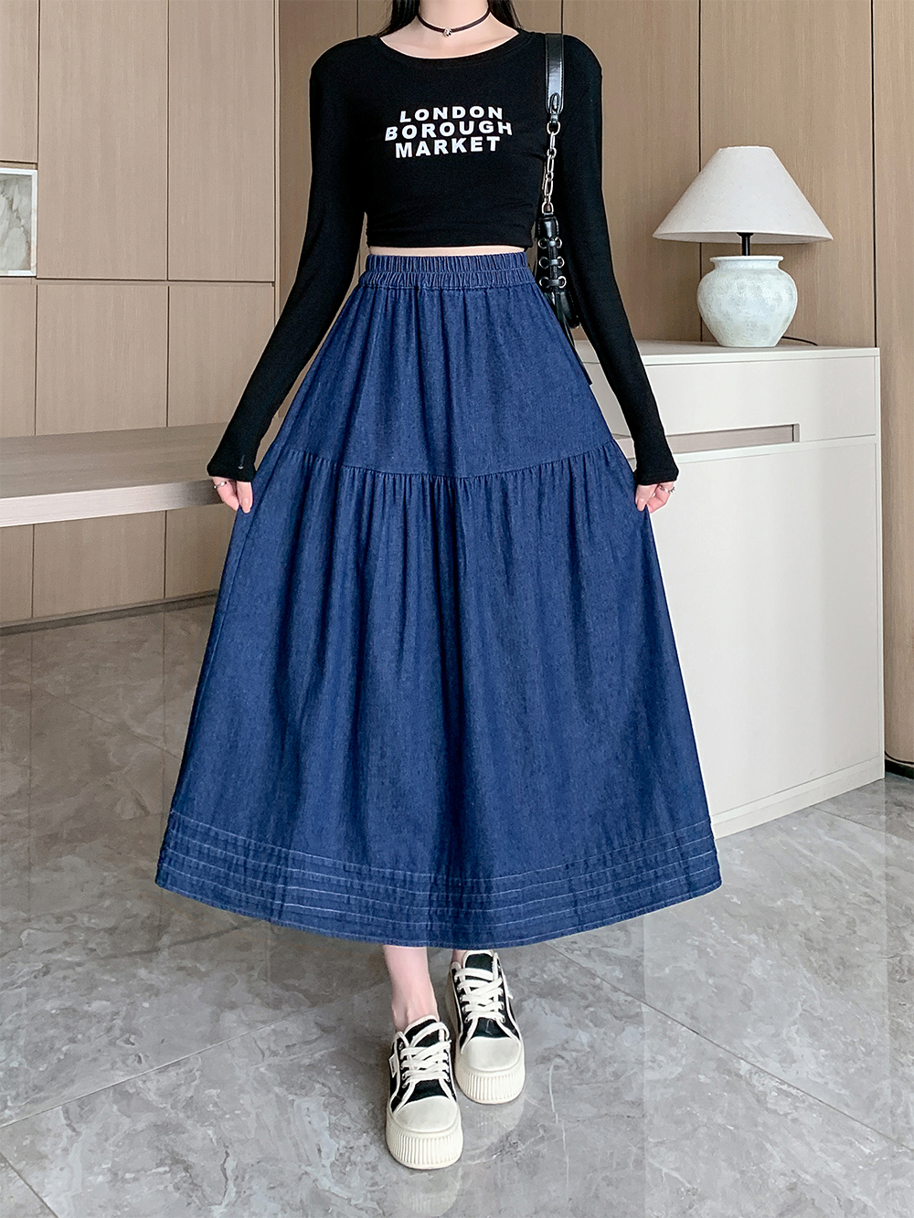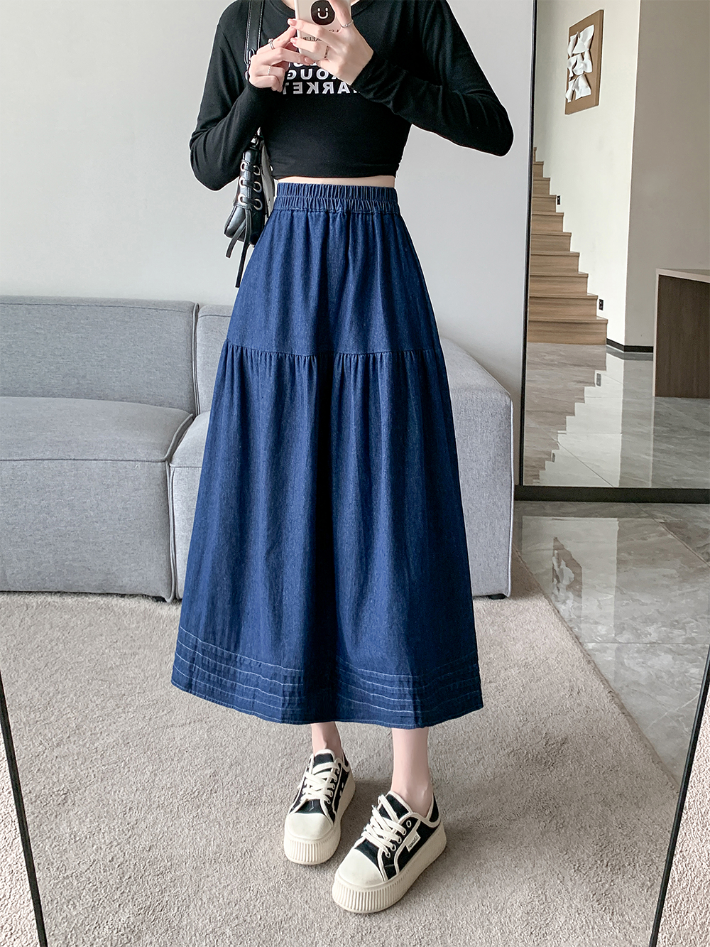 실사 빅 사이즈 여성 의류 2026 봄 한국 스타일 주간 실크 데님 반신 롱 스커트 마이크로 지방 mm 슬림해 보이는 빅 플레어 스커트