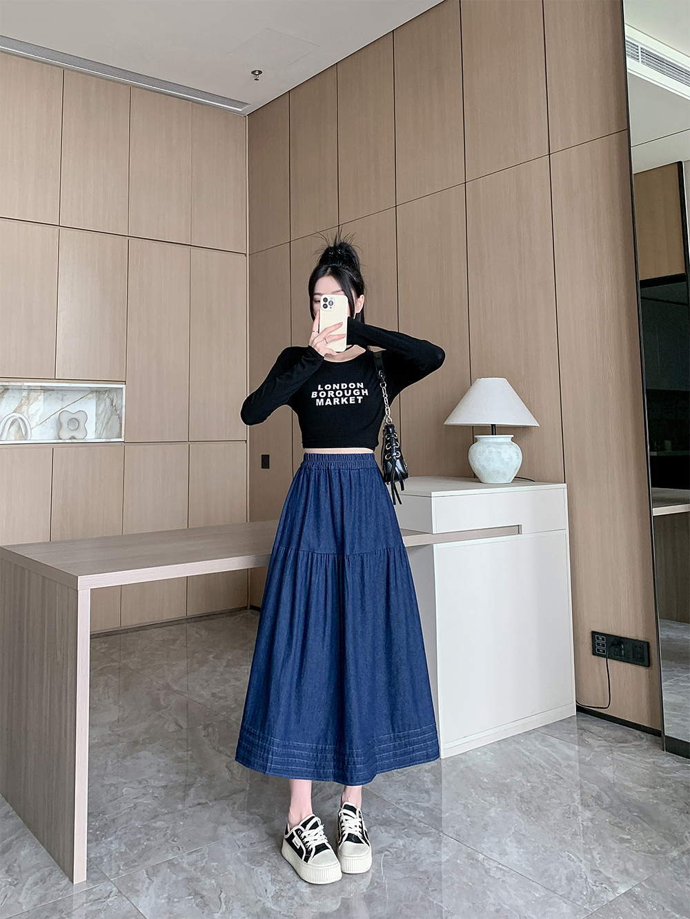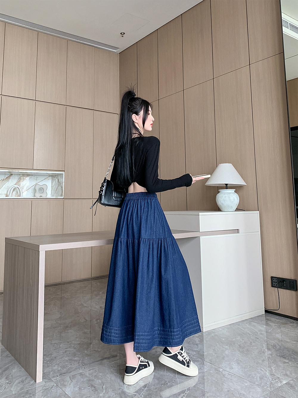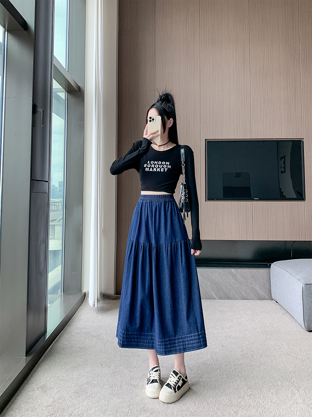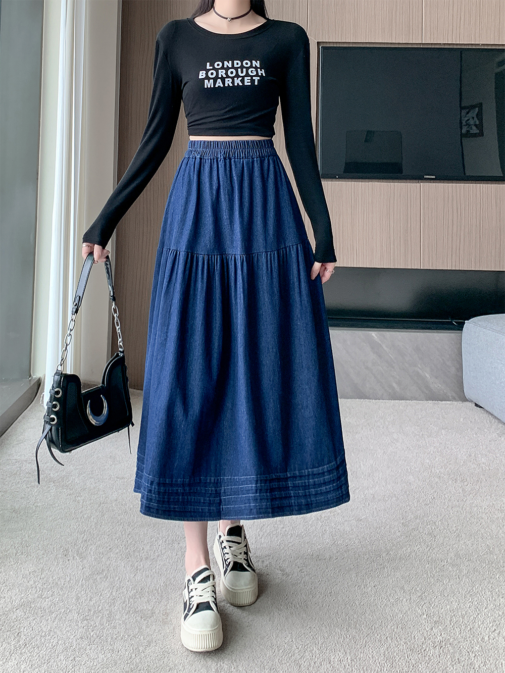 실사 빅 사이즈 여성 의류 2026 봄 한국 스타일 주간 실크 데님 반신 롱 스커트 마이크로 지방 mm 슬림해 보이는 빅 플레어 스커트