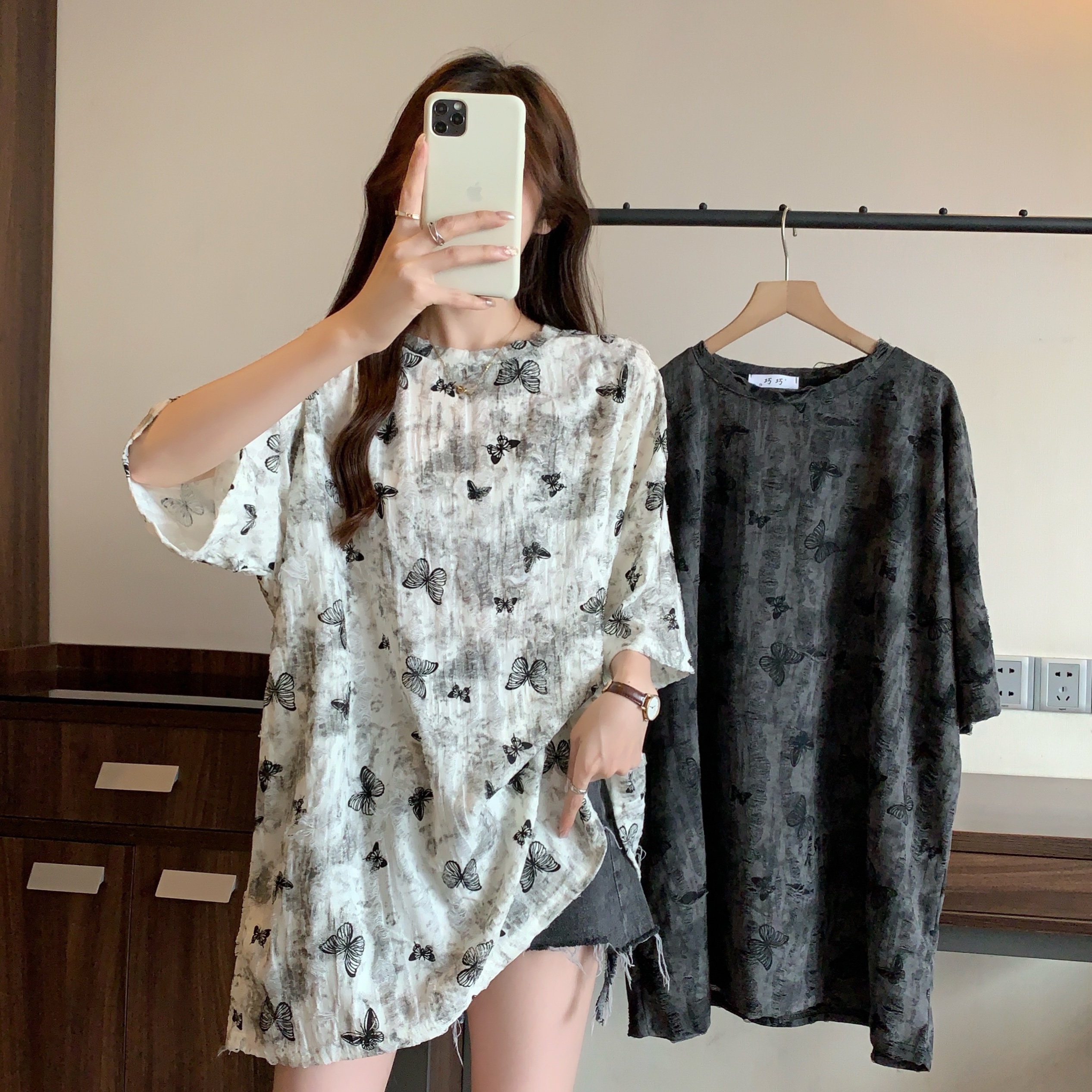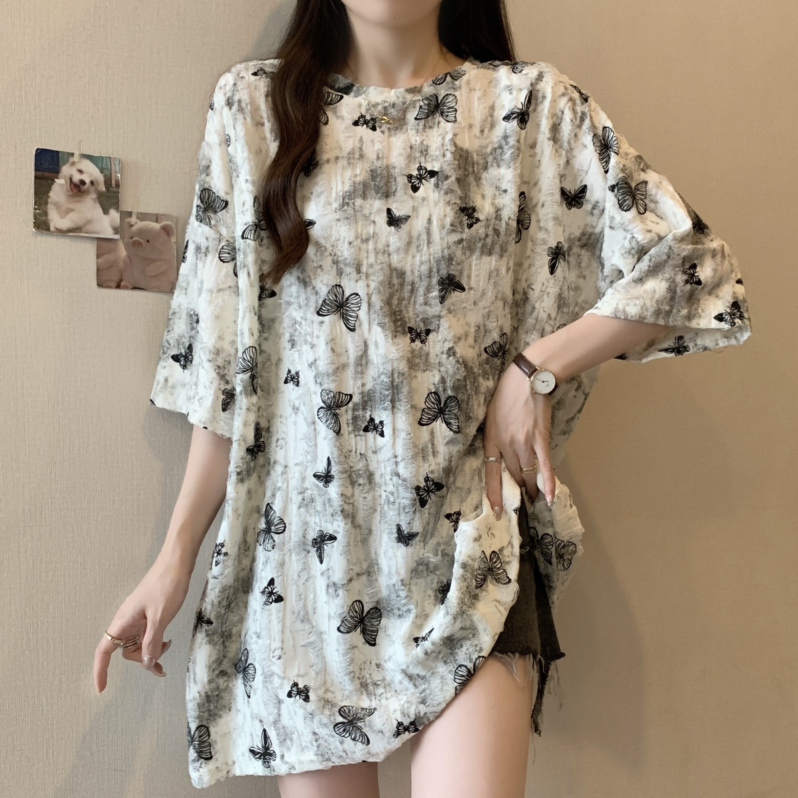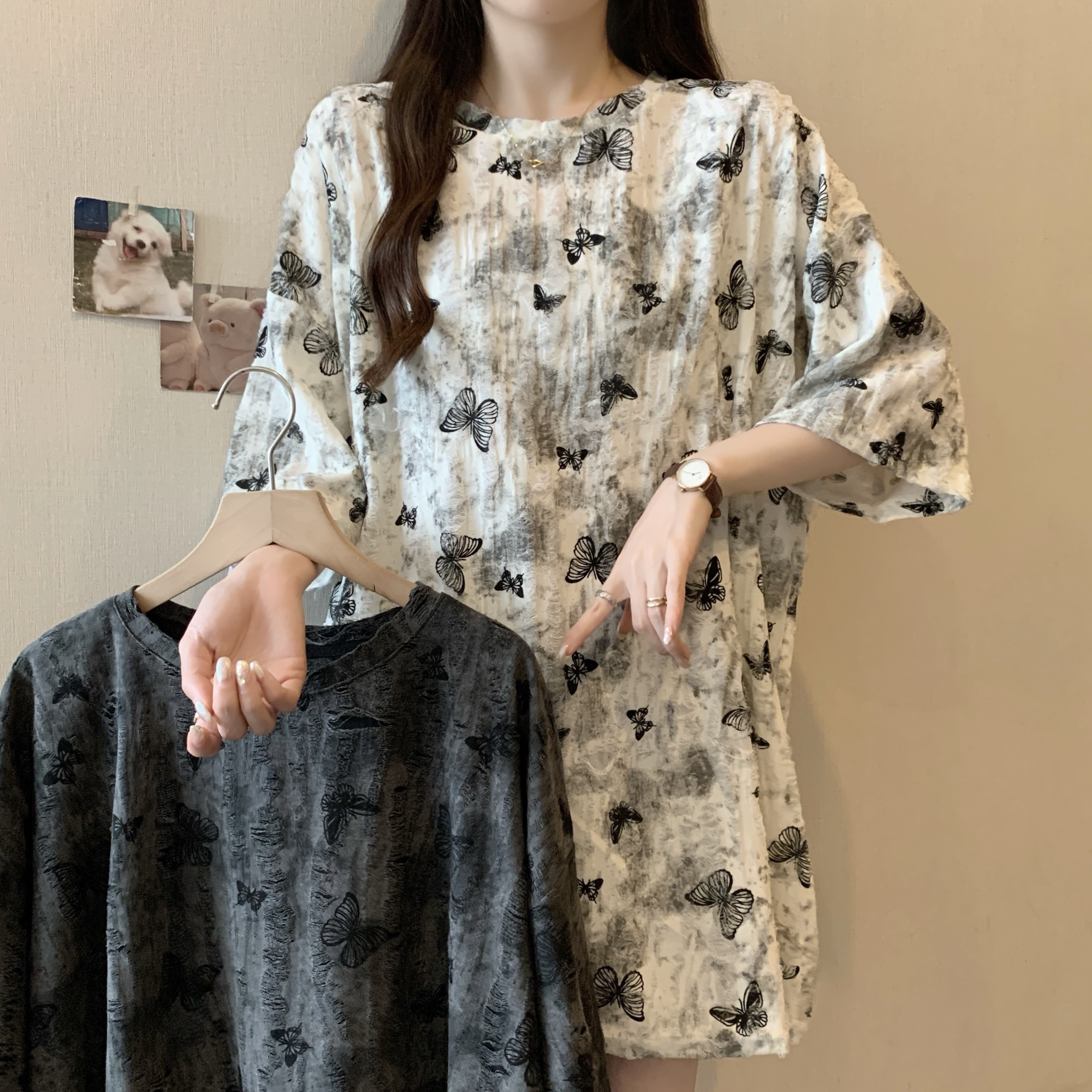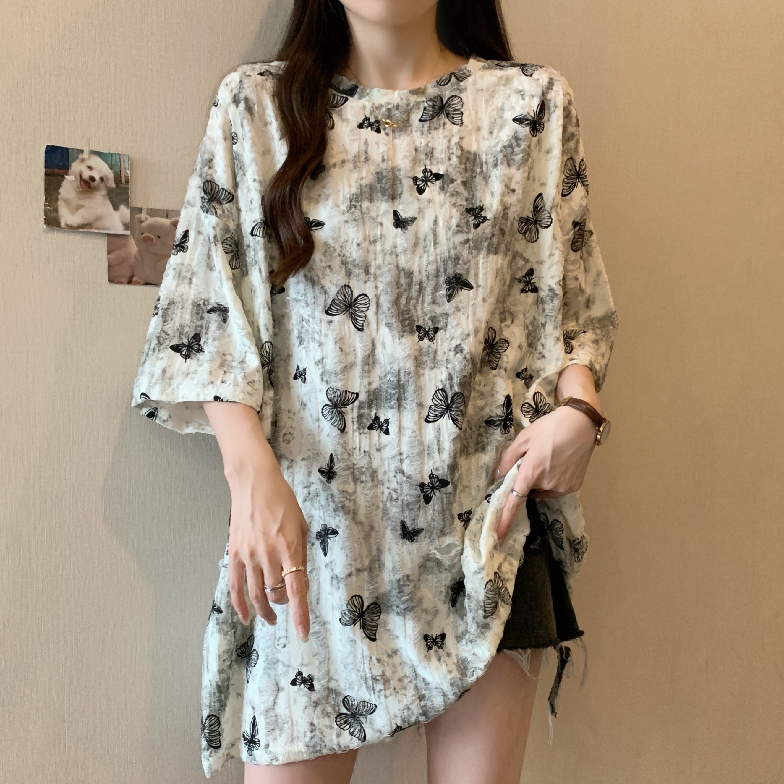 실사 2191# 빅 사이즈 지방 mm 루즈핏 슬림해 보이는 홀치기 염색 중간 길이 반팔 티셔츠 품격 미니멀리즘 다용도 맨위
